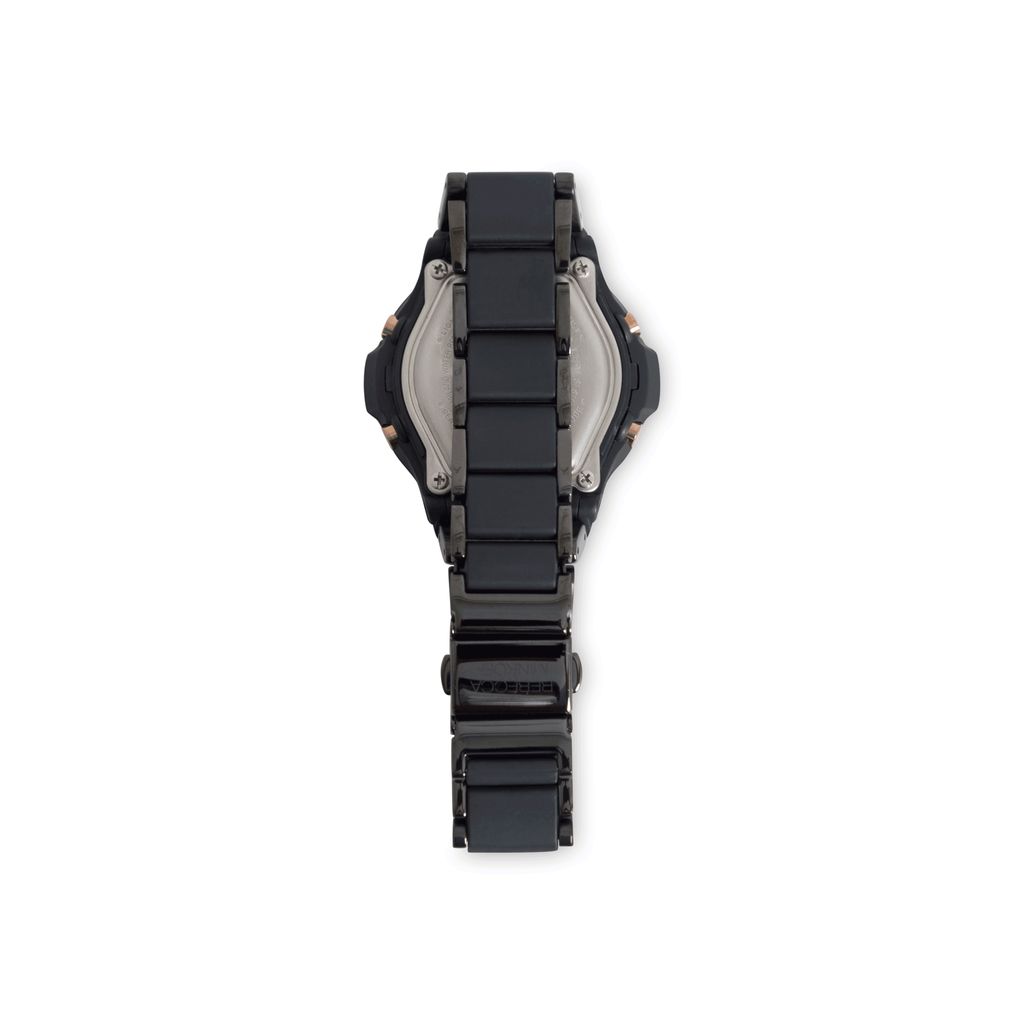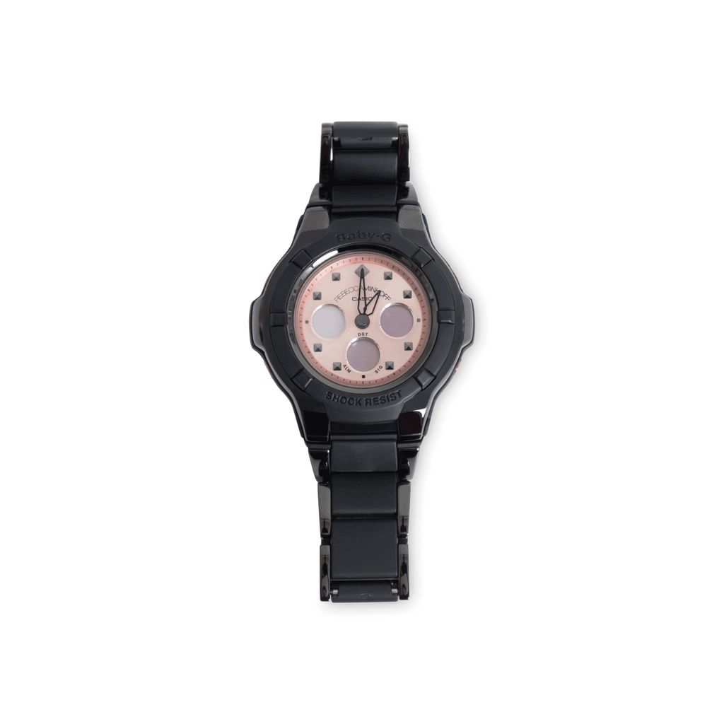 Black traditional watch with pink face, black hands, and Rebecca Minkoff logo. Each time is represented by beautiful black/silver gemstones.