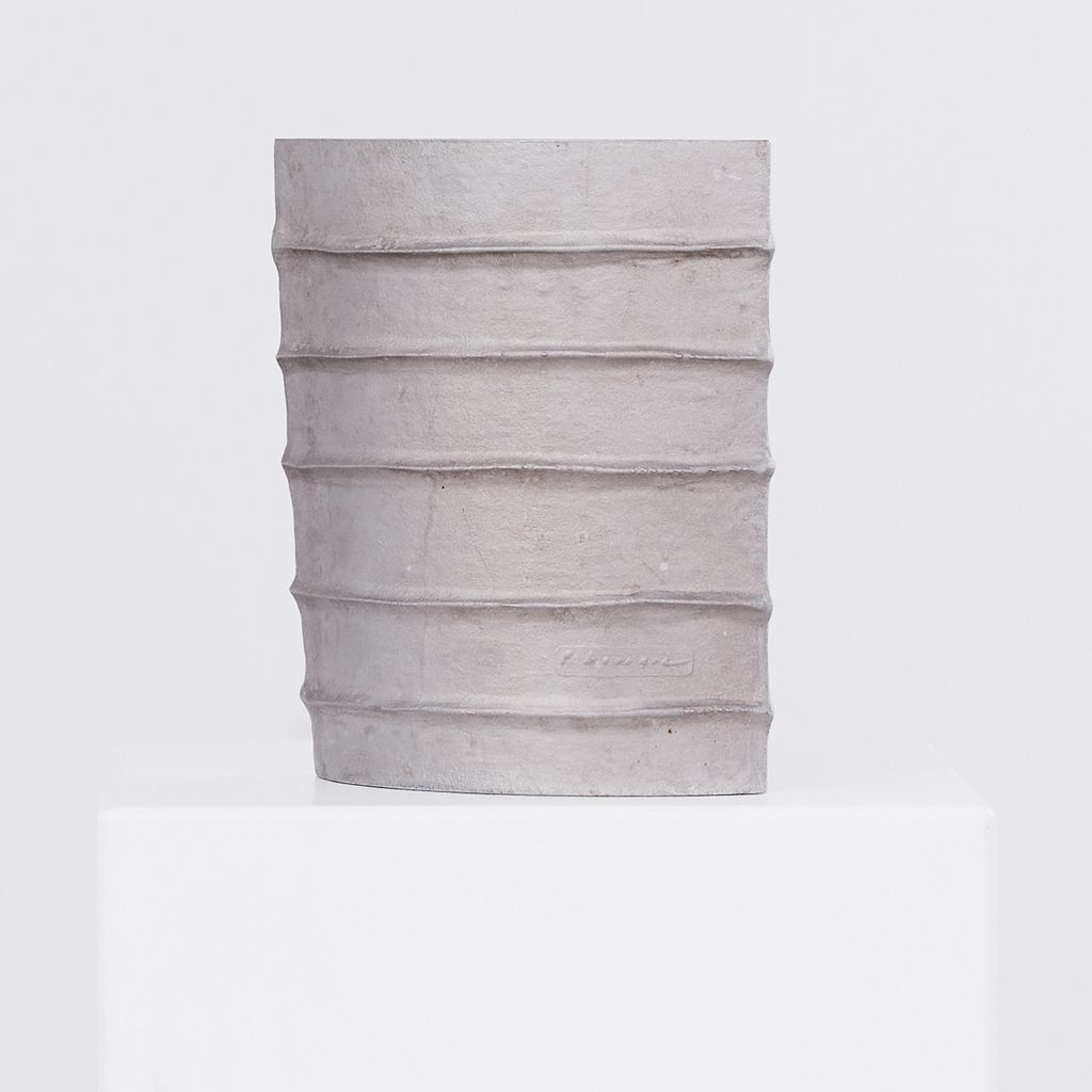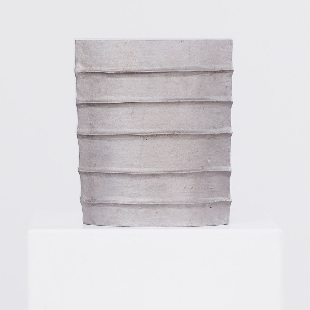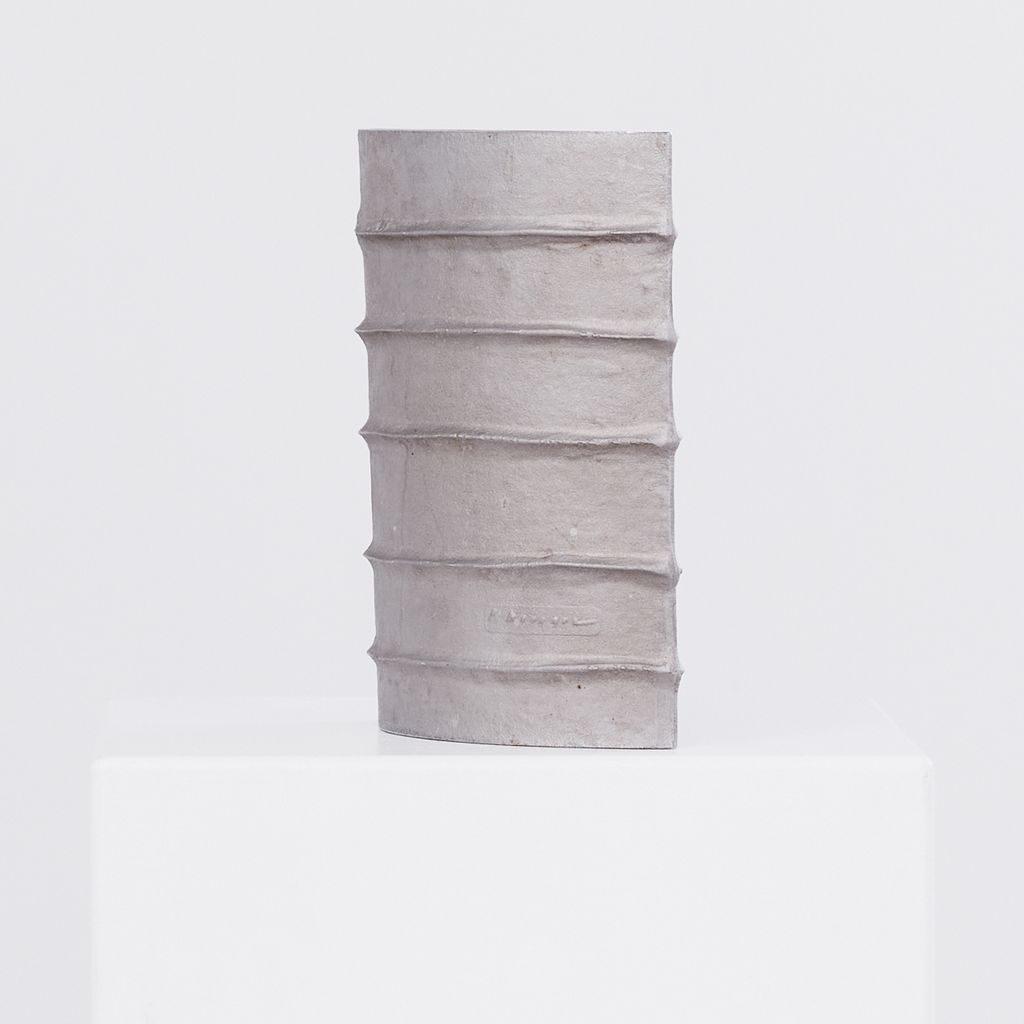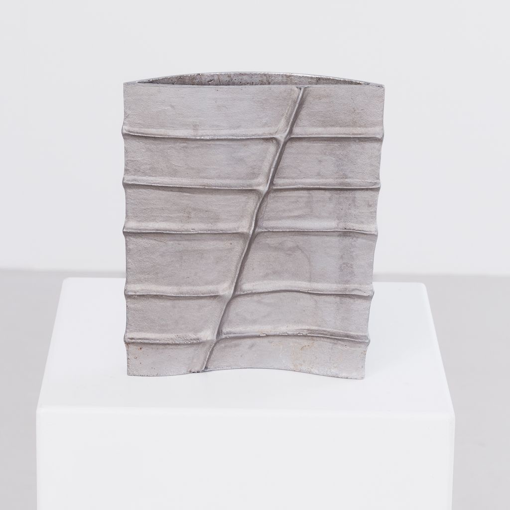 Brutalist cast aluminium vessel by the late French designer Pascal Mourgue (1943–2014). Featuring Mourgue’s signature blend of raw texture, modern geometry, and sculptural presence, the vessel is heavy in weight, with a long narrow aperture, suitable for ikebana display or as a piece on it's own. Artist signature on one side.