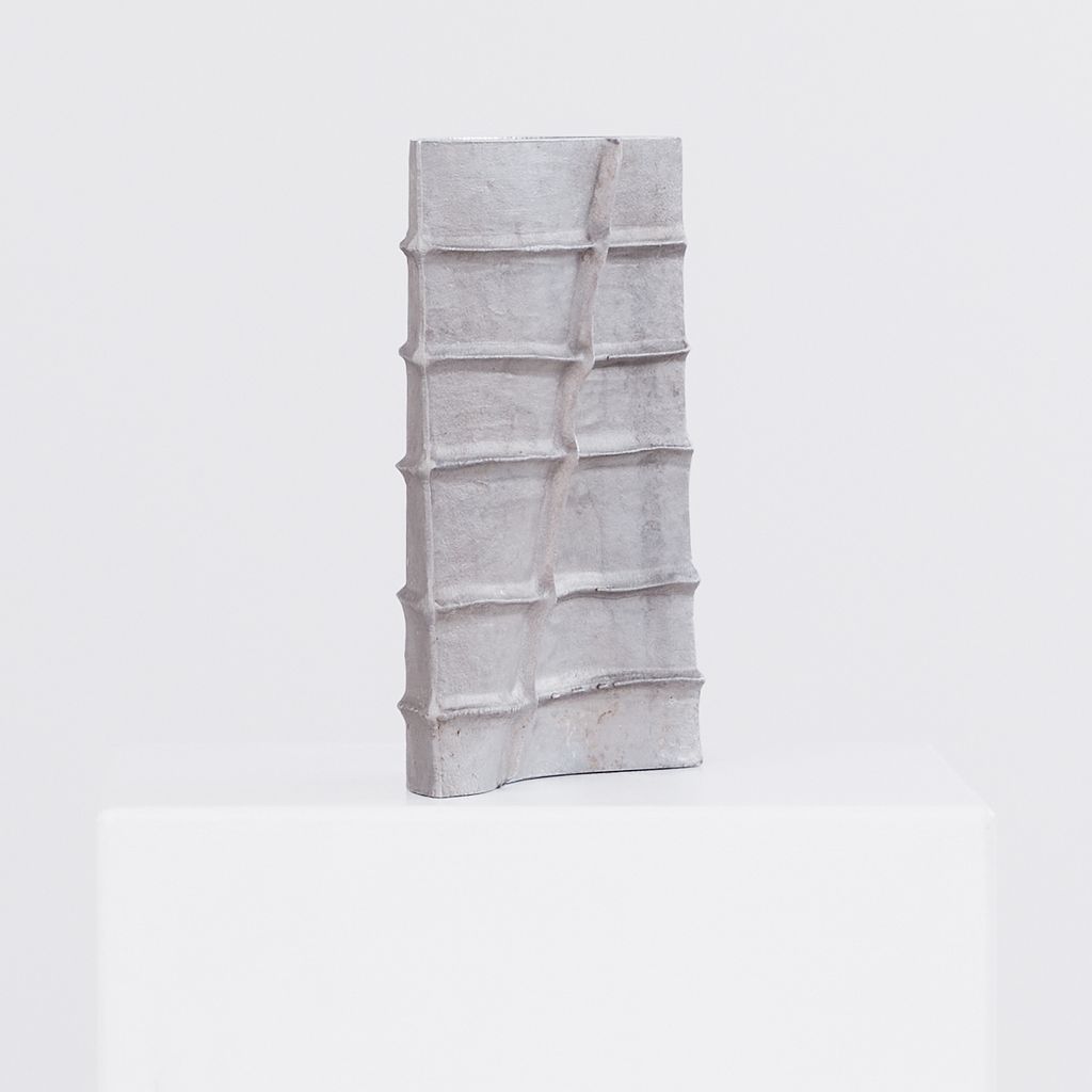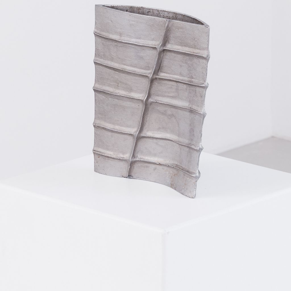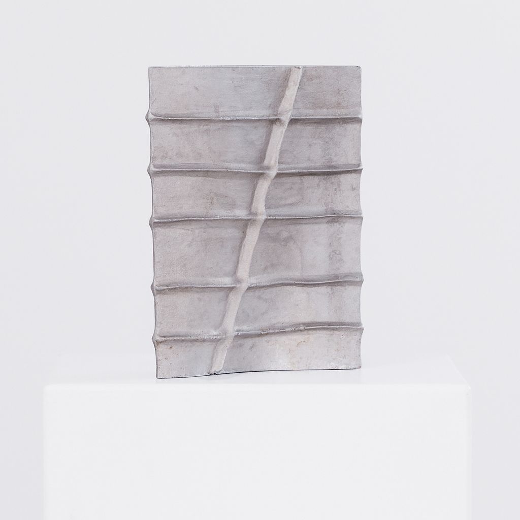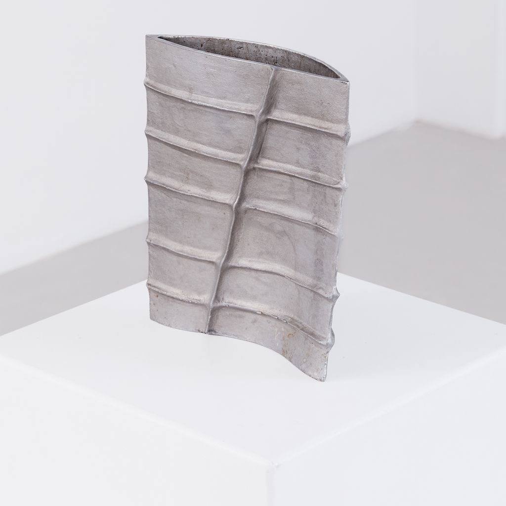 Brutalist cast aluminium vessel by the late French designer Pascal Mourgue (1943–2014). Featuring Mourgue’s signature blend of raw texture, modern geometry, and sculptural presence, the vessel is heavy in weight, with a long narrow aperture, suitable for ikebana display or as a piece on it's own. Artist signature on one side.