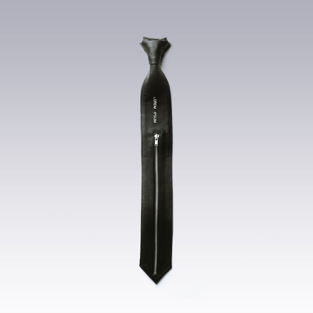 A utilitarian evolution of the classic black tie. Details include a zipper compartment at front, silver foil logo lettering, and a snap closure at the neck Details: - Lambskin leather - Silver logo at front - Single exterior zipper pocket - Snap closure at neck