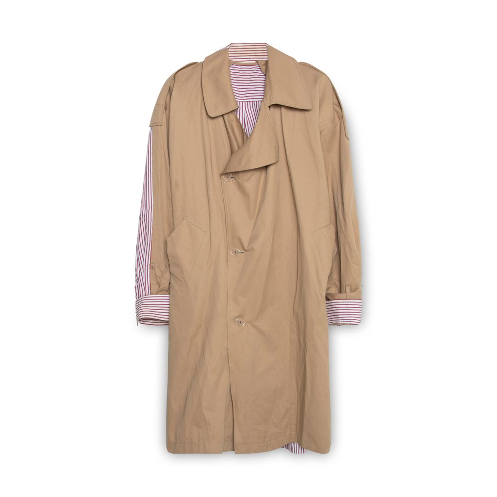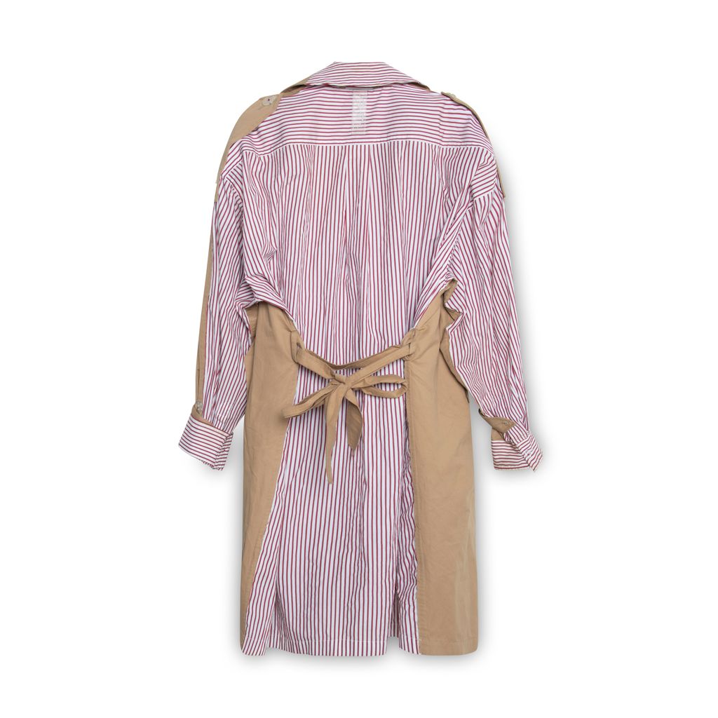 Cekette Red and White Striped Back Panel Trench Coat features striped panel in back, front button closure, and 2 side pockets.