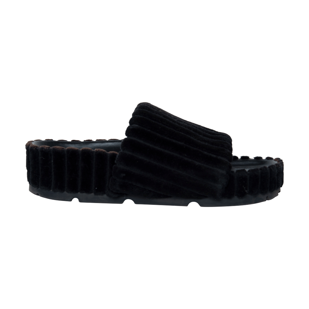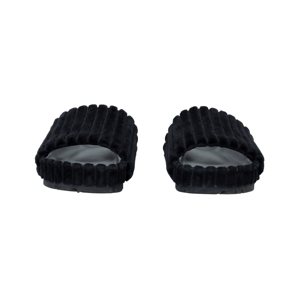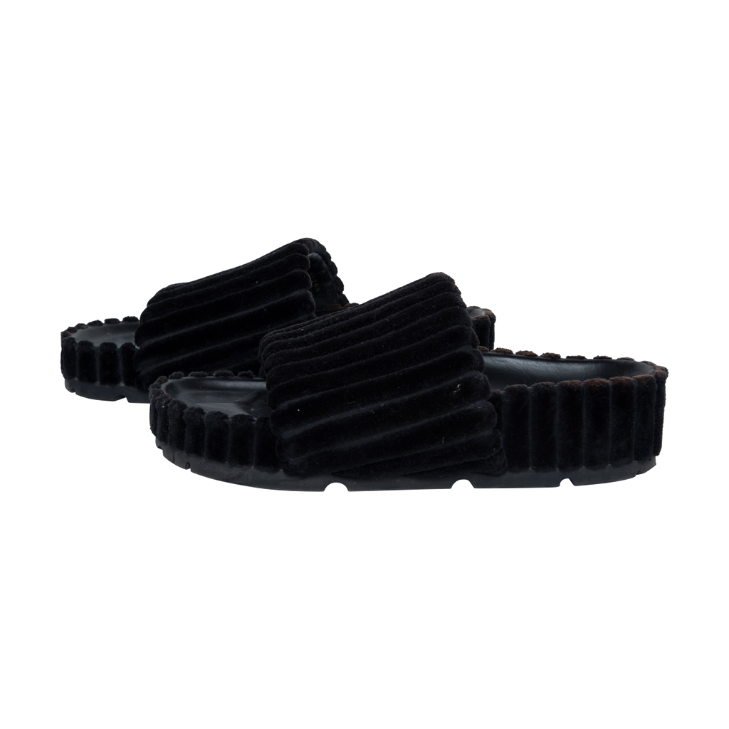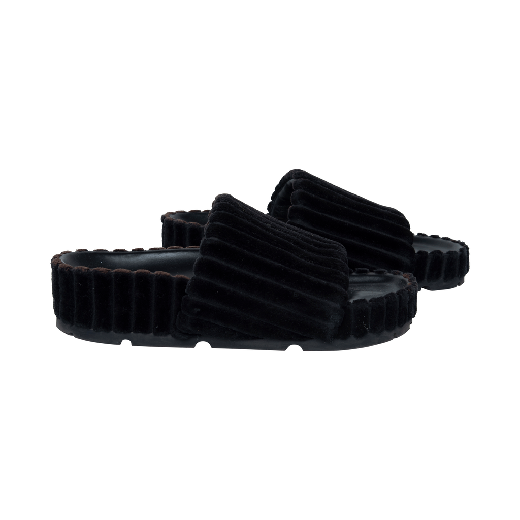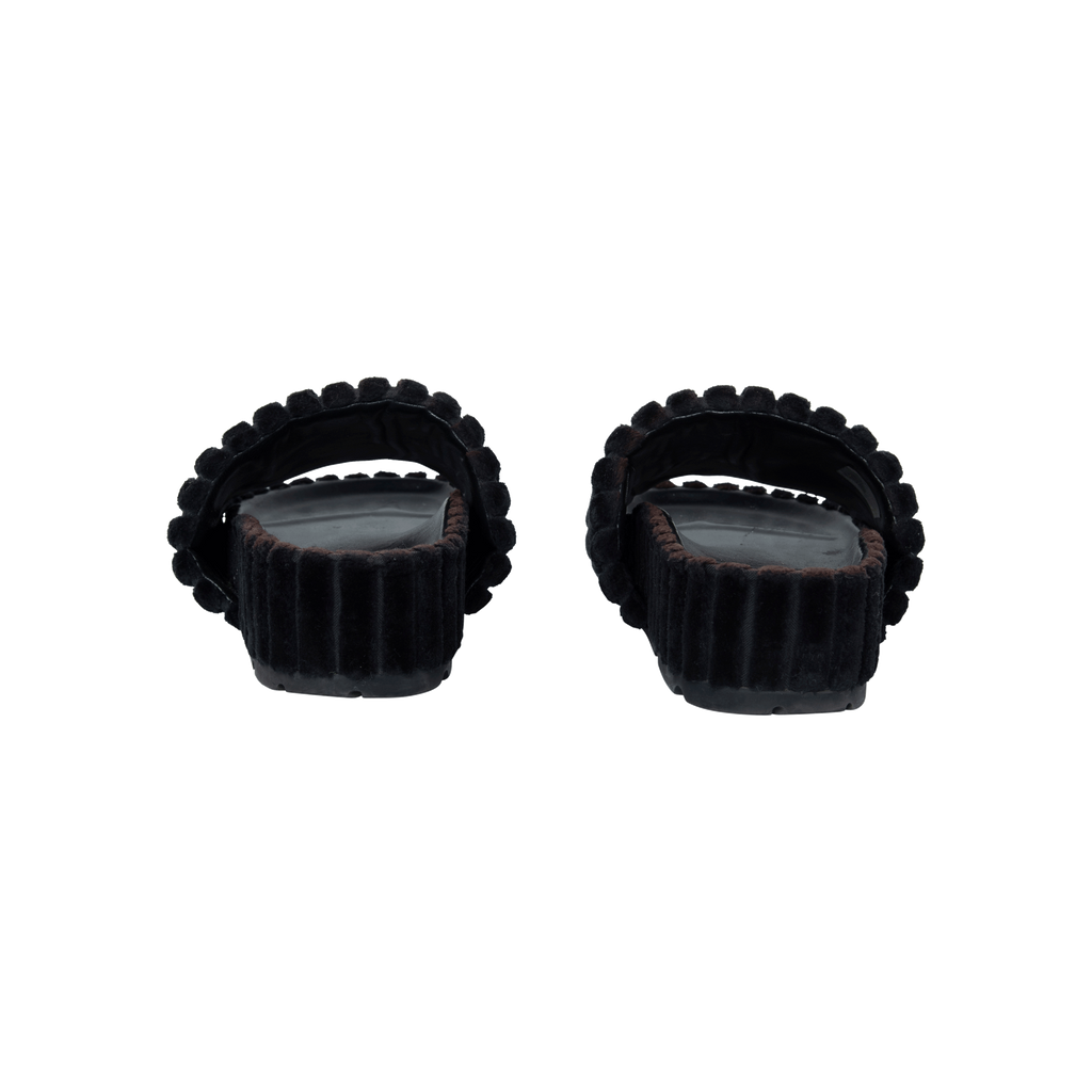 Céline Black Velvet Slides features platform and puffed black leather design.