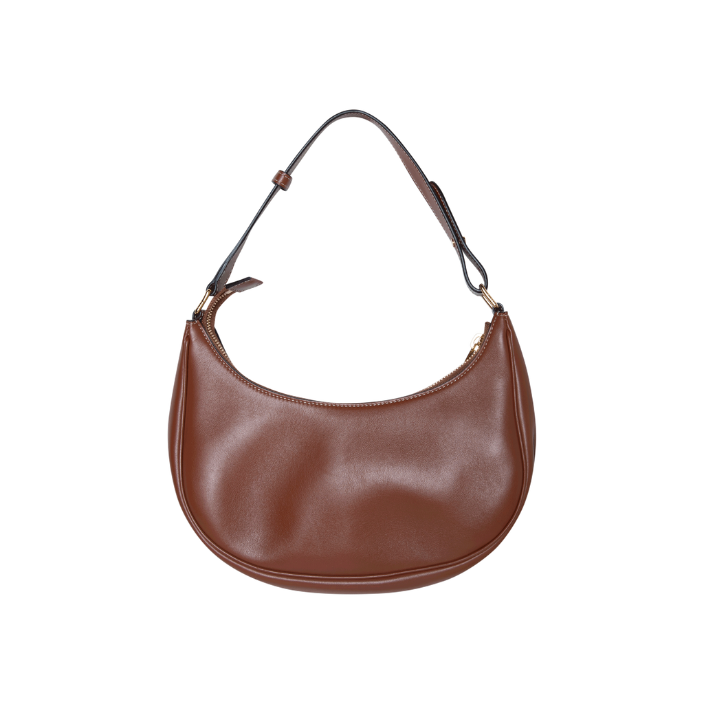 Celine Ava Hobo in Brown features gold tone hardware, single adjustable shoulder strap, suede lining, single interior pocket, and zip closure at top.