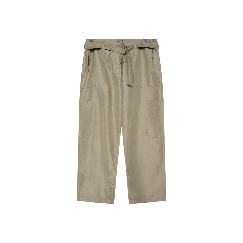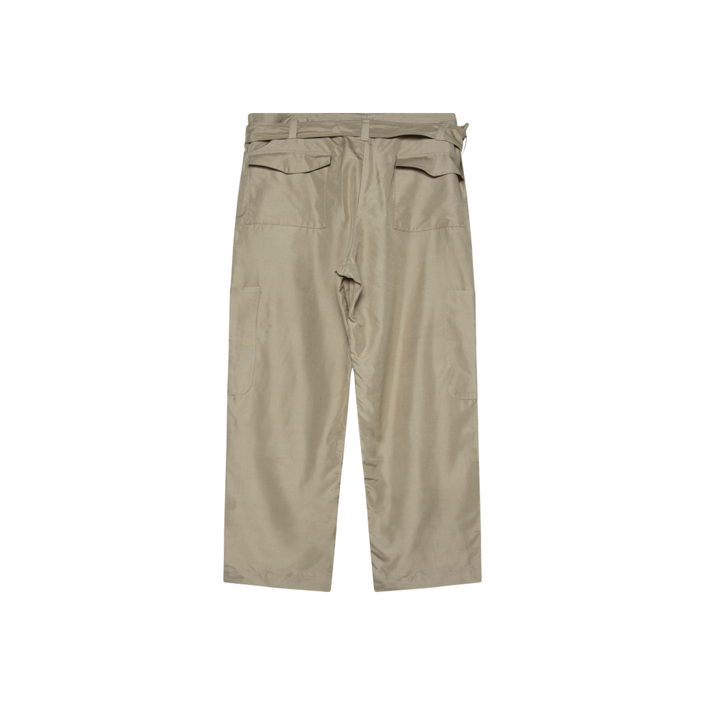 Céline Green Belted Mulberry Silk Cargos features detachable belt, adjustable tie in waistband, 6 pocket styling, hidden front zip closure, and relaxed fit.