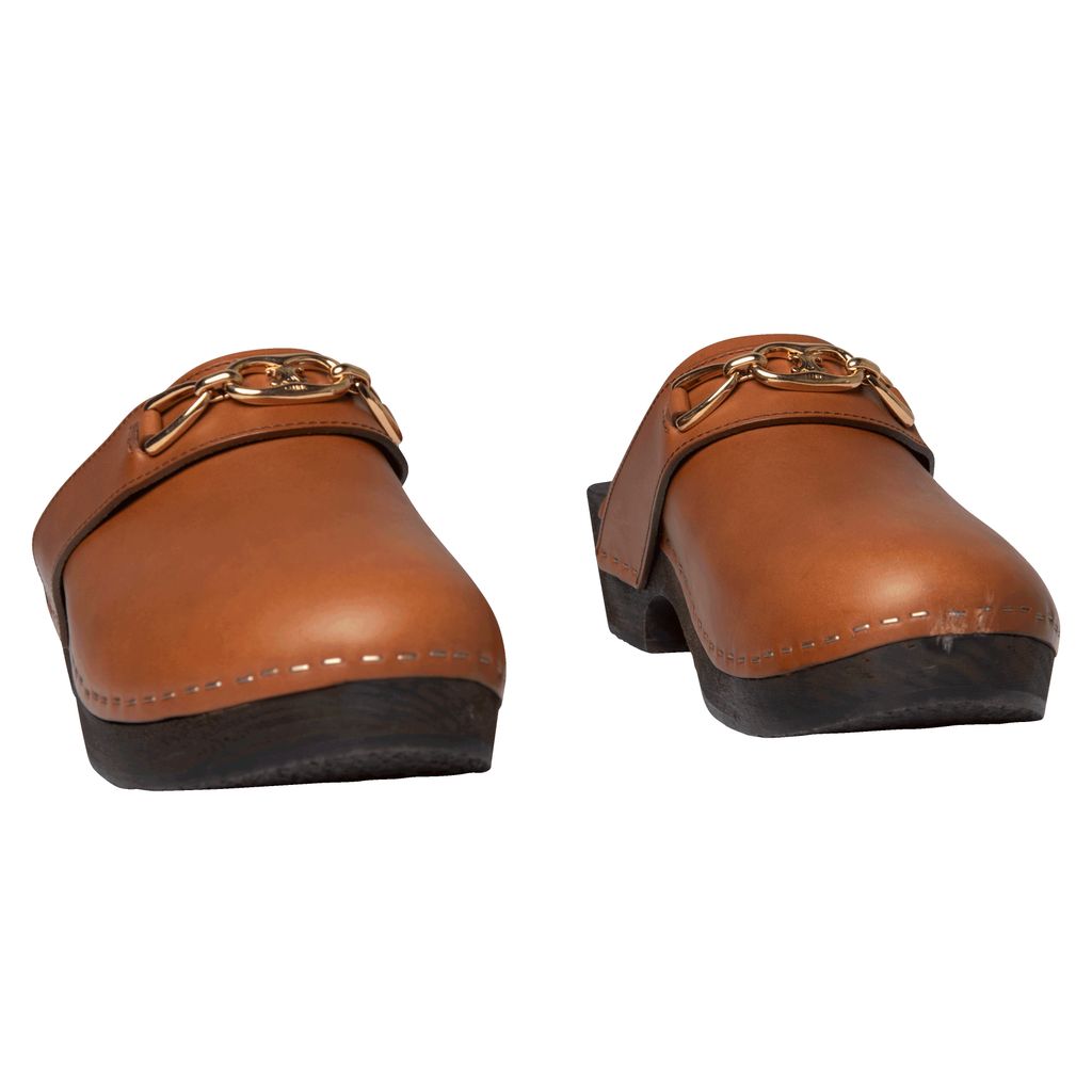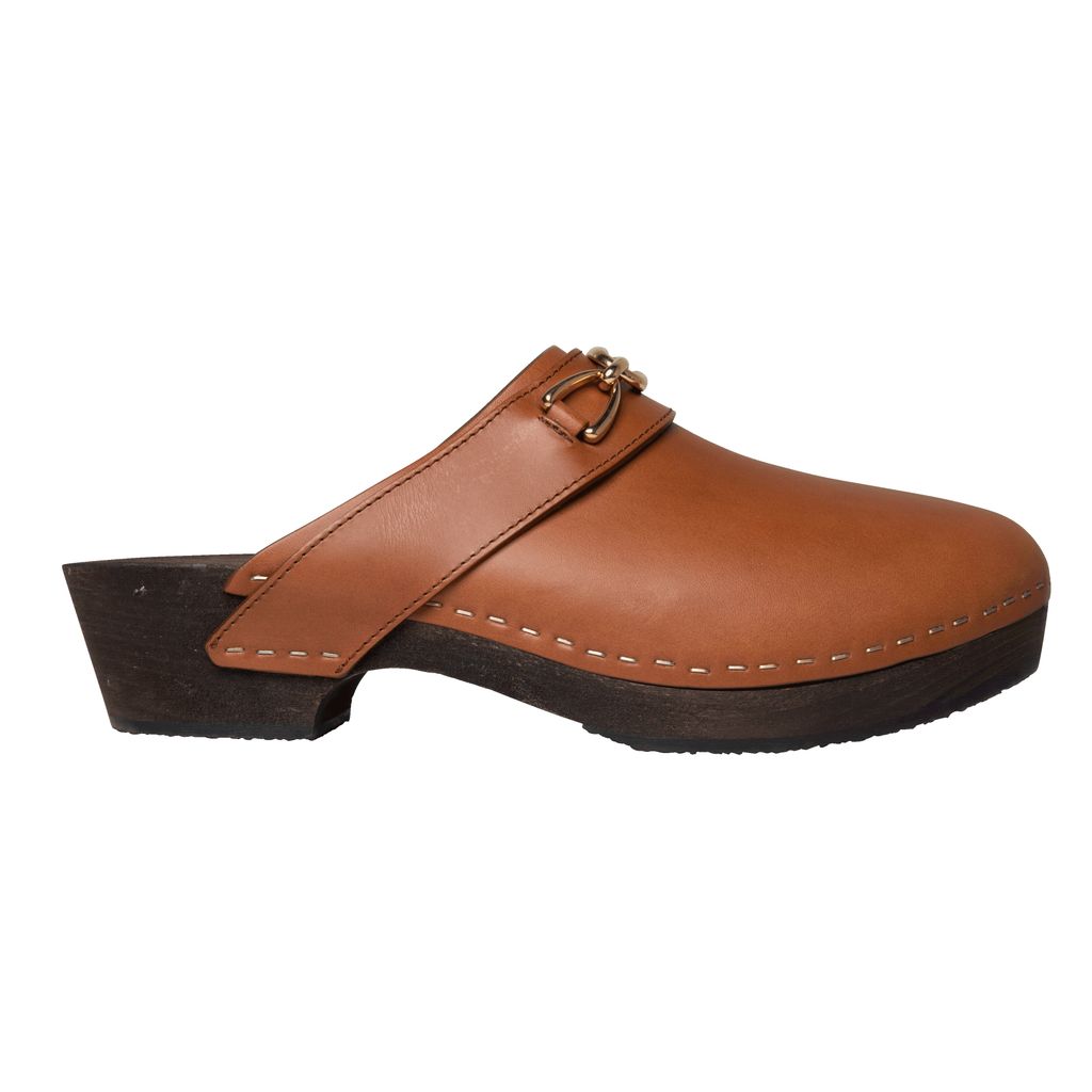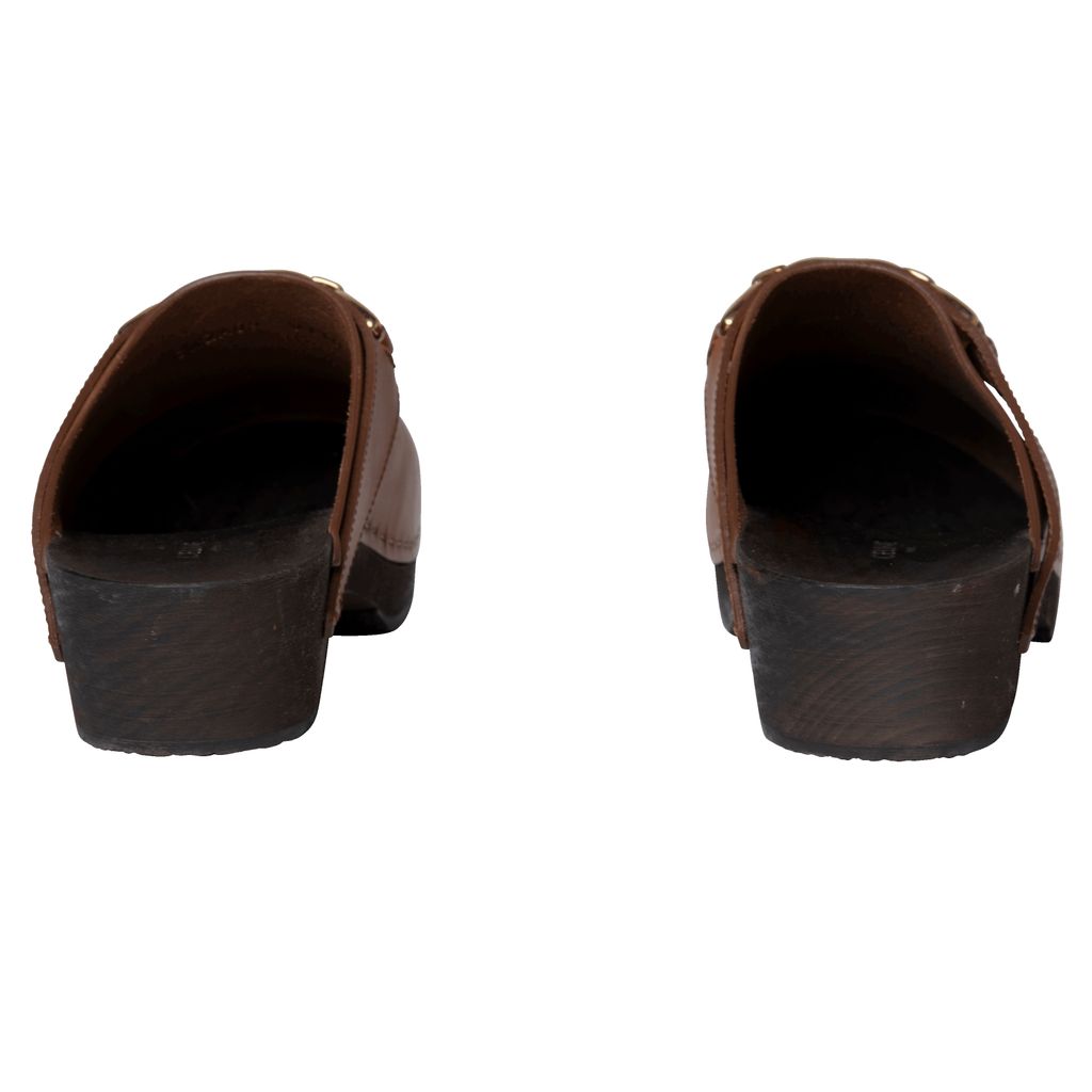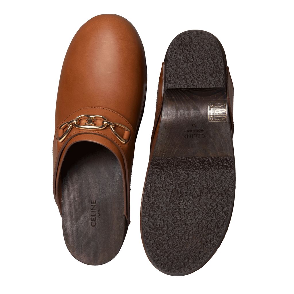 Celine Les Bois Calfskin Clog features lightweight basswood heel, rounded toe shape, and wooden insole.