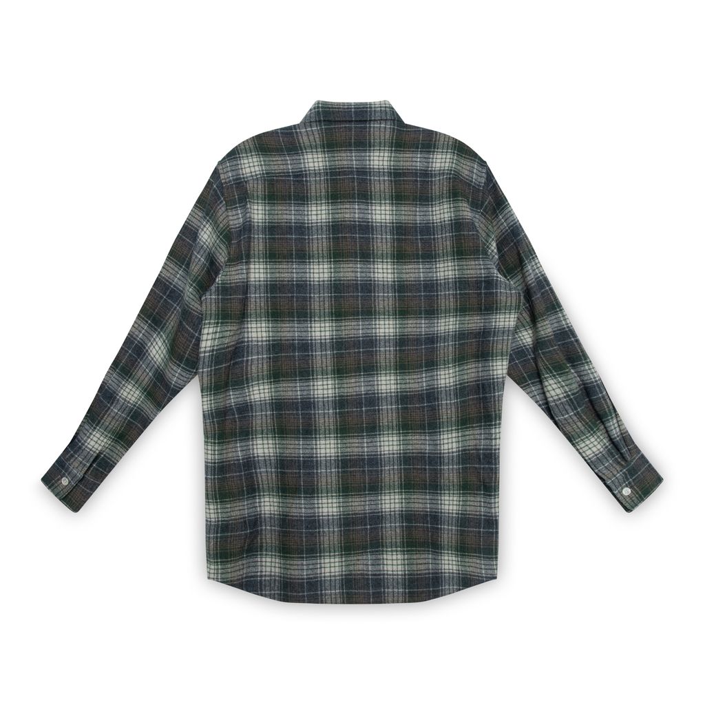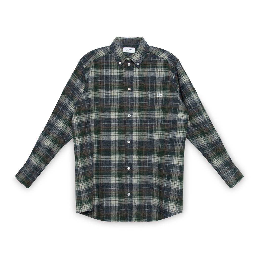 Celine oversized Trapper wool flannel shirt features single chest pocket with triomphe embroidered, classic collar, and button closure at front.