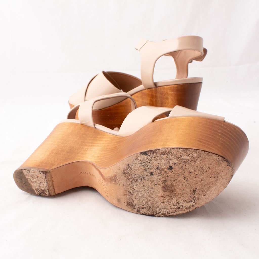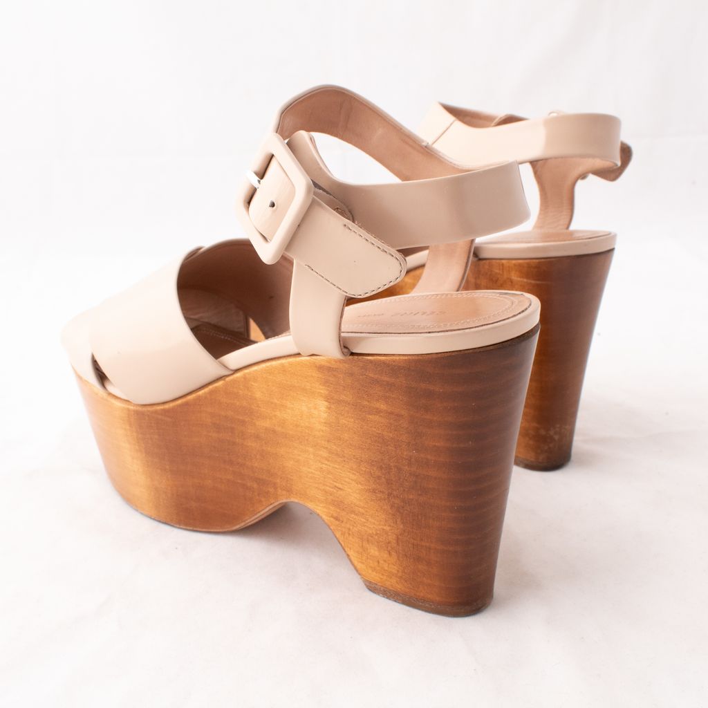 In fair condition, iconic platform clog sandal from Celine. Features a peep toe, wooden platform, a buckled ankle strap, high heel, and leather soles.