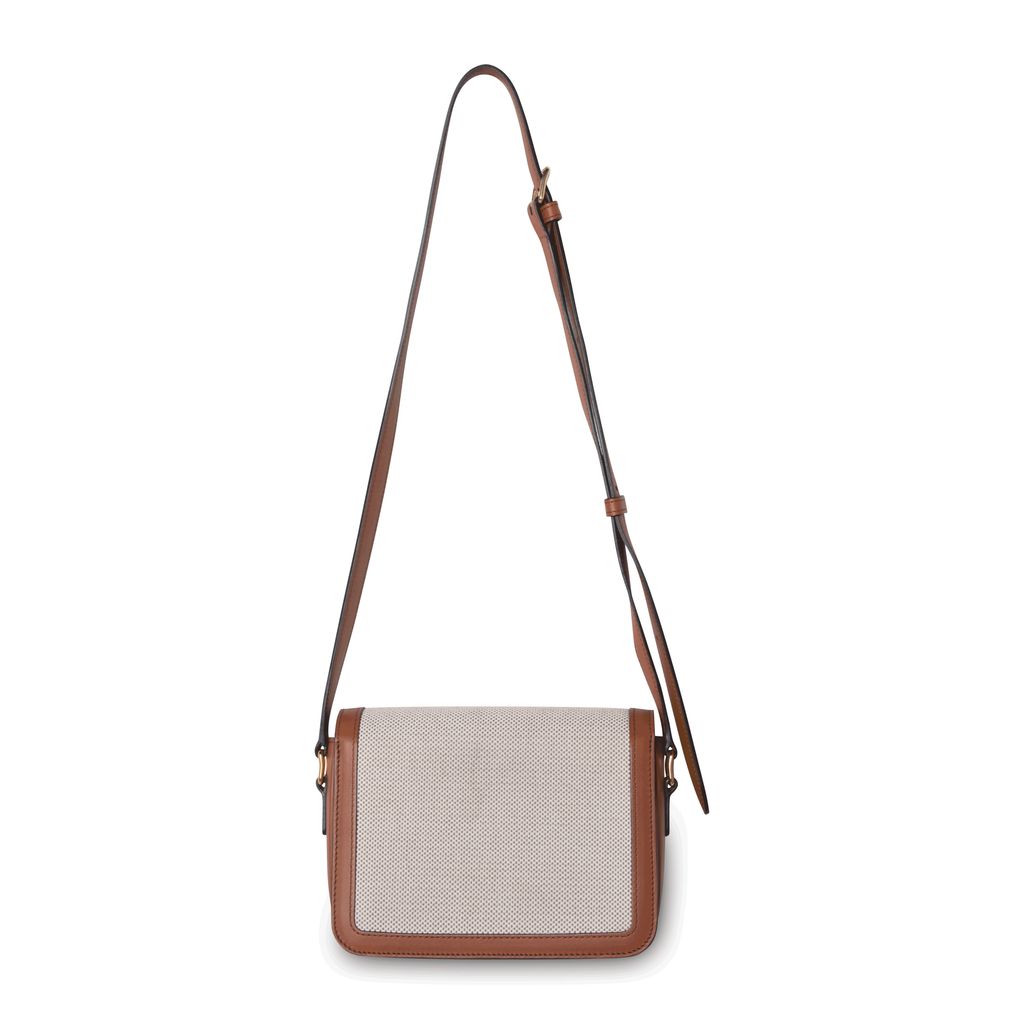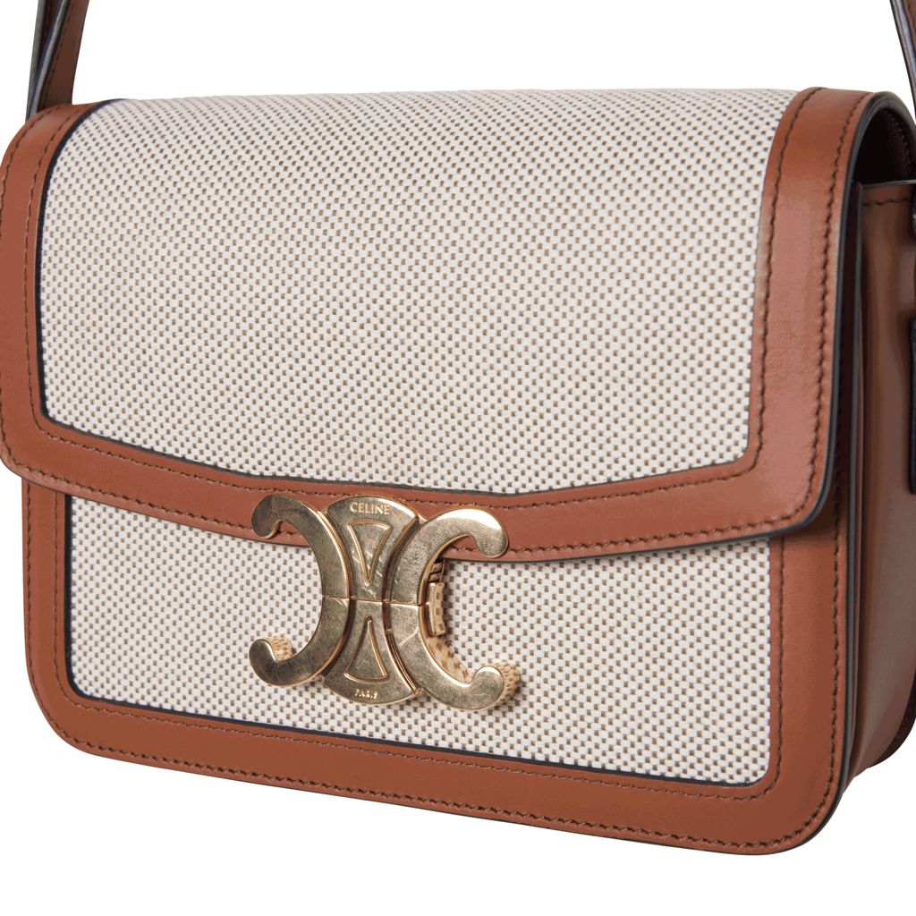 Celine Triomphe Shoulder Bag in Canvas and Leather features logo clutch enclosure and brown shoulder strap.