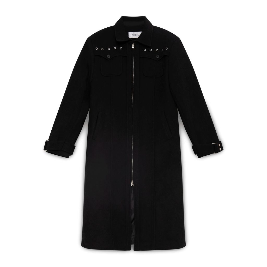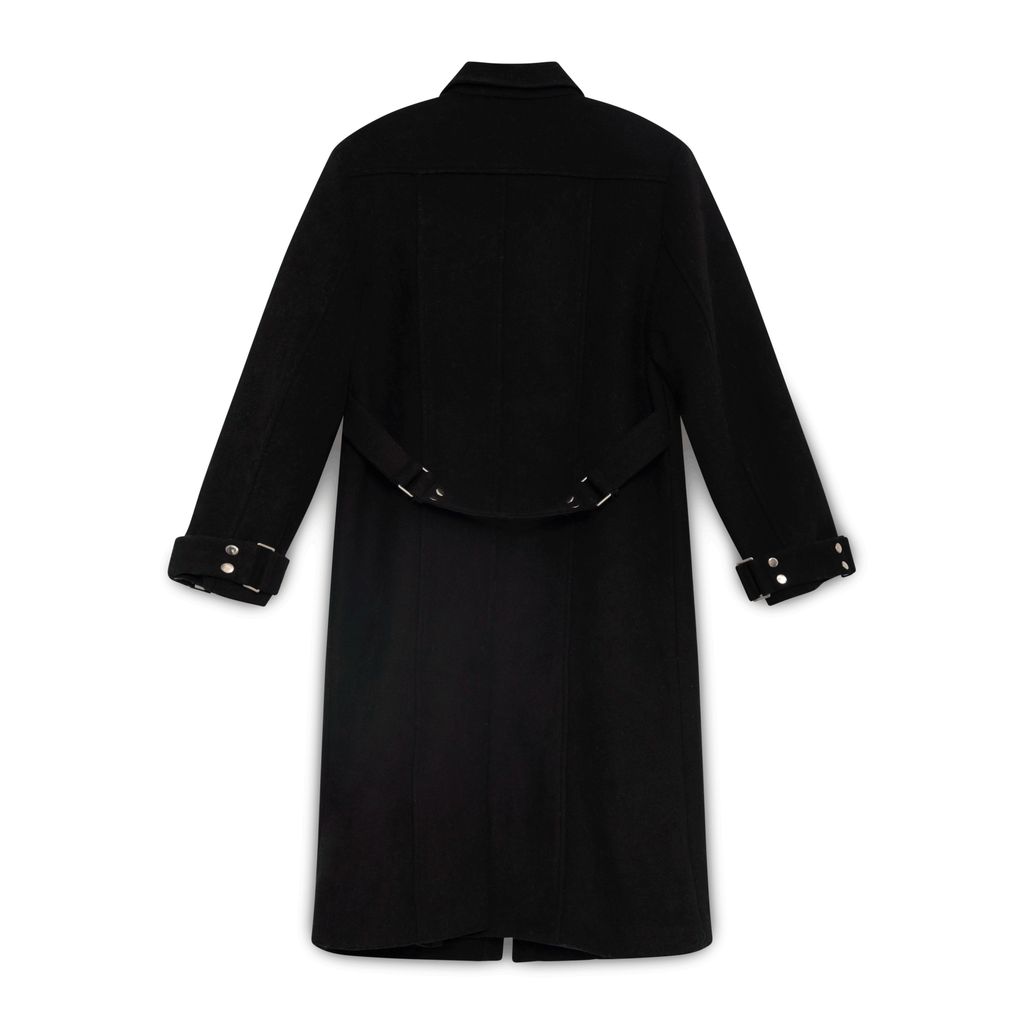 Cerric Zip Up Wool Trench Coat features zip closure, chest pockets, side pockets, belt detail along back.