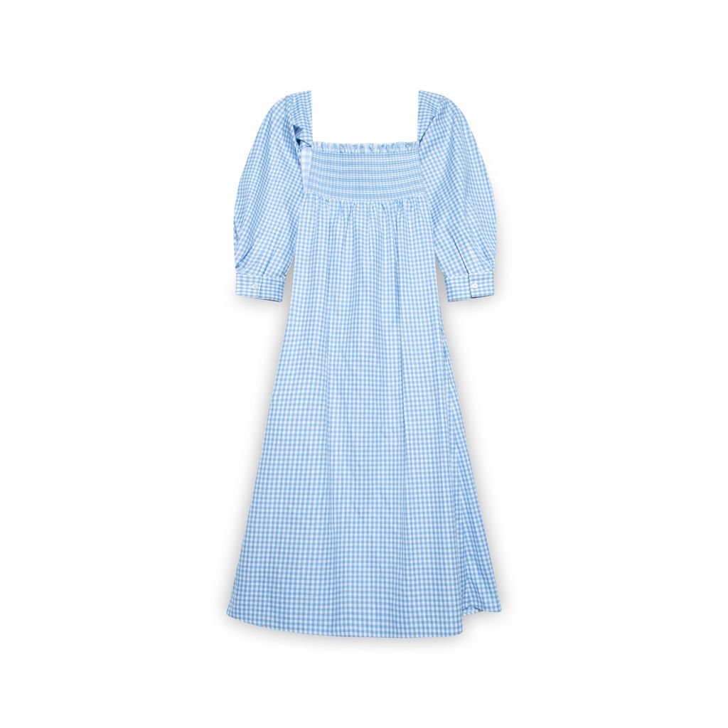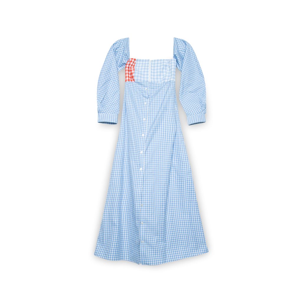 CF. Goldman Blue Gingham Midi Dress features square neckline, balloon sleeves, ruched back bodice, button up front closure with hook and eye closure in chest, and red gingham patch on chest.