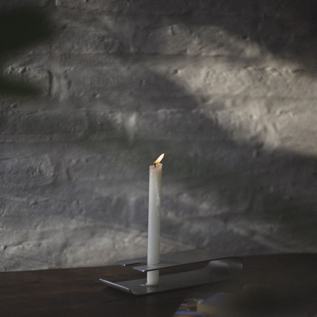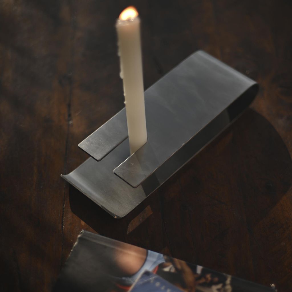 The WCH001-07 Candleholder is handcrafted from a single stainless steel sheet, folded 180 degrees into a seamless form. A precise cut allows a candle to stand securely, merging function with sculptural design. The polished surface interacts with light, reflecting the flickering flame and enhancing the ambiance. With its refined geometry and reflective properties, this piece transforms both light and space, serving as both a practical candleholder and a striking visual element.