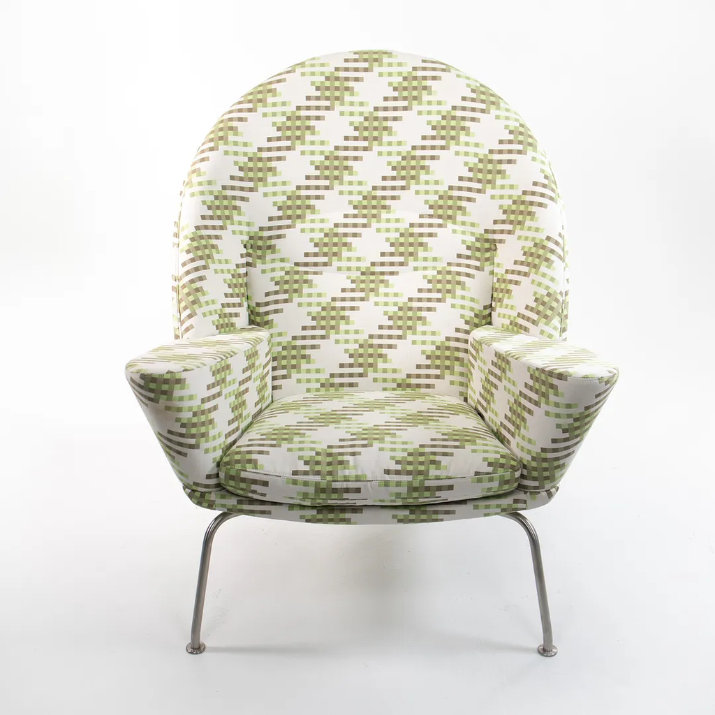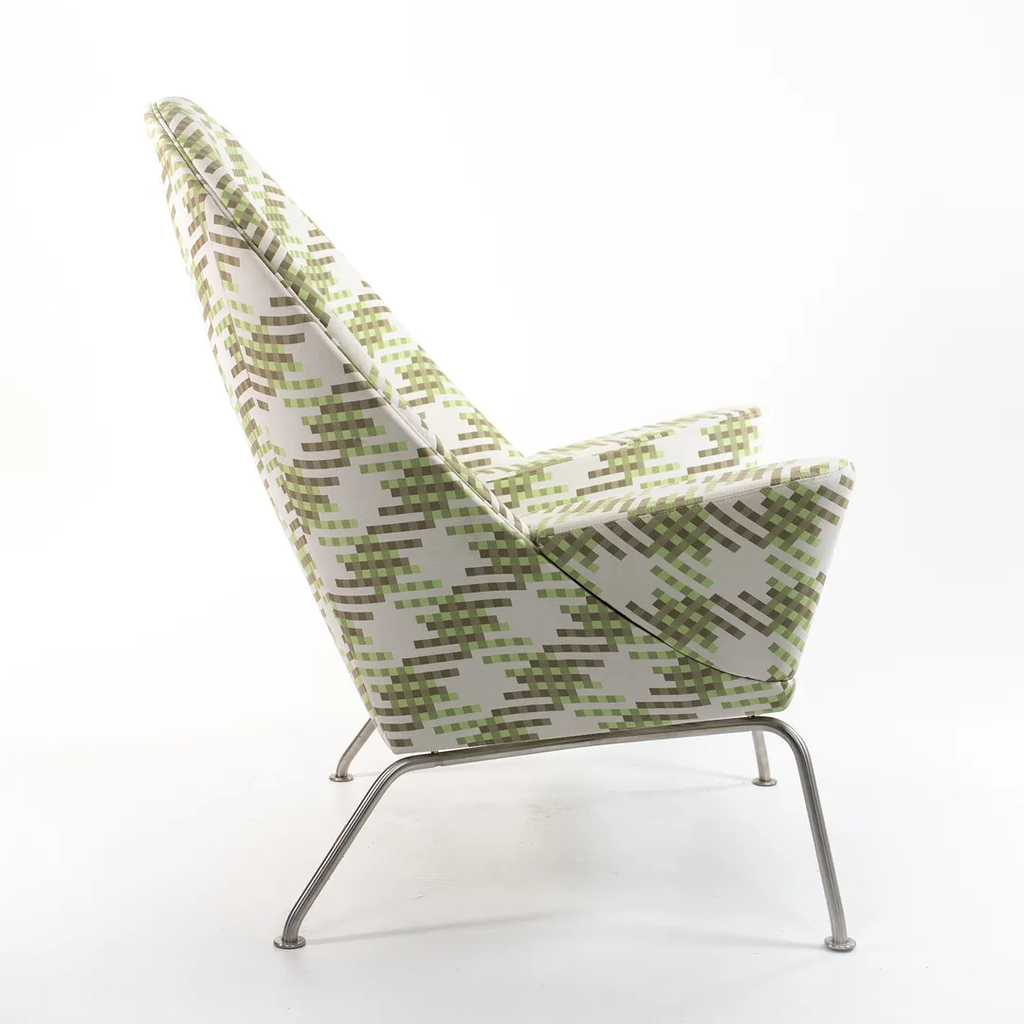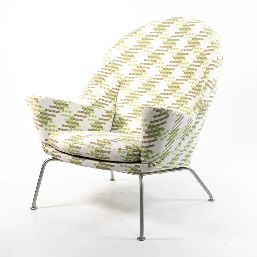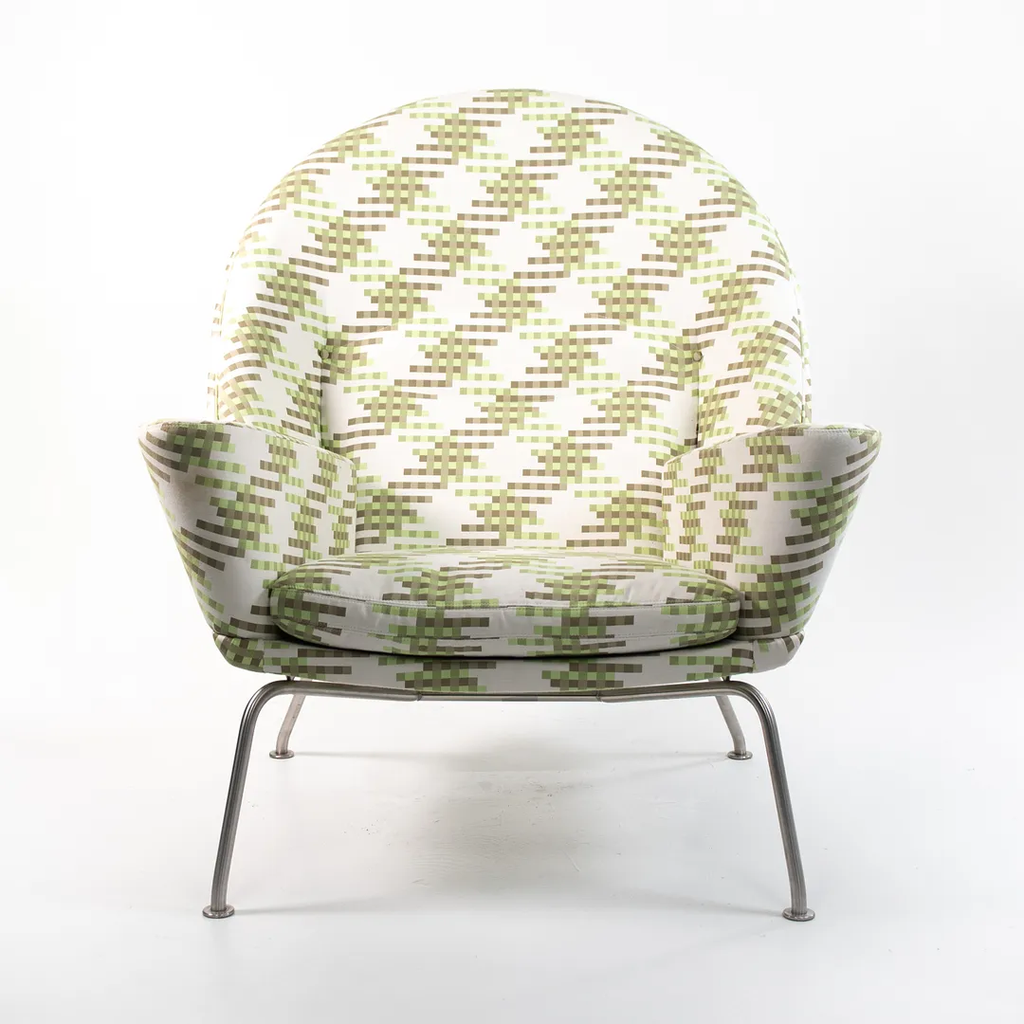 Listed for sale is a Oculus Lounge Chair designed by Hans Wegner, produced by Carl Hansen & Son in Denmark. The chair is made with a stainless steel frame and green patterned fabric. This chair dates to circa 2018 and is guaranteed as authentic. The chair has never been put into use within a home or office setting, however, shows some very minor wear from storage and transportation to our warehouse. The front right side of the chair has some soiling as shown in the photos, which we are fairly confident could be professionally cleaned and removed prior to shipping if desired. It is otherwise in fairly excellent condition with only minimal wear otherwise. See photos. The last photo shows a minor imperfection on the fabric, which could also likely be trimmed easily. The fabric was COM (customer's own material) and was a custom order through Carl Hansen, likely through an interior design firm.