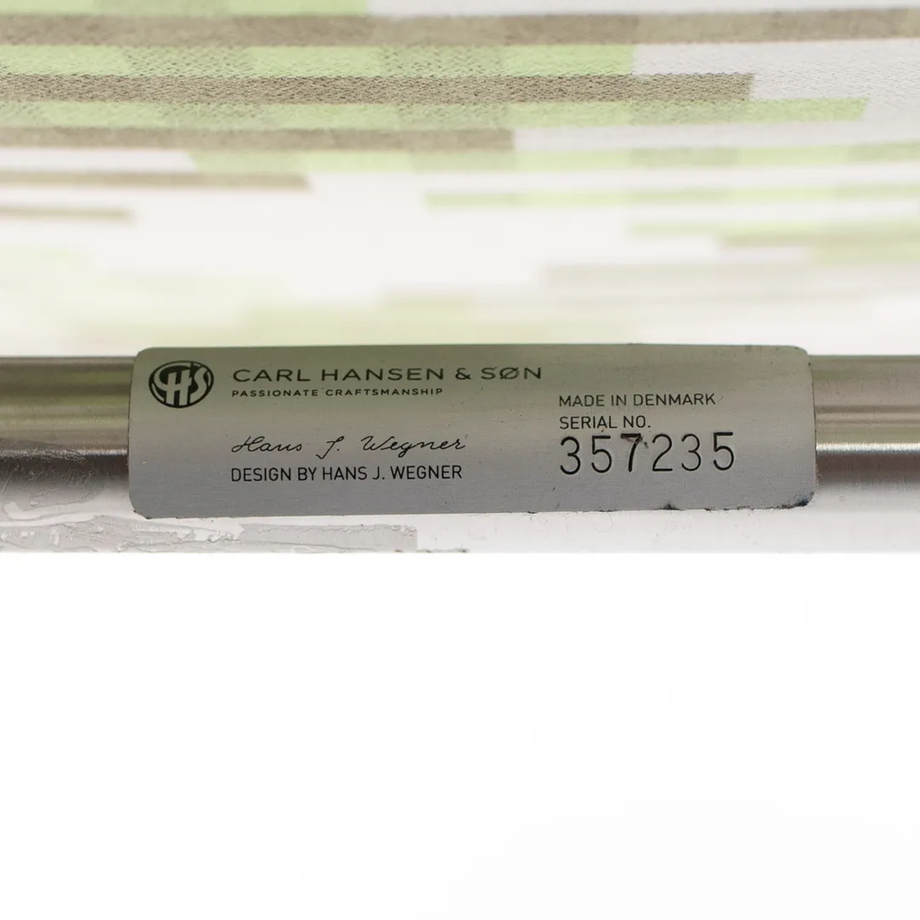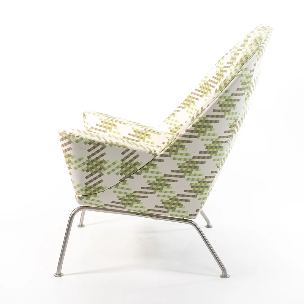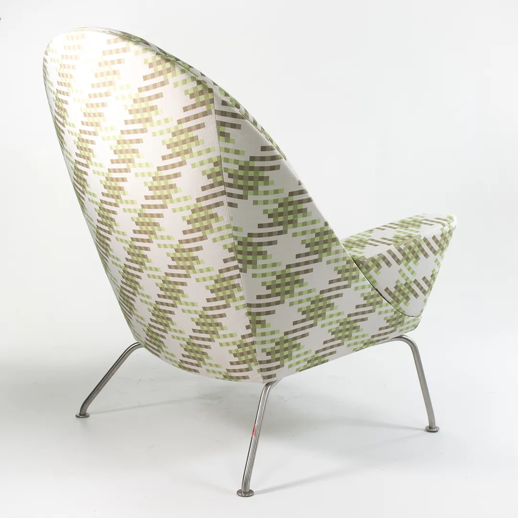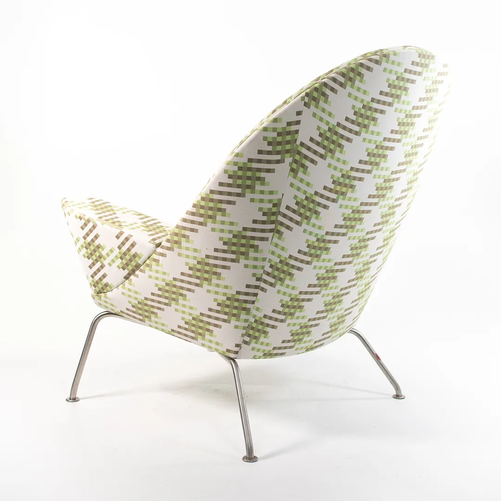 Listed for sale is a Oculus Lounge Chair designed by Hans Wegner, produced by Carl Hansen & Son in Denmark. The chair is made with a stainless steel frame and green patterned fabric. This chair dates to circa 2018 and is guaranteed as authentic. The chair has never been put into use within a home or office setting, however, shows some very minor wear from storage and transportation to our warehouse. The front right side of the chair has some soiling as shown in the photos, which we are fairly confident could be professionally cleaned and removed prior to shipping if desired. It is otherwise in fairly excellent condition with only minimal wear otherwise. See photos. The last photo shows a minor imperfection on the fabric, which could also likely be trimmed easily. The fabric was COM (customer's own material) and was a custom order through Carl Hansen, likely through an interior design firm.