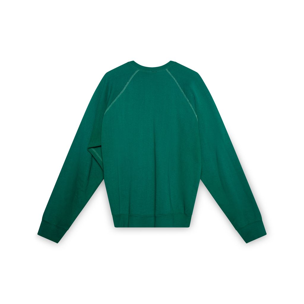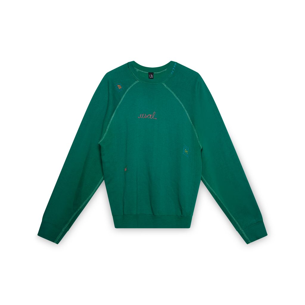 Chainstitch Sweater in Green features logo chainstitch on chest and chainstitch embroidered designs on front.