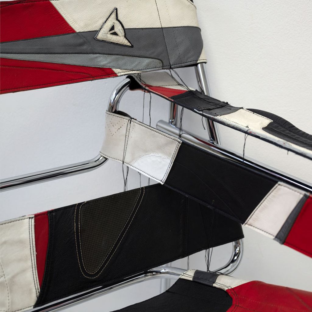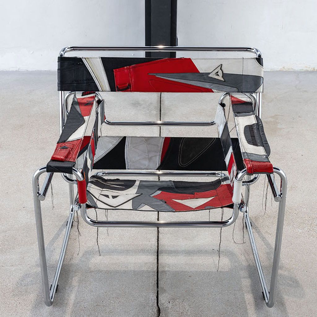 A reinterpretation of the iconic Wassily Chair designed by Marcel Breuer in 1925, "Chaise 01" presents a unique and unrepeatable composition made from deconstructed motorbike leather jackets, blurring the lines between object and sculpture.