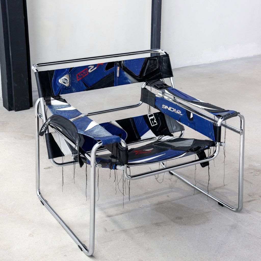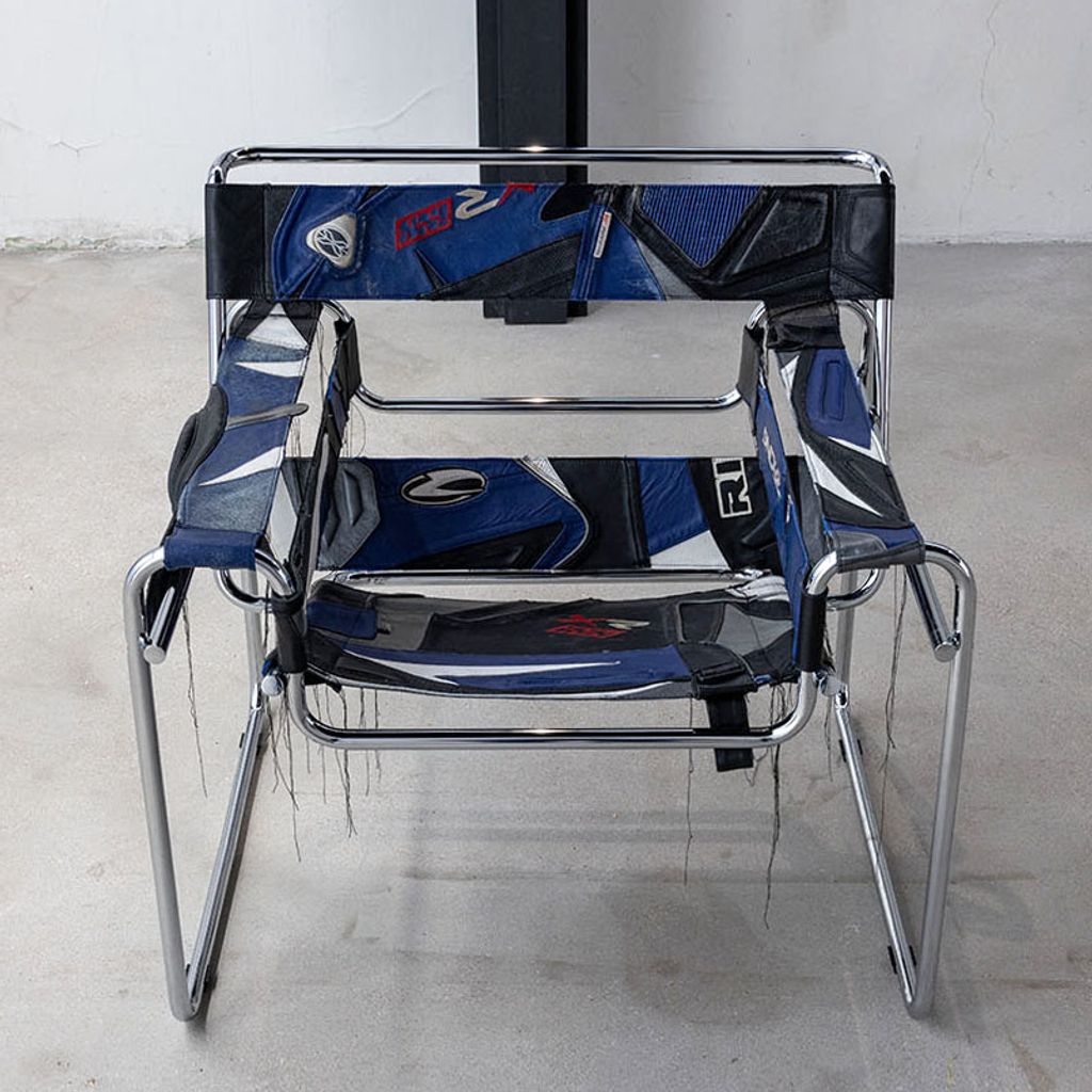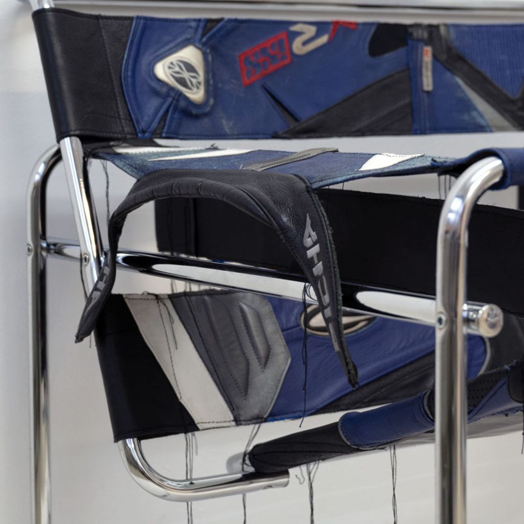 A reinterpretation of the iconic Wassily Chair designed by Marcel Breuer in 1925, "Chaise 02" presents a unique and unrepeatable composition made from deconstructed motorbike leather jackets, blurring the lines between object and sculpture.