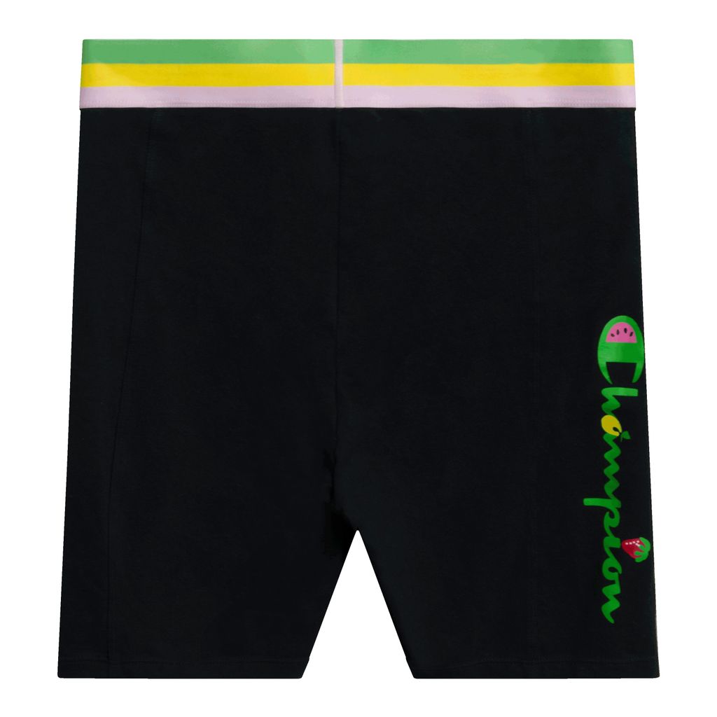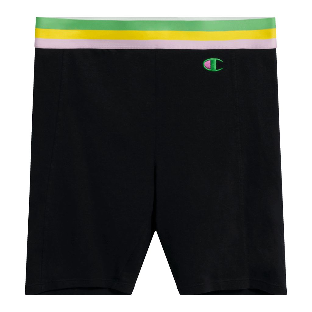 Legendary sportswear brand Champion offers a fun update of the classic biker short. Feautring a waistband in brightly colored stripes with equally as colorful branding on the right leg as well as the iconic embroidered "C" on the left thigh.