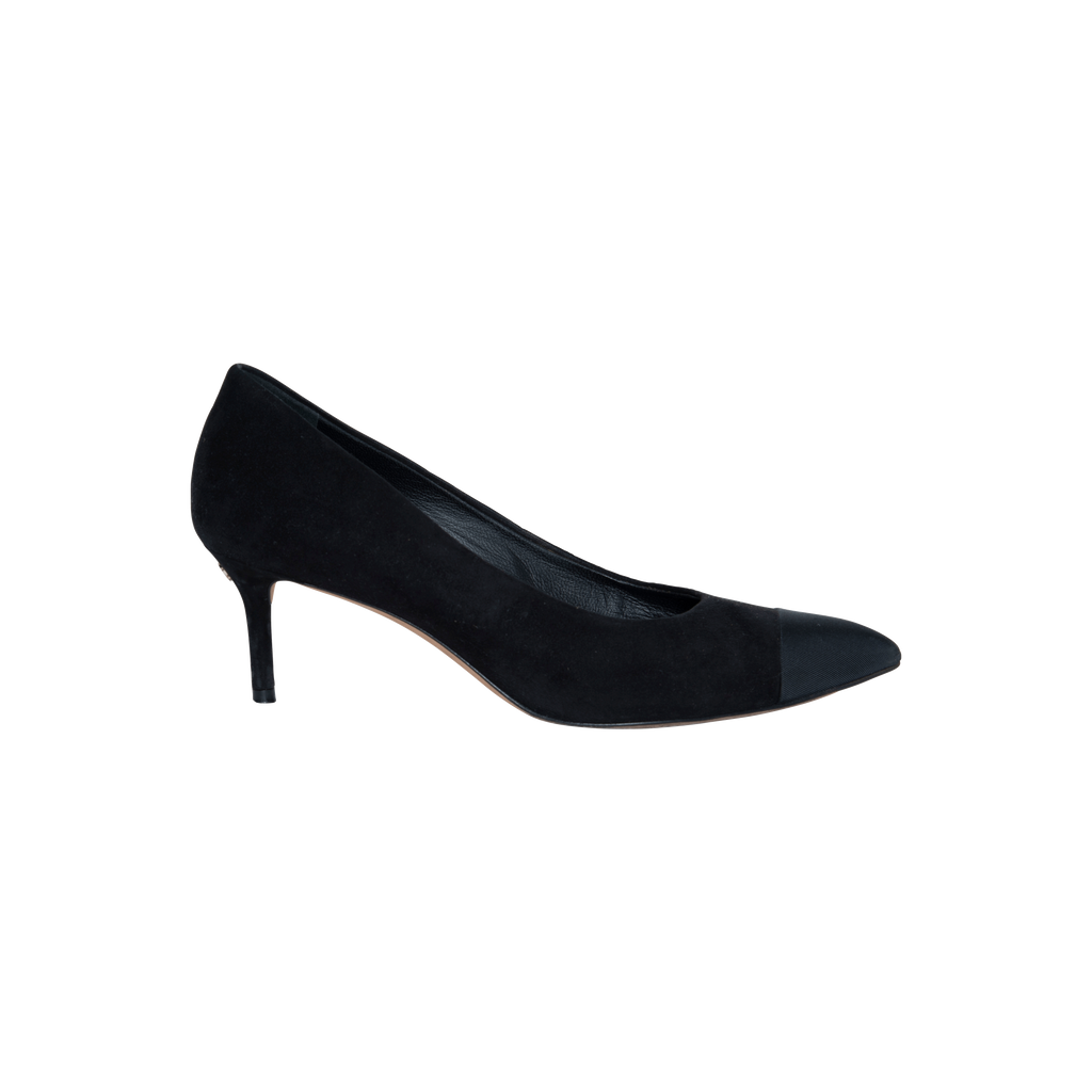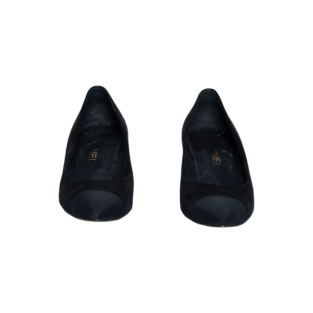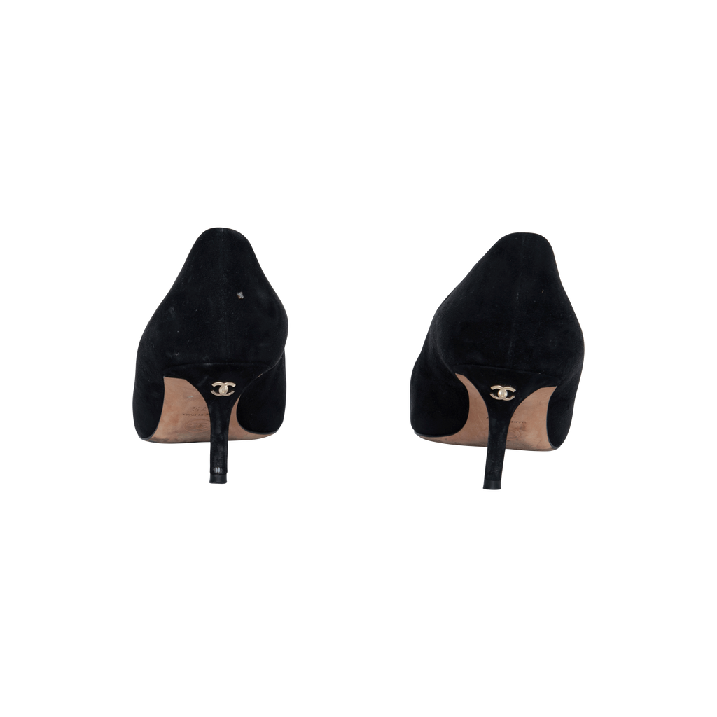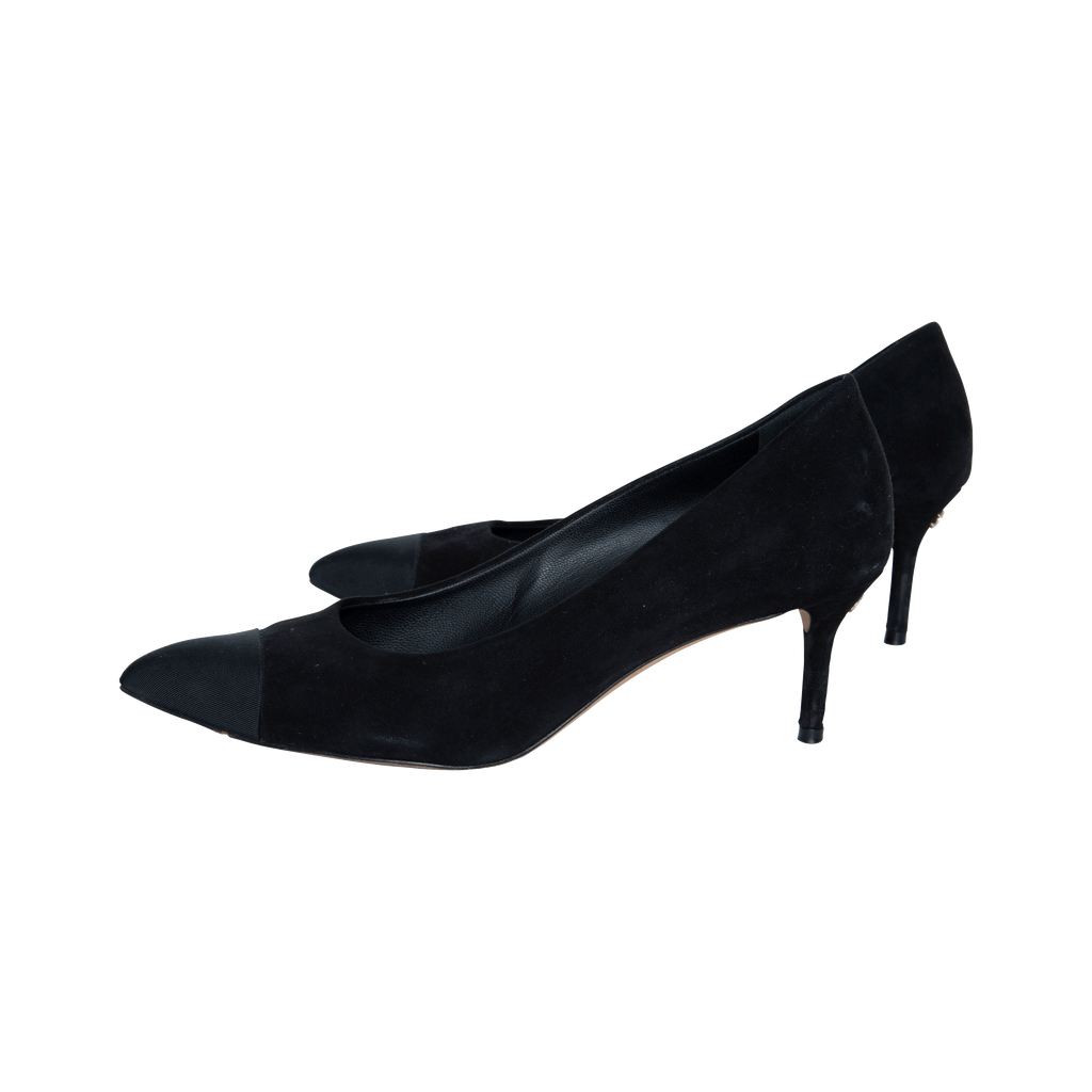 Chanel Black Suede Toe Cap Heels features pointed toe, stiletto kitten heel, and gold plated logo on back of heel.