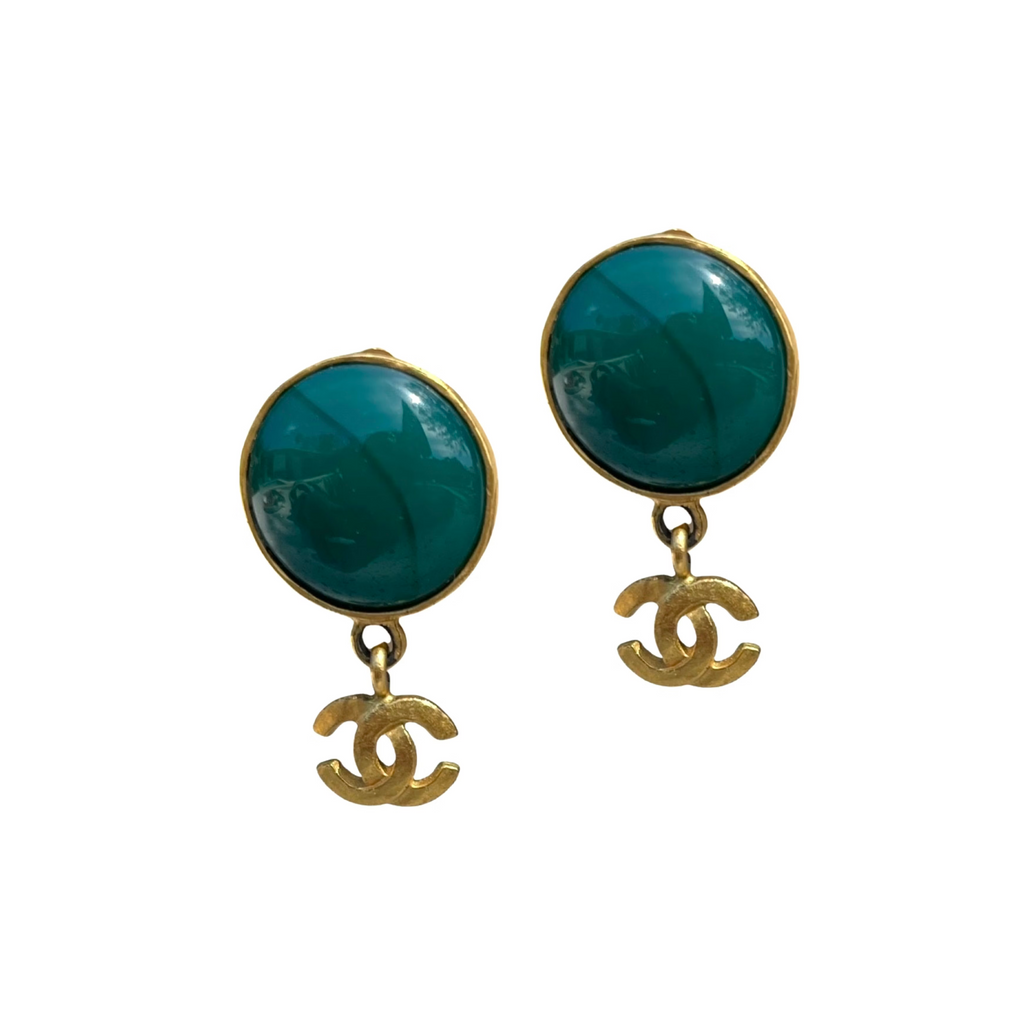 Chanel jade green round drop clip-on earrings with gold metal accents , and a pretty gold tone CC signature logo dangle. Chanel is world-famous as a brand in the world of high-fashion that crafts gorgeous accessories. This pair of clip-on earrings will elevate your outfit.