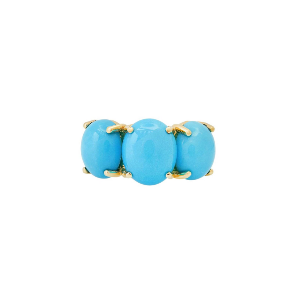 Bold , joyful , and sculptural , this Jumbo Gumdrop ring by Charlie & Marcelle showcases three luminous turquoise cabochons set in warm 14k yellow gold. The oversized , high-polish stones deliver a vibrant pop of sky-blue color with a smooth , candy-like finish , while the trio arrangement creates balance and visual impact. Designed to stand out , this ring brings playful color and modern charm to any ring stack , or shines beautifully on its own.