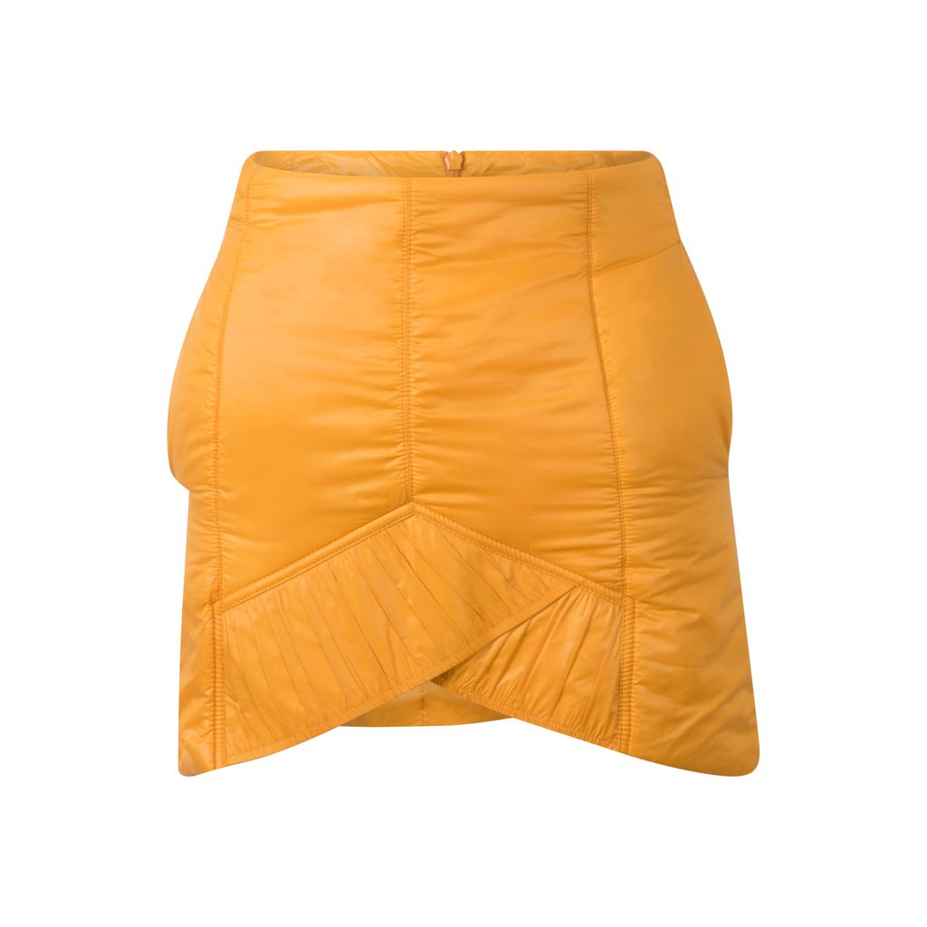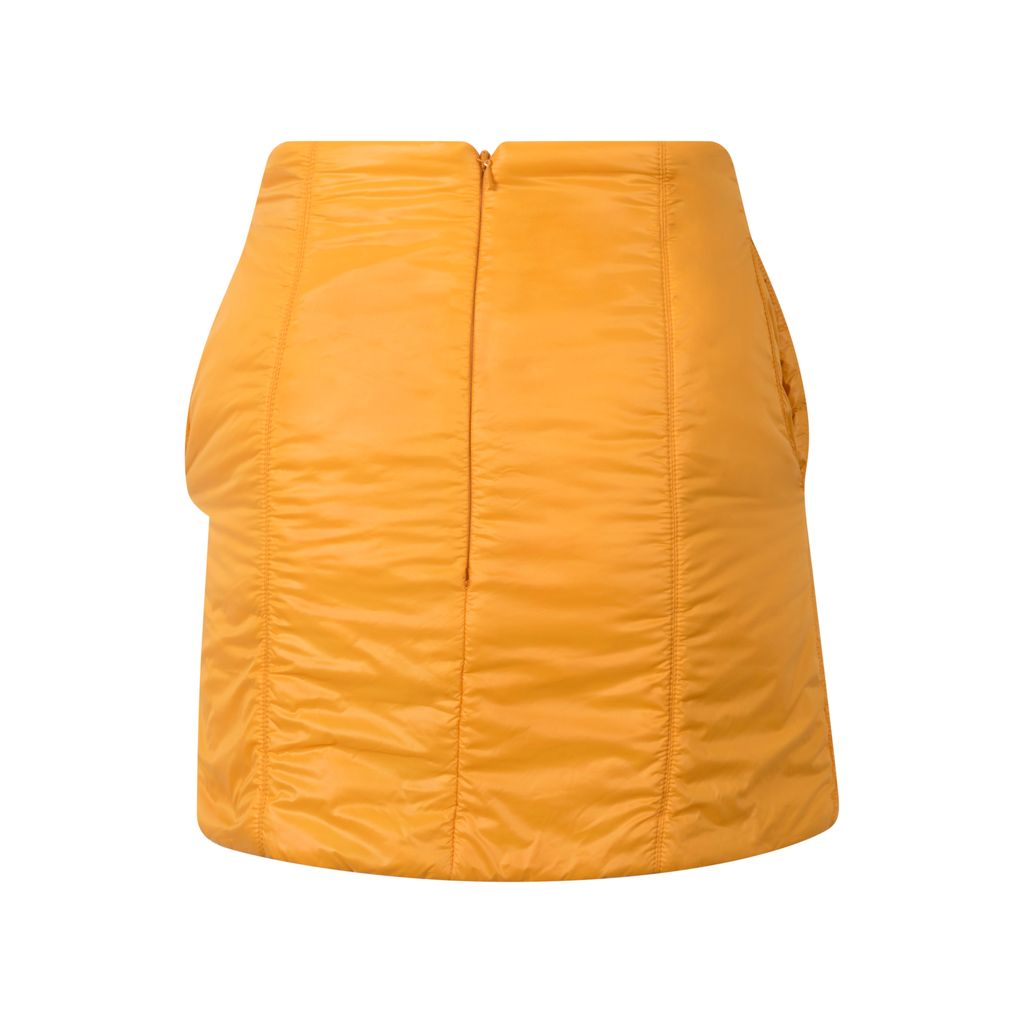This skirt from Charolette Knowles is made from extremely lightweight recycled plastic down material and features a cinched waist, side pockets, and has a back-zip closure for easy wear. Front of skirt has a cropped overlapped detail seen at the hem. Brand new, in excellent condition, tag attached.