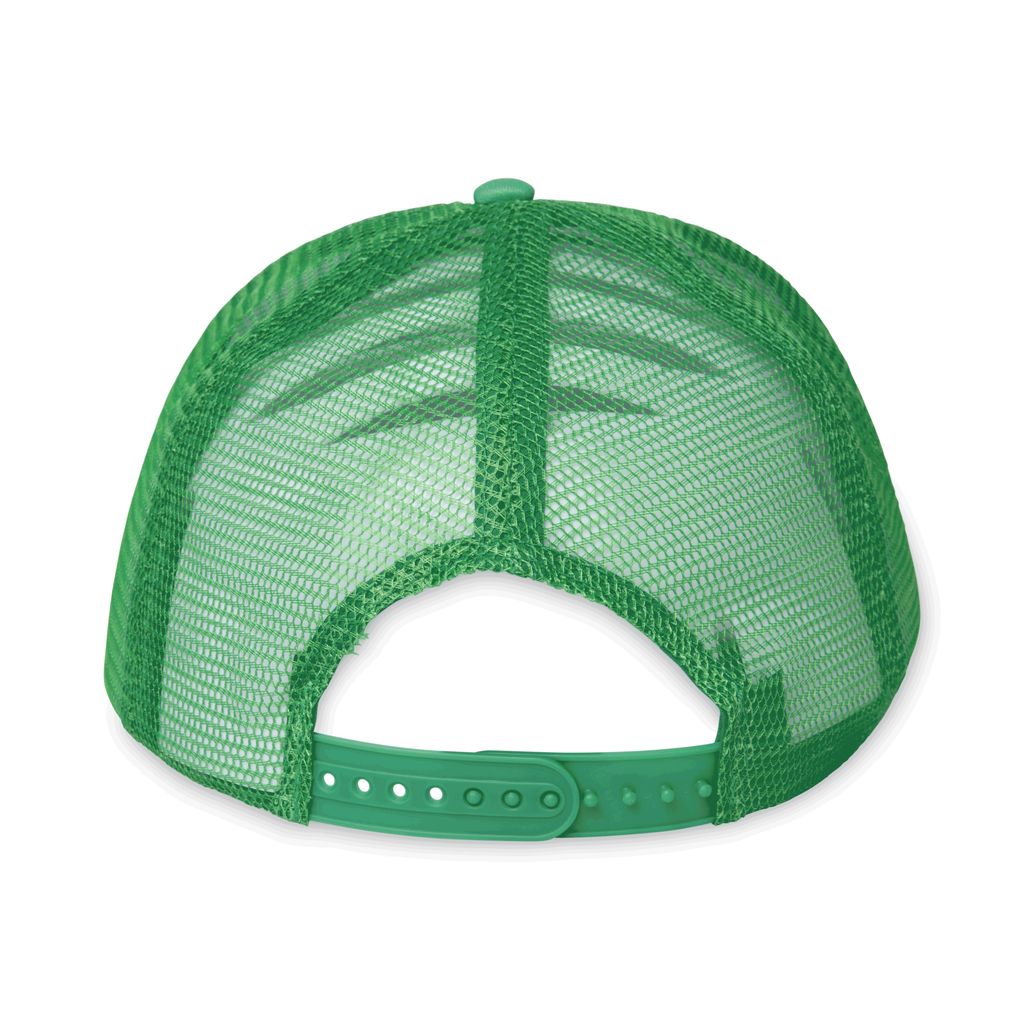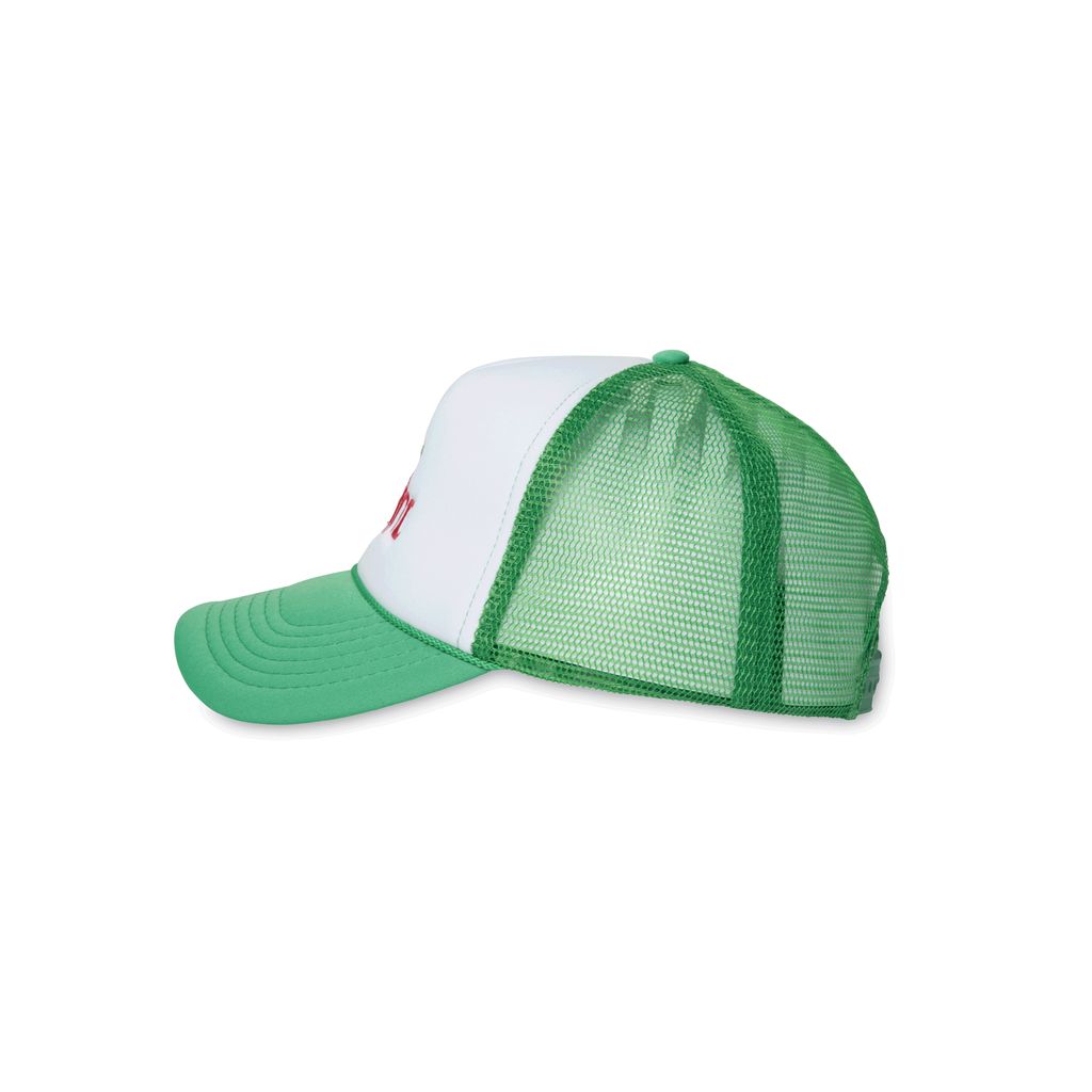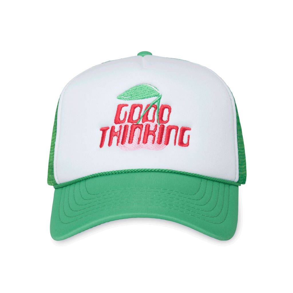 Cherry Trucker hat in green features embroidered Good Thinking logo and adjustable snapback.
