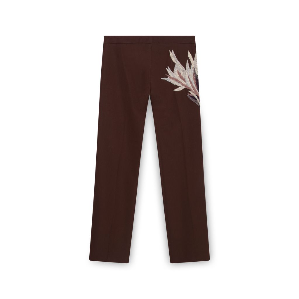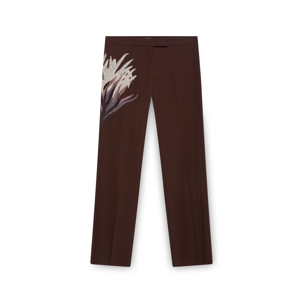 Chloè by Stella McCartney F/W 2001 embroidered pants features runway look 27, embroidery detail at front, low waist, and zipper/hook & eye closure at front.
