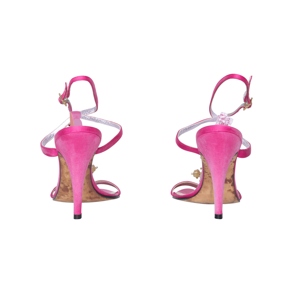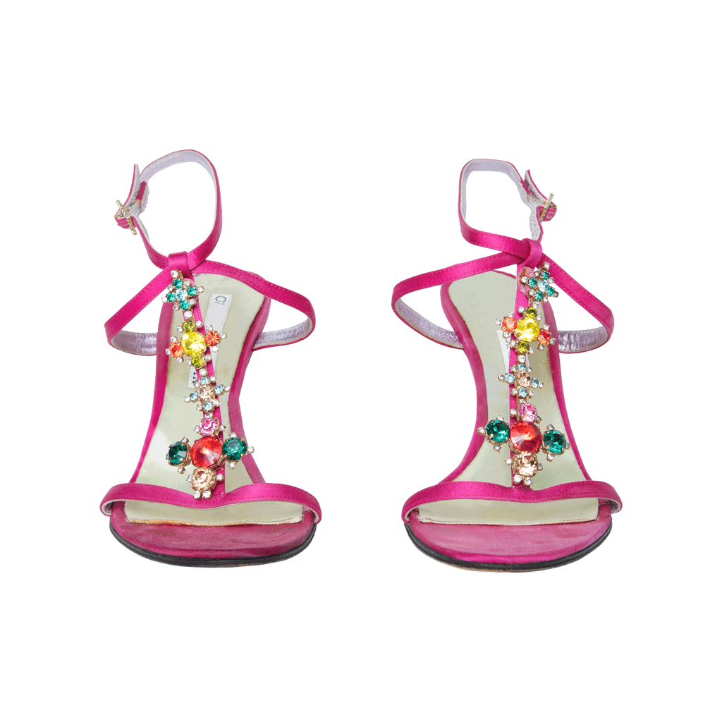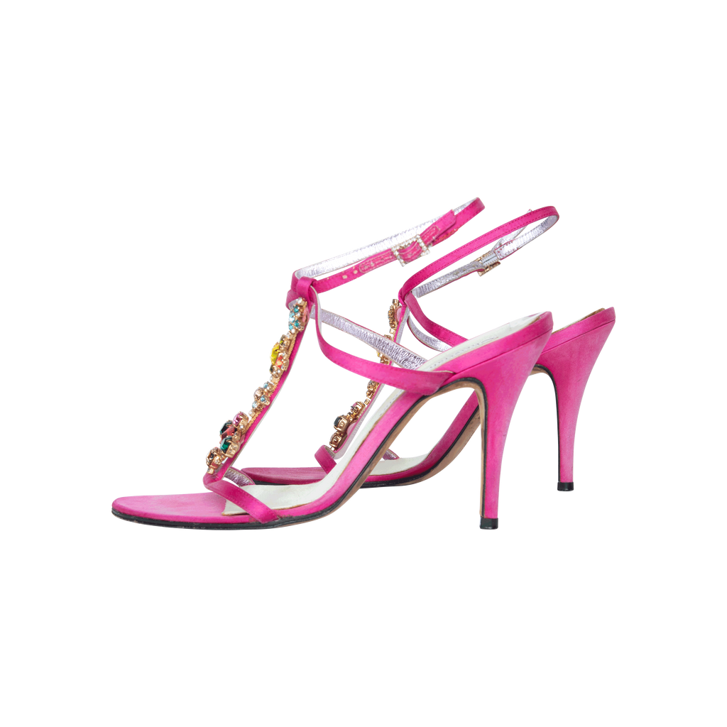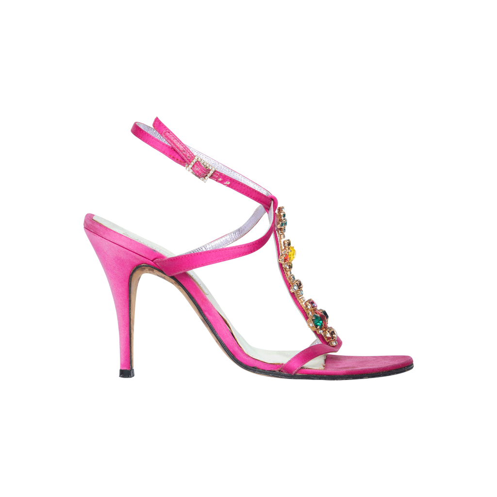 Christian Lacroix Pink Satin Crystal Embellishment Heels features ankle strap, crystal embellishments on T-strap, and stiletto heel.
