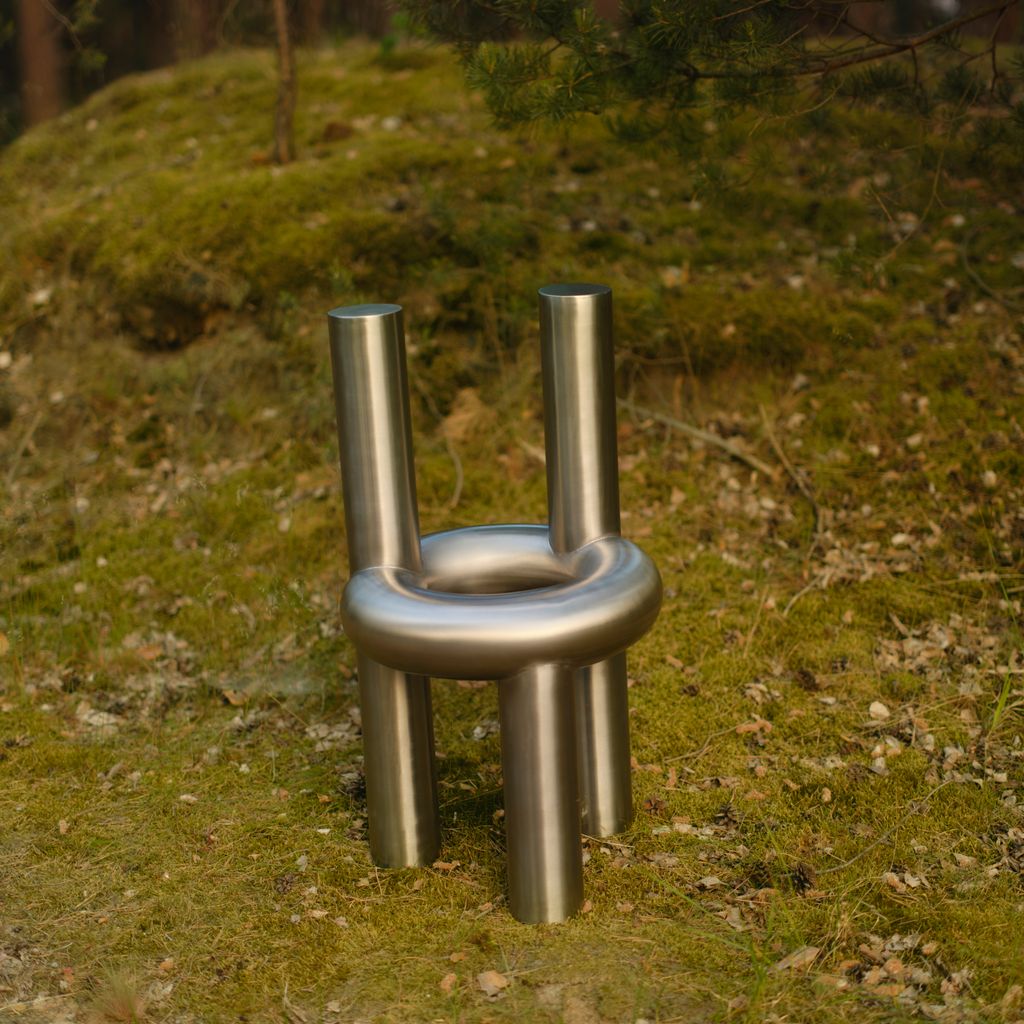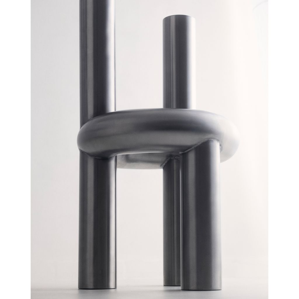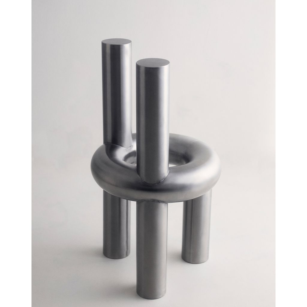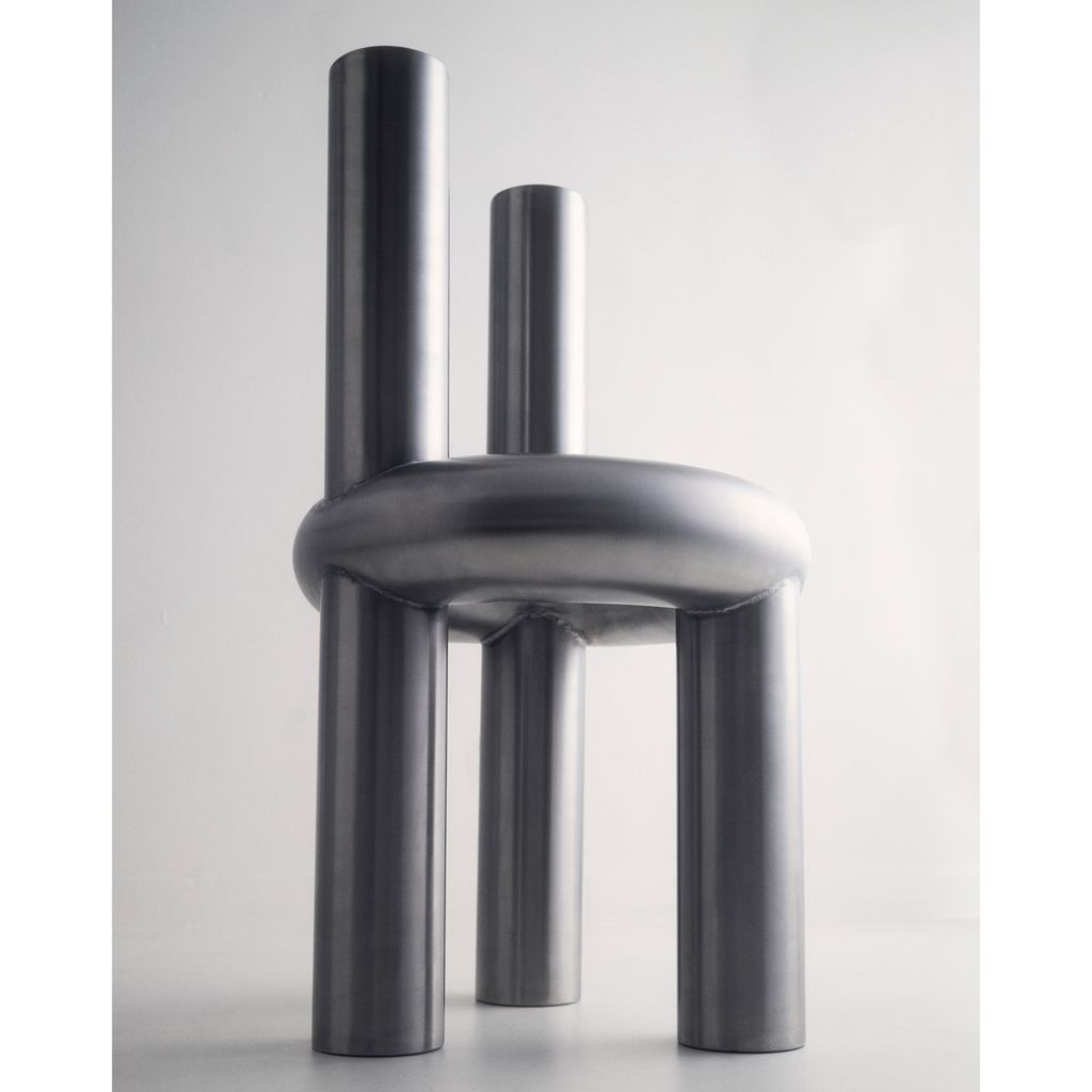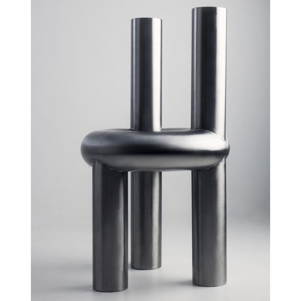 The Chunk Chair is a playful interpretation of a raised seating ring on three oversized legs with a backrest, manifested in solid stainless steel. Informed by omnipresent stainless steel pipes and structures of the urban it combines soft, round, geometric shapes with hard and durable material. The evenly hand brushed surface is giving the round shapes an overall fine touch.