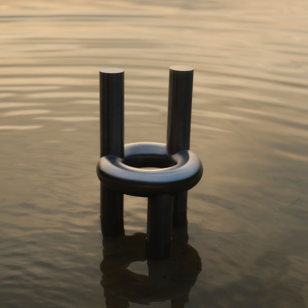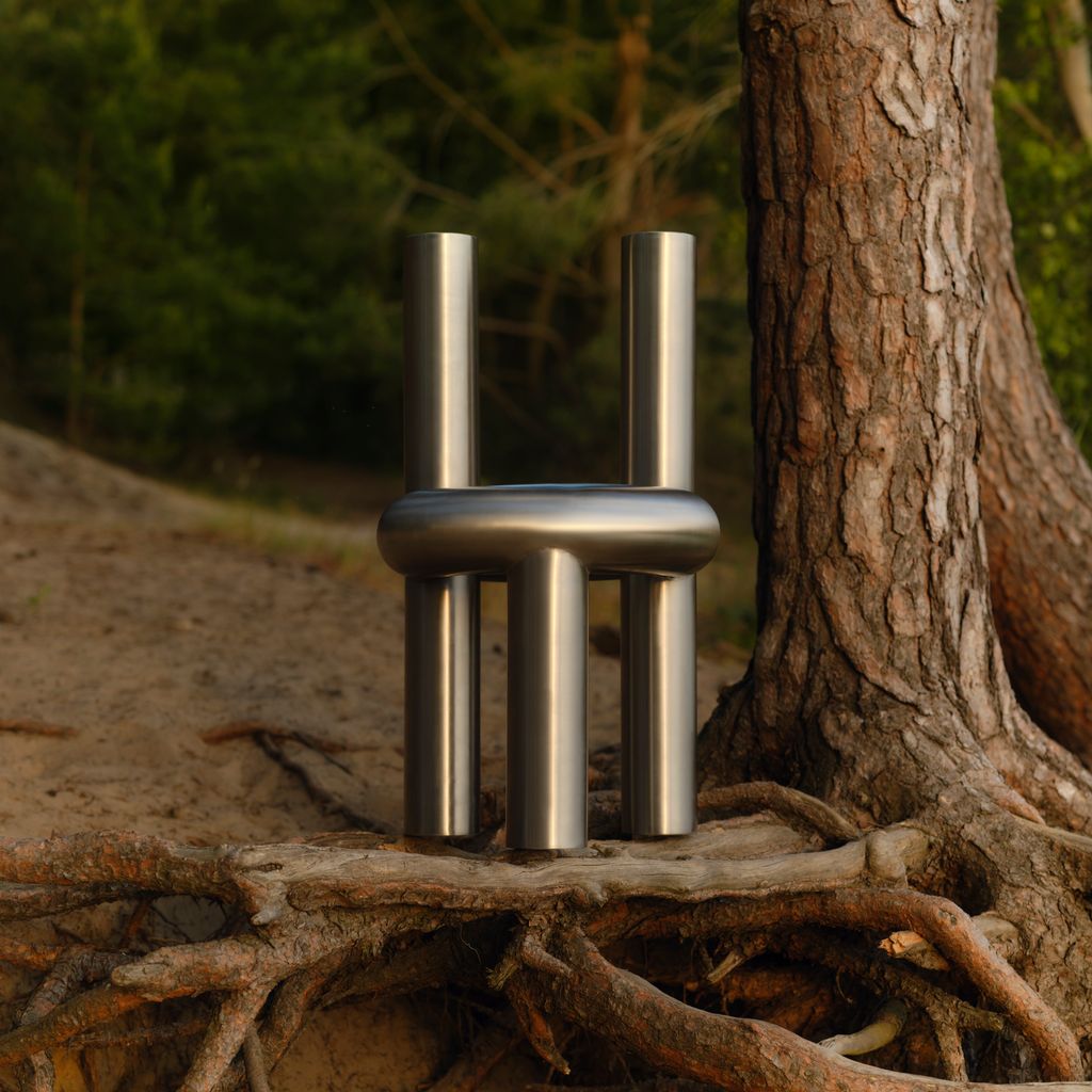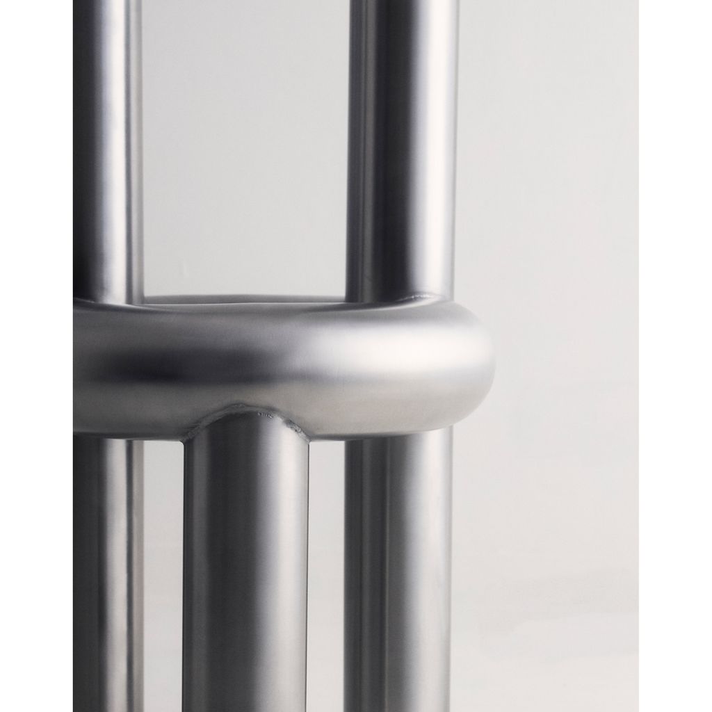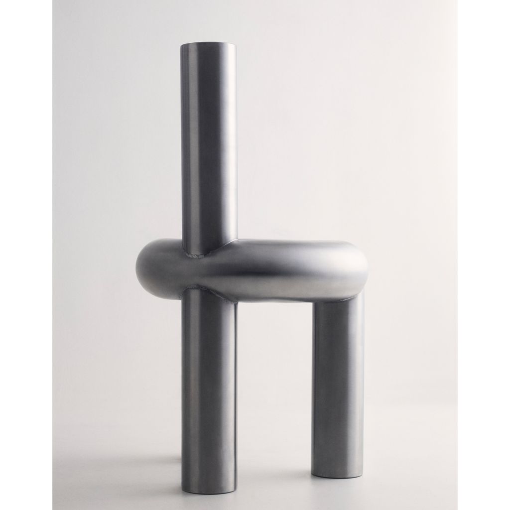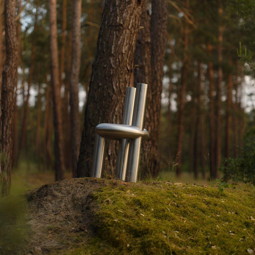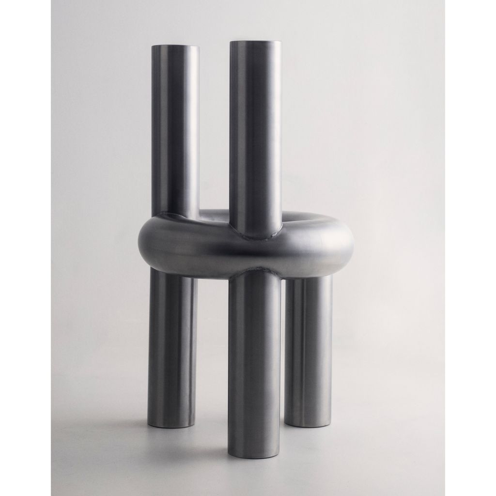 The Chunk Chair is a playful interpretation of a raised seating ring on three oversized legs with a backrest, manifested in solid stainless steel. Informed by omnipresent stainless steel pipes and structures of the urban it combines soft, round, geometric shapes with hard and durable material. The evenly hand brushed surface is giving the round shapes an overall fine touch.