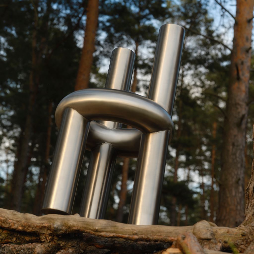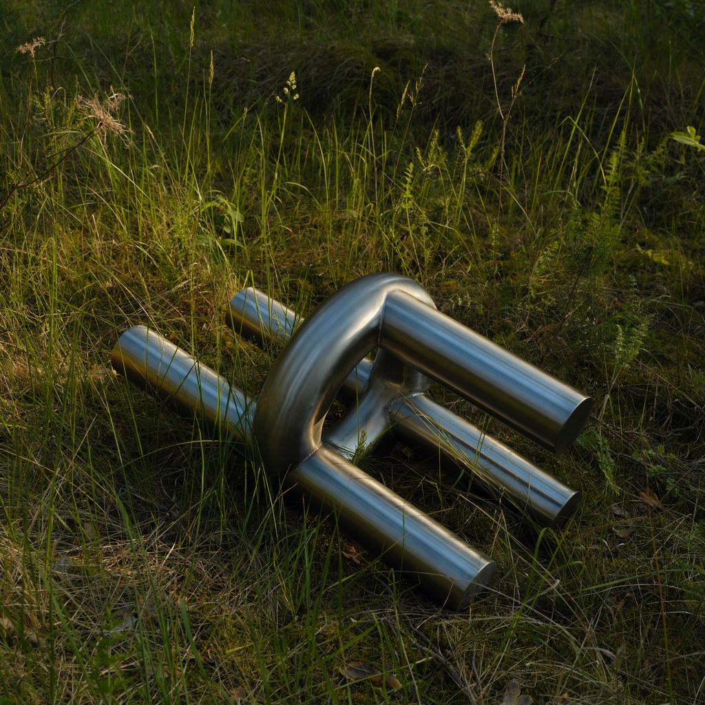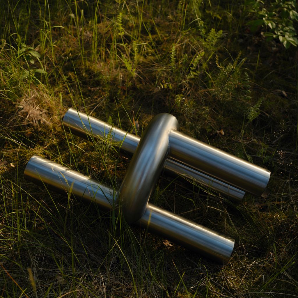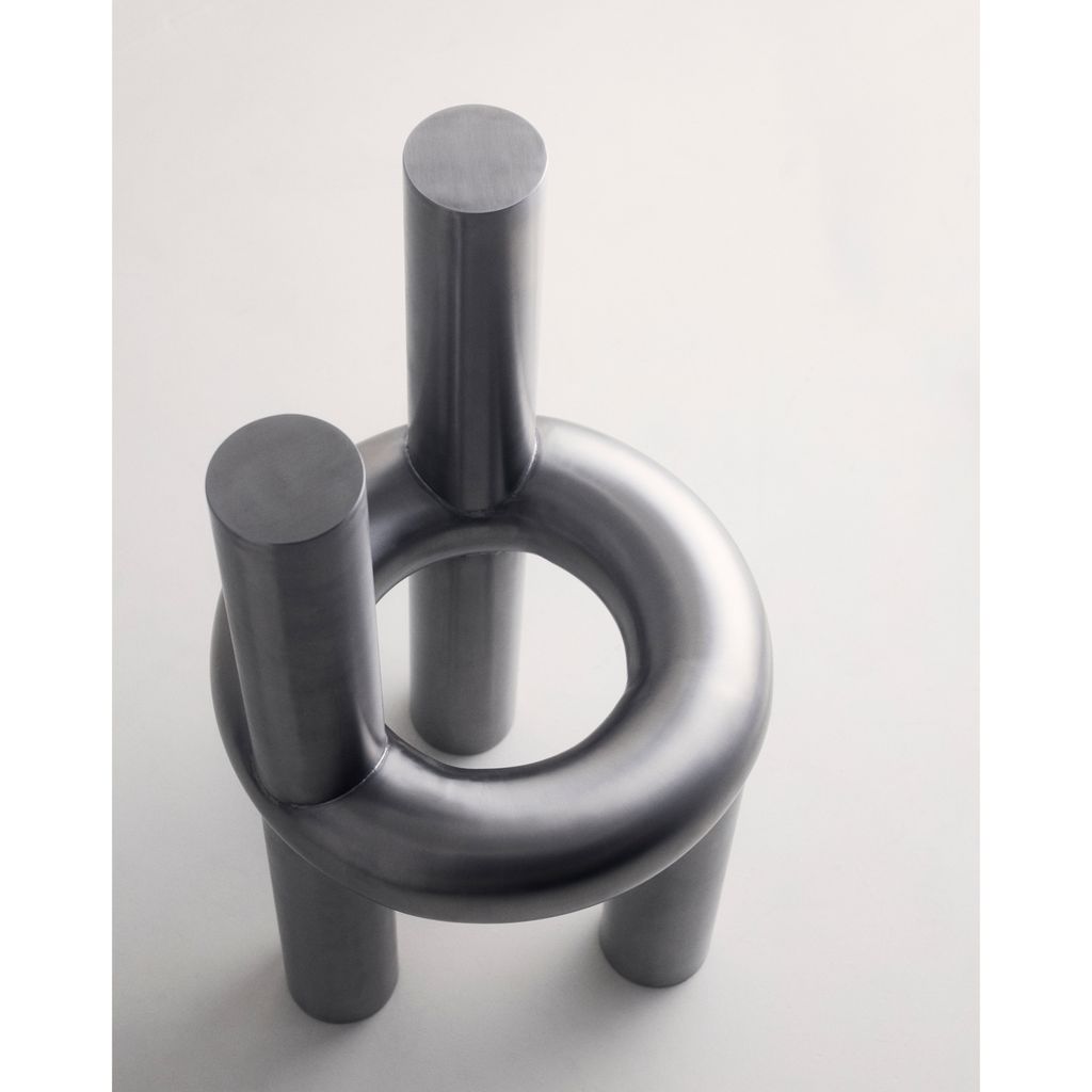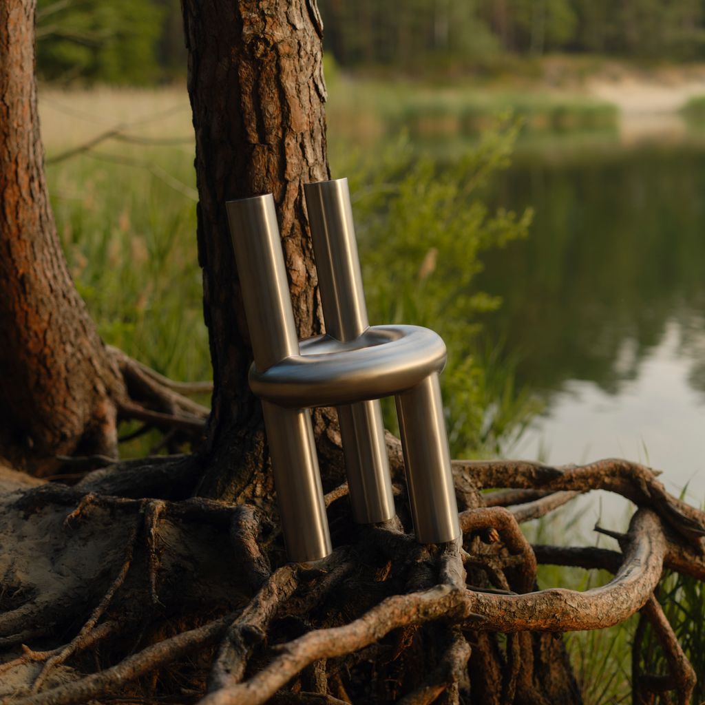 The Chunk Chair is a playful interpretation of a raised seating ring on three oversized legs with a backrest, manifested in solid stainless steel. Informed by omnipresent stainless steel pipes and structures of the urban it combines soft, round, geometric shapes with hard and durable material. The evenly hand brushed surface is giving the round shapes an overall fine touch.