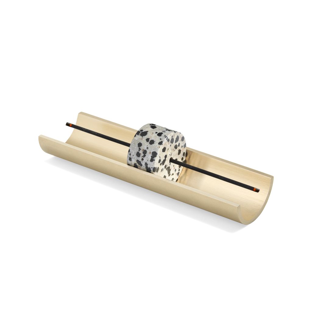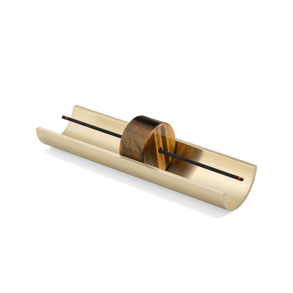 Hand finished and packaged in NYC. Japanese-style incense burner with tray. Precision made in semi precious stones and natural brass with a living finish. Packaged for presentation in foil-stamped sleeves and paper gift box.