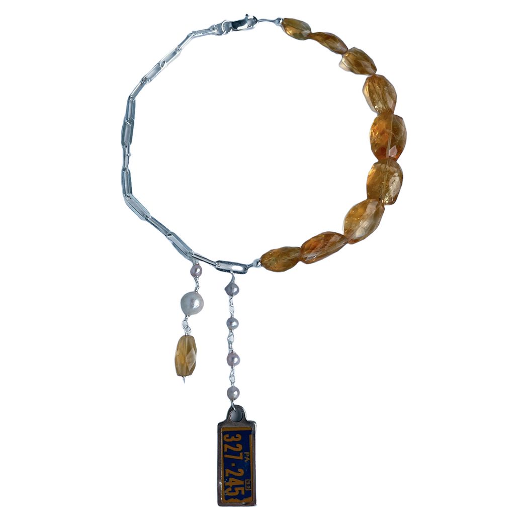 Citrine Chain Necklace features citrine, freshwater pearls, and vintage plate pendant on 925 silver chain and hardware.