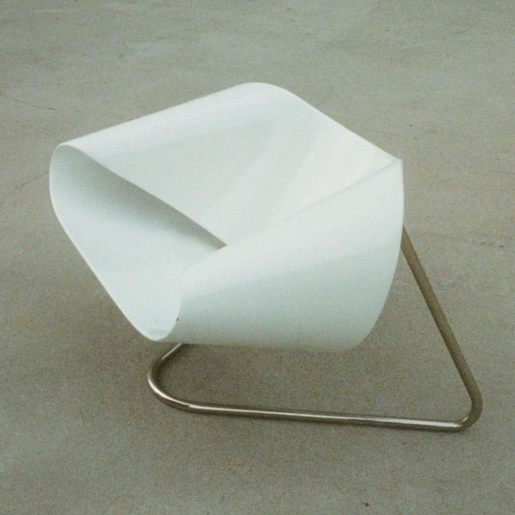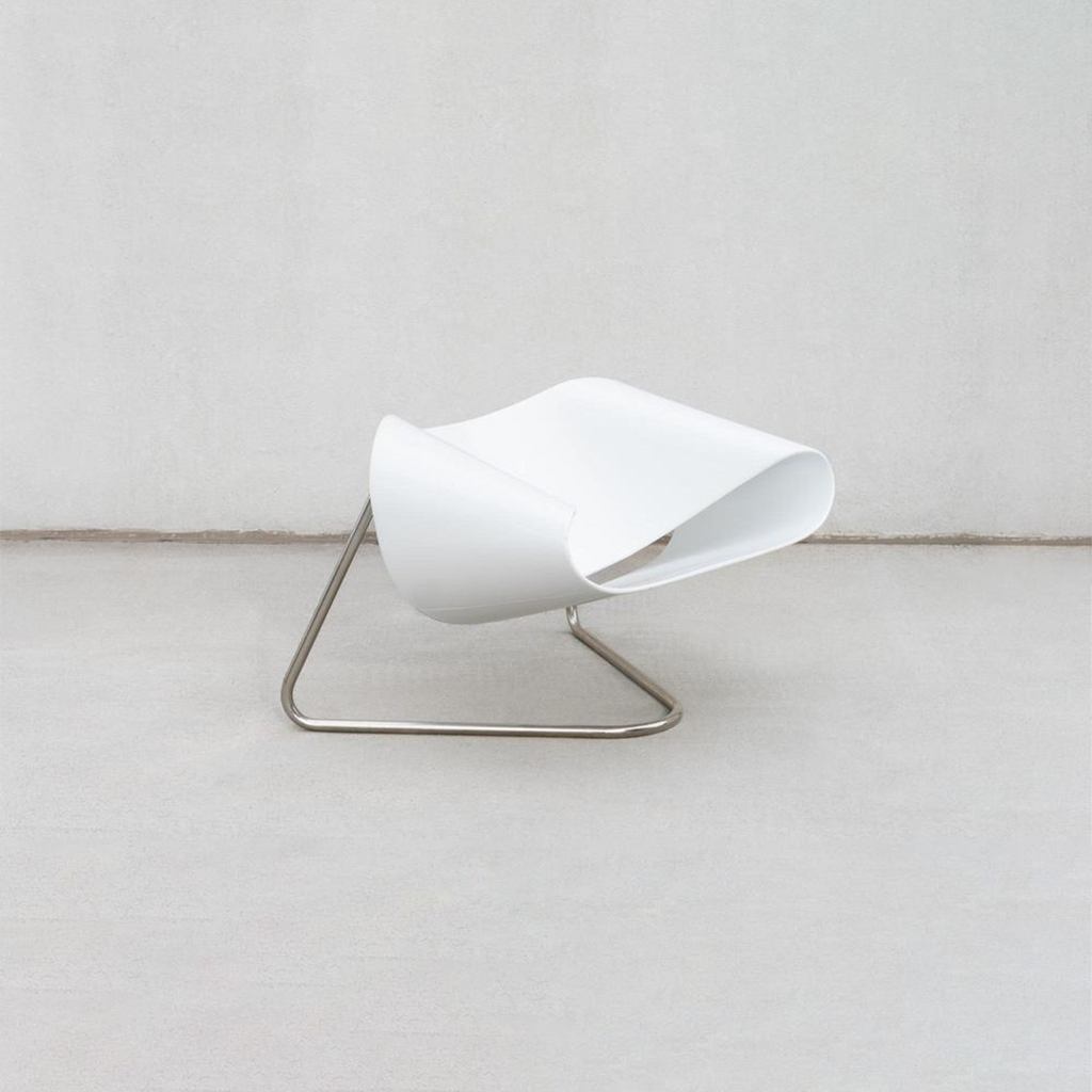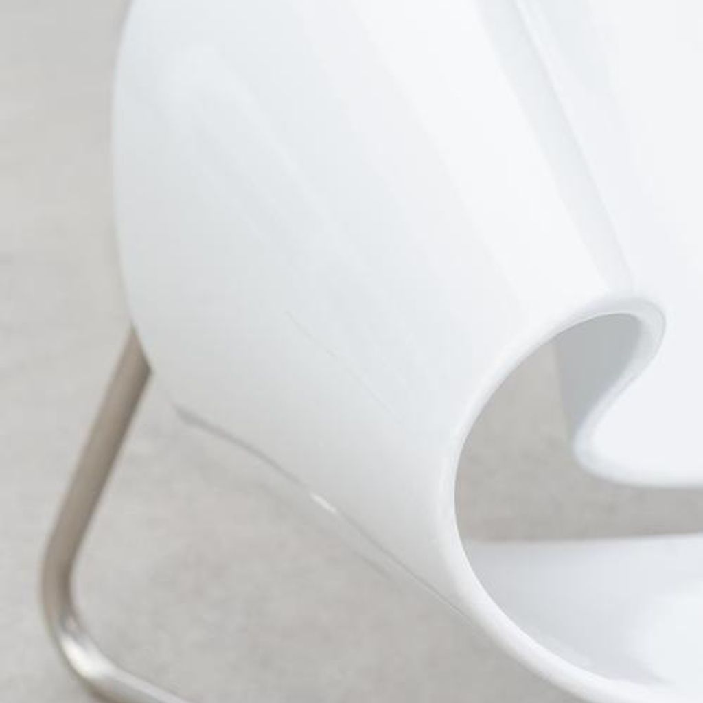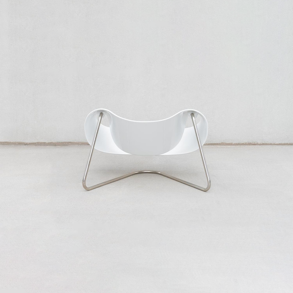 CL9 Ribbon Chair by Cesare Leonardi and Franca Stagi, also known as 'the easy chair'. A tubular chromed frame supports one continuous band of molded fiberglass. The seat is highly sculptural, changing shape from different viewpoints. It is attached to the base by means of rubber shock mounts which alongside the cantilevered construction provide a surprising degree of springiness and flex while sitting.