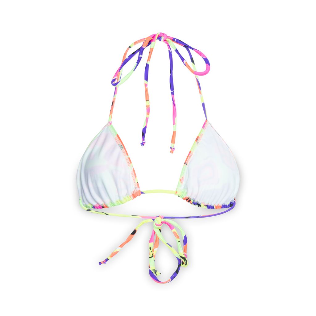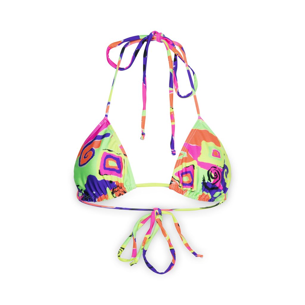 The 1990's Baby bikini top features a classic triangle shape with thin spaghetti straps that tie at the neck and back, allowing for adjustable sizing.