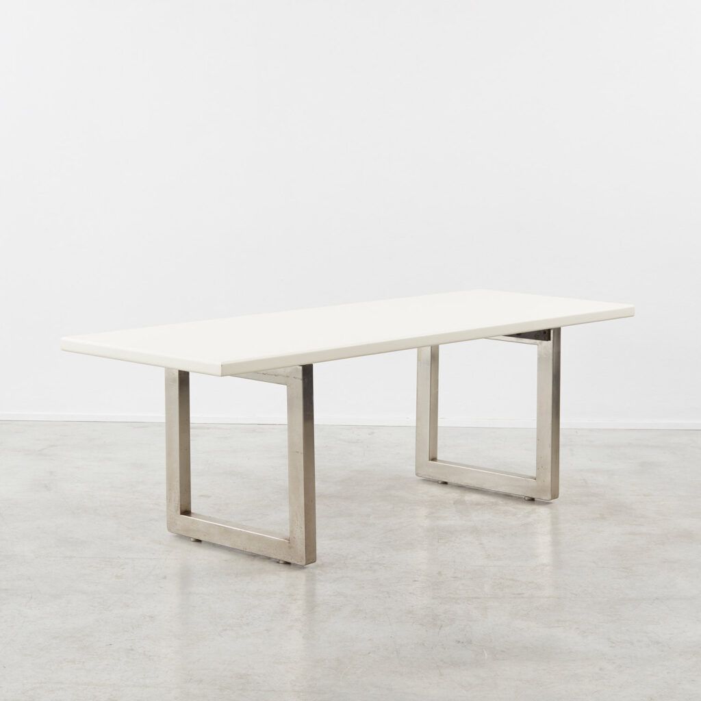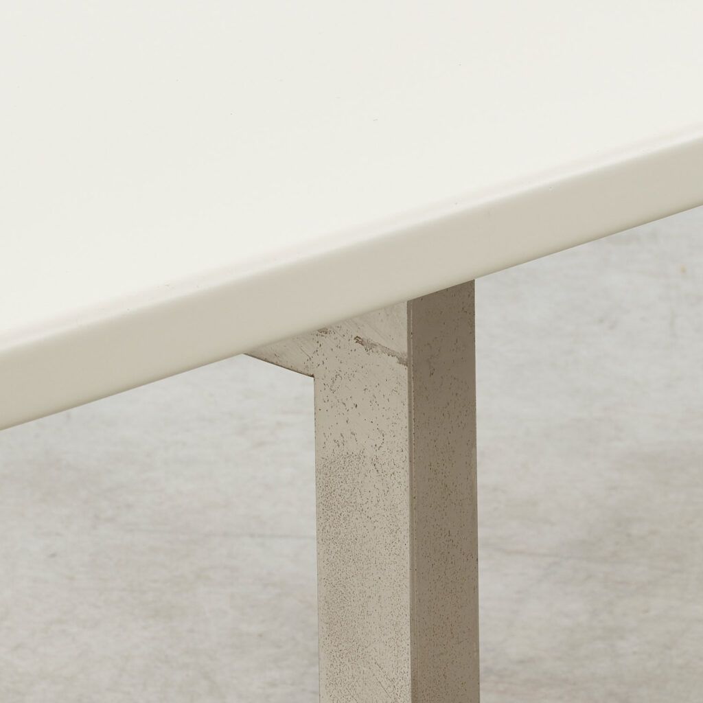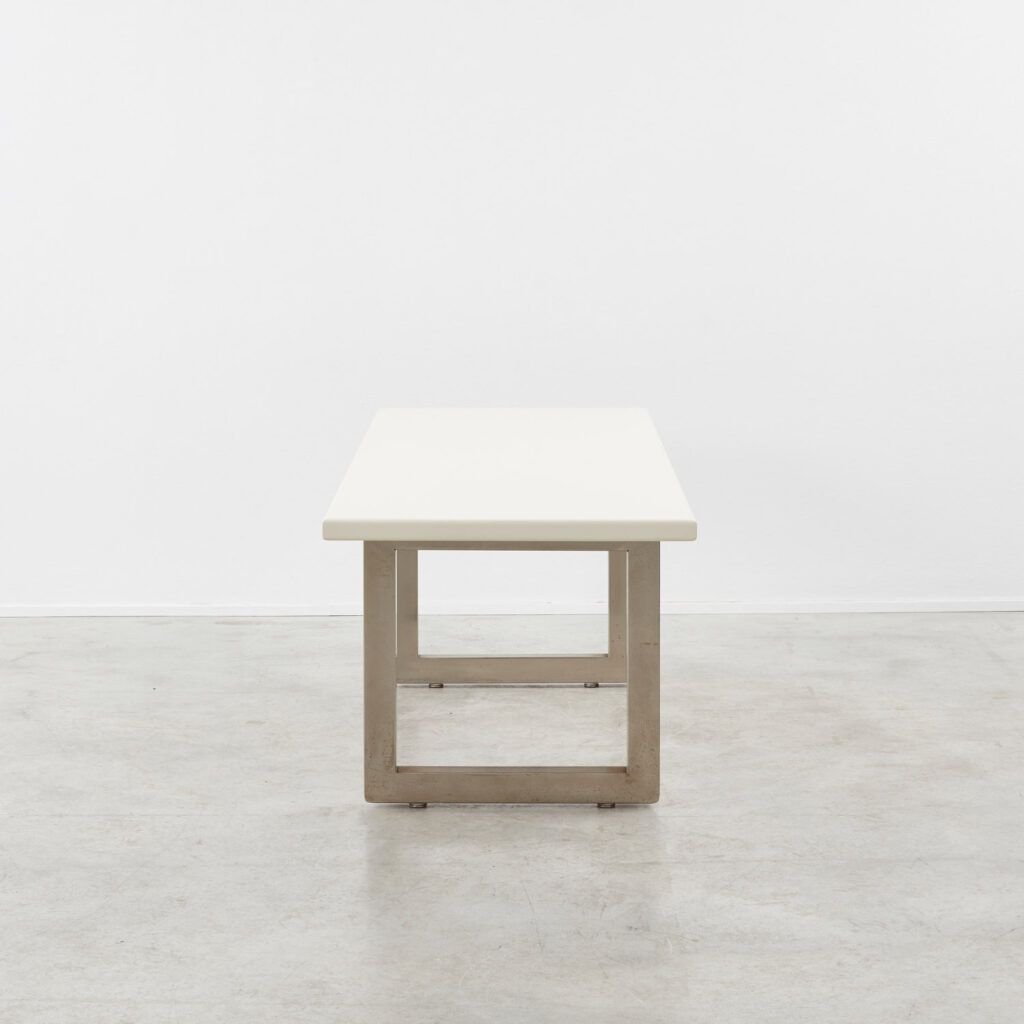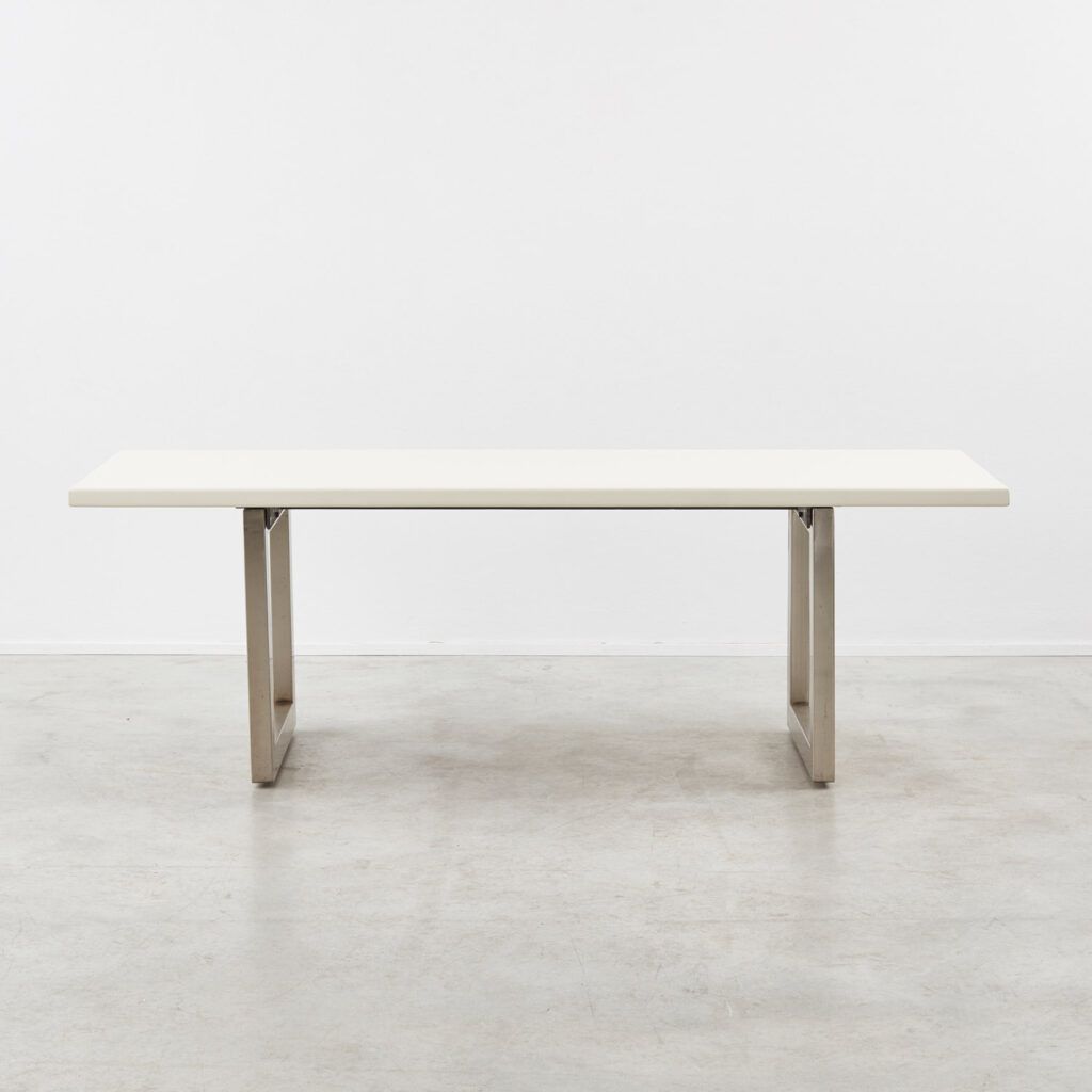 A dining table attributed to Claudio Salocchi (1934-2012). With its distinctive square metal supports, this generous table is effectively the prototype for a now much-mimicked design. The cream lacquer top has a slight chamfered edge, while each quadrilateral hovers just off the ground on hidden feet.