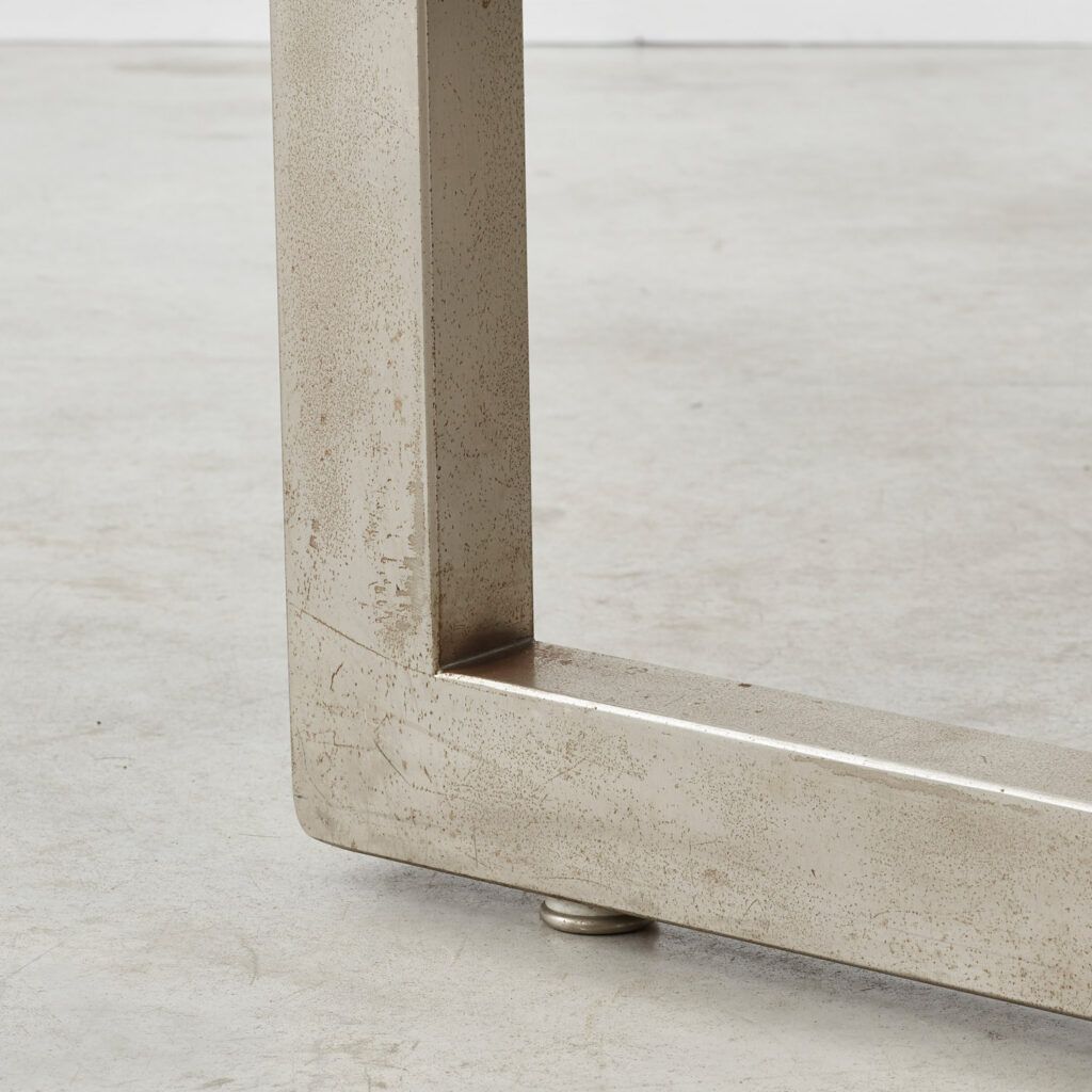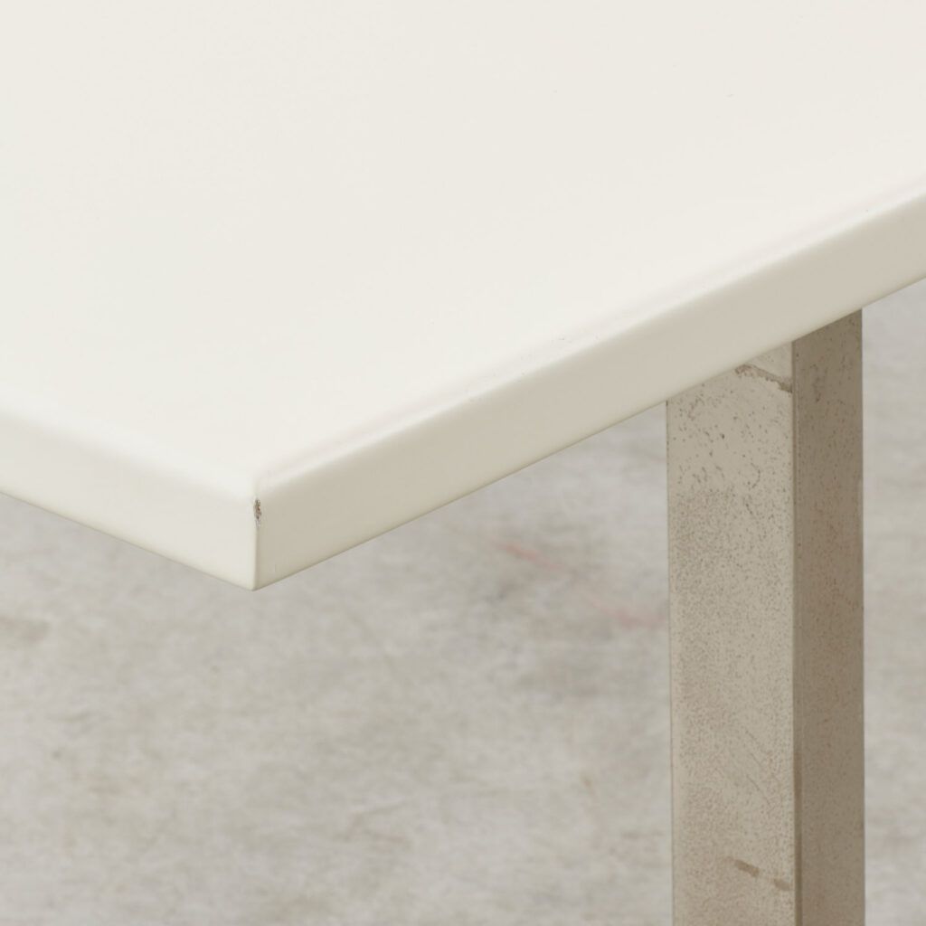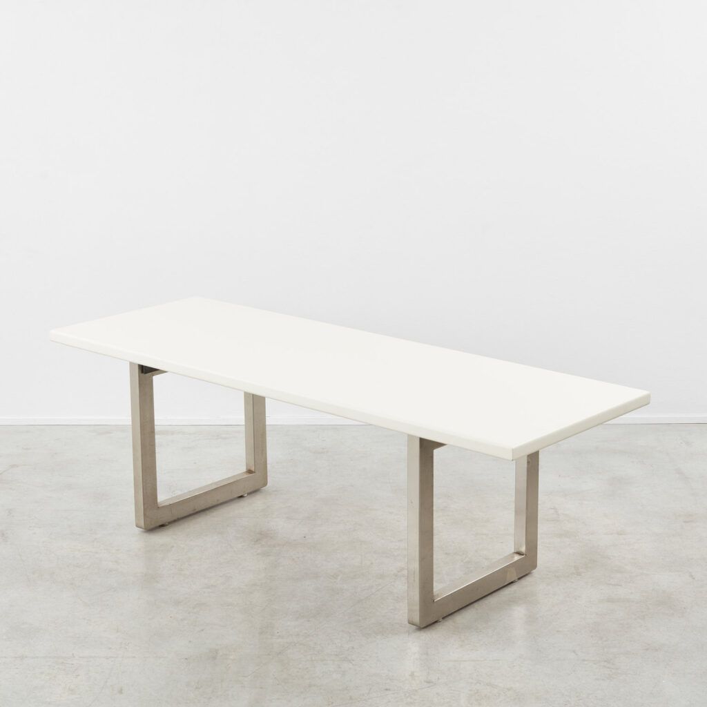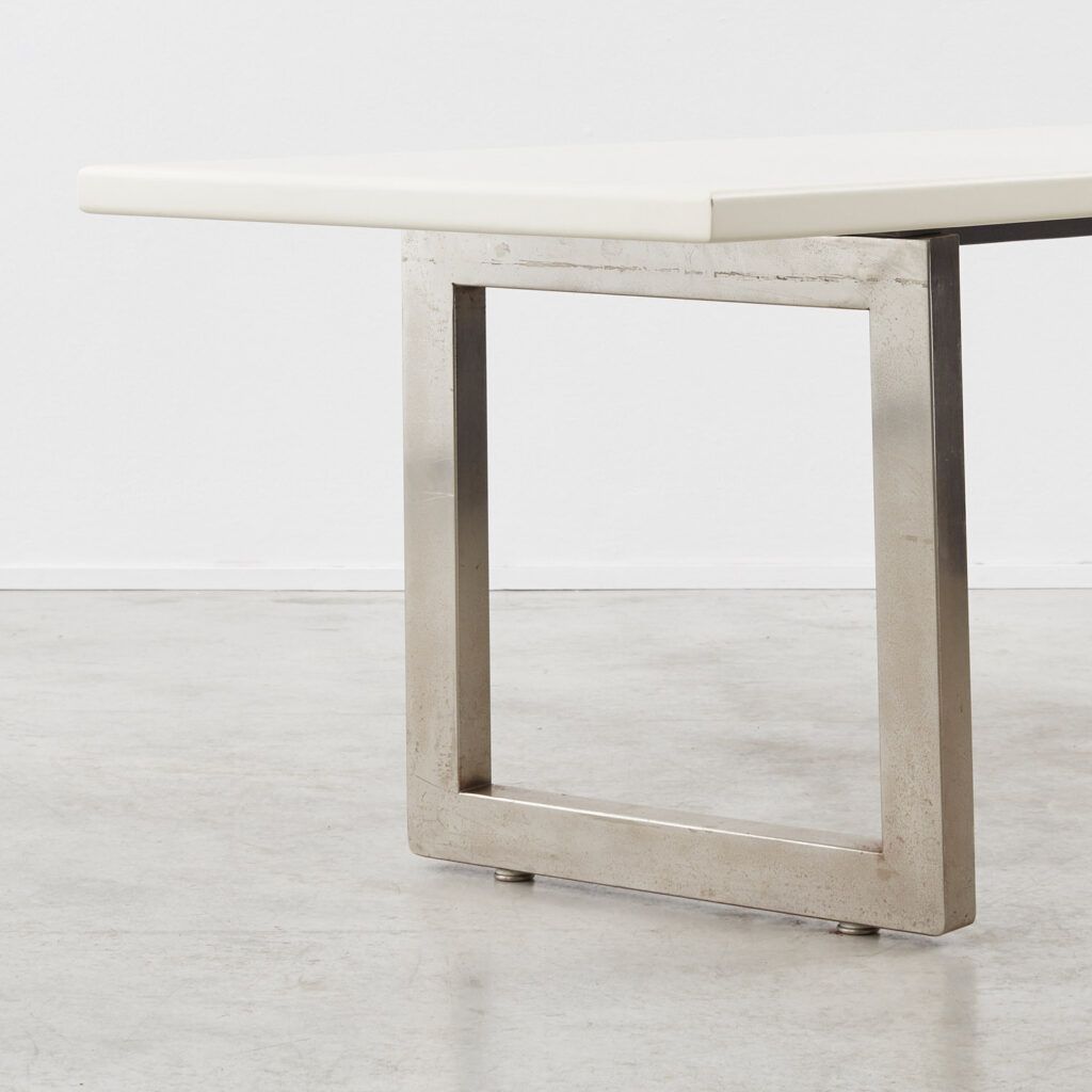 A dining table attributed to Claudio Salocchi (1934-2012). With its distinctive square metal supports, this generous table is effectively the prototype for a now much-mimicked design. The cream lacquer top has a slight chamfered edge, while each quadrilateral hovers just off the ground on hidden feet.