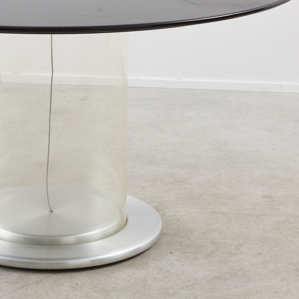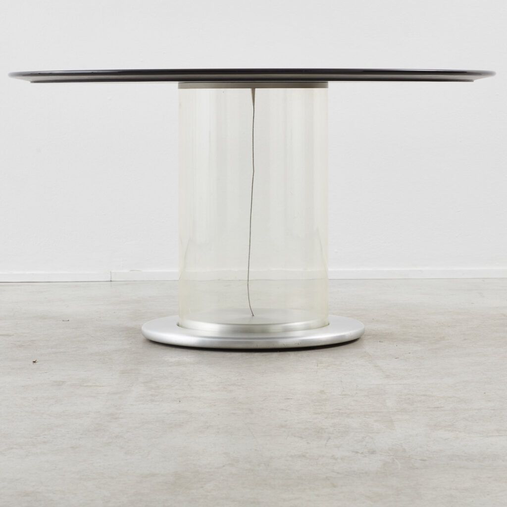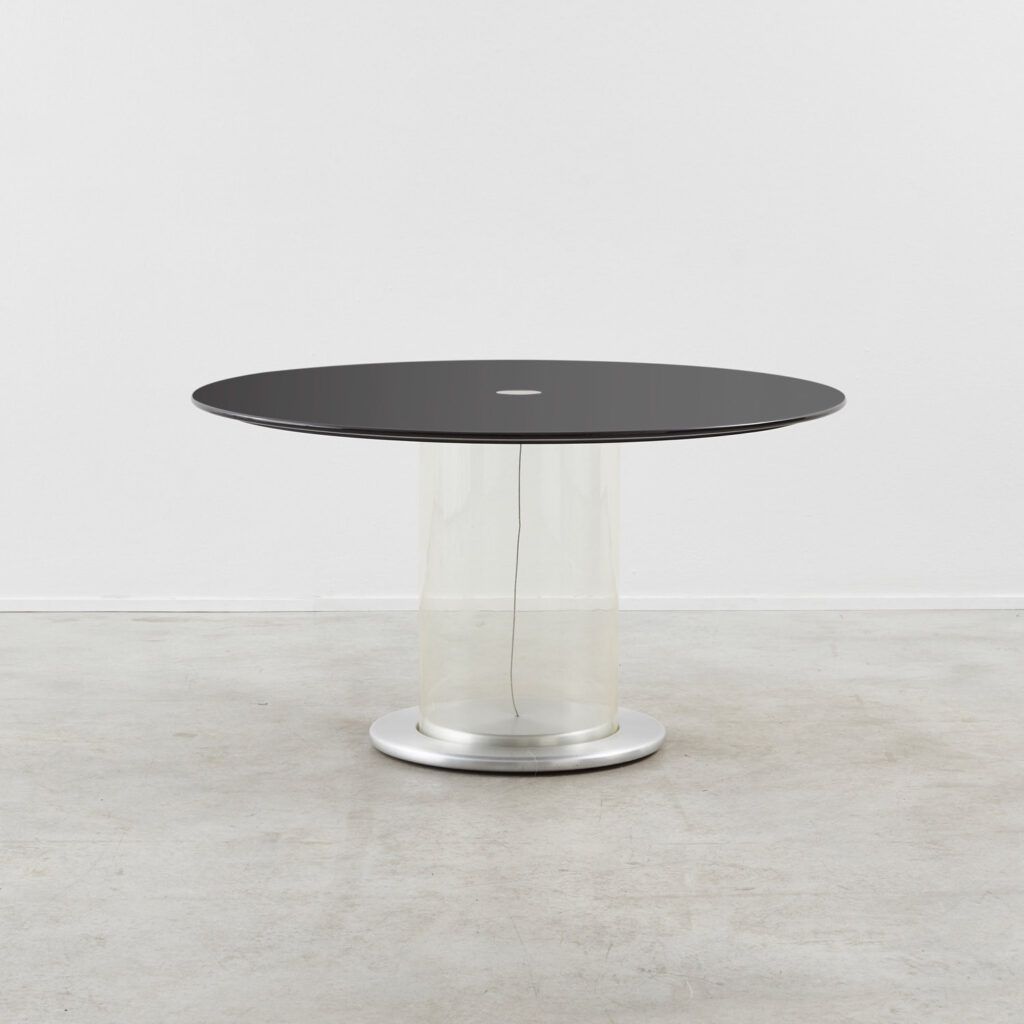 This futuristic 1960s design by Salocchi features a taut steel wire suspended in a tinted acrylic cylinder. The circular base in brushed aluminium is mirrored by a lacquered black tabletop, which is punctuated by a central detail in the same metal.