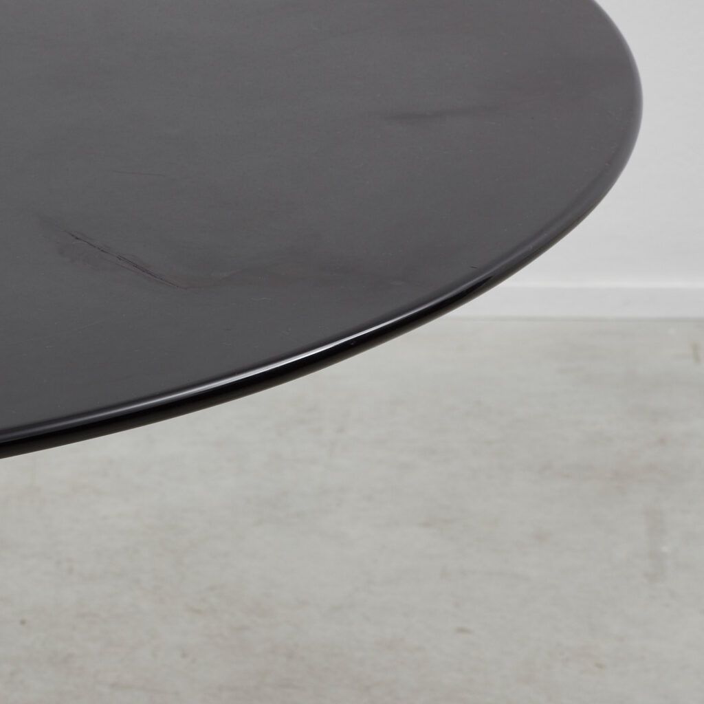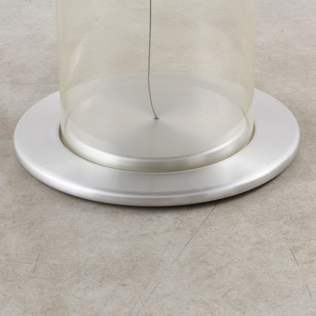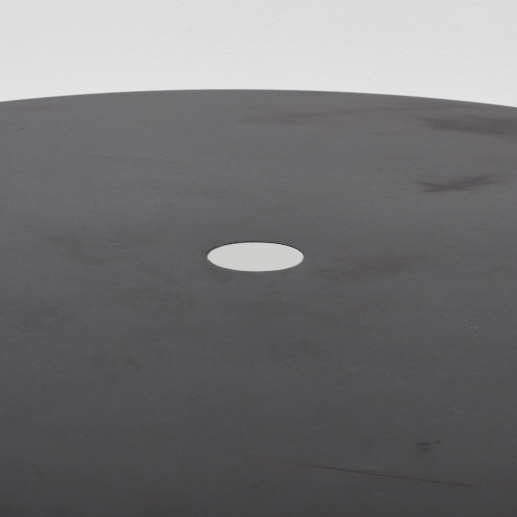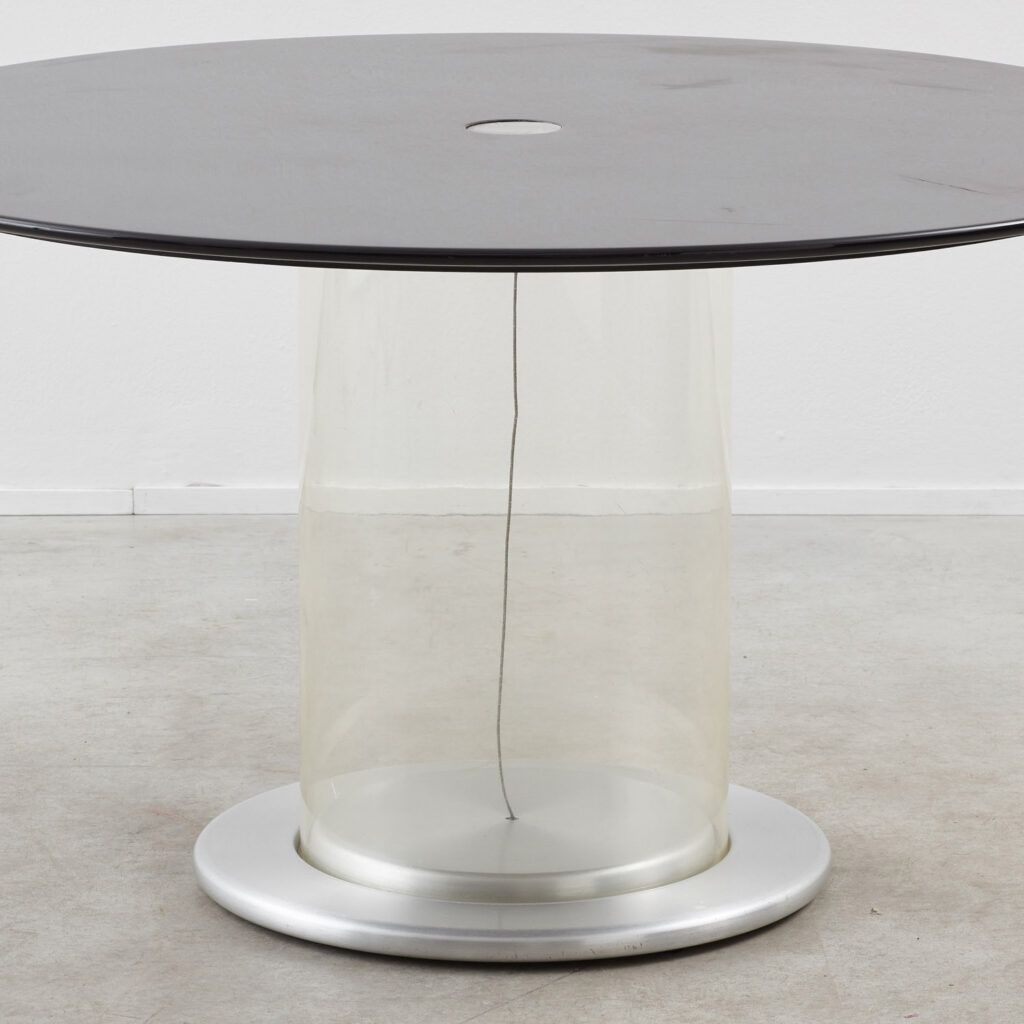 This futuristic 1960s design by Salocchi features a taut steel wire suspended in a tinted acrylic cylinder. The circular base in brushed aluminium is mirrored by a lacquered black tabletop, which is punctuated by a central detail in the same metal.