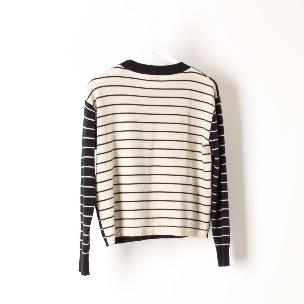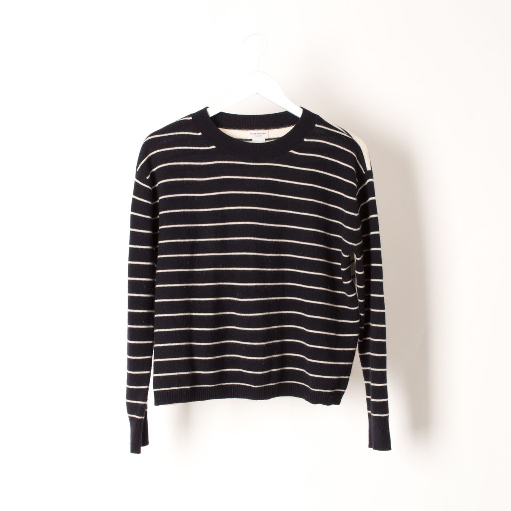 Like new, striped cashmere sweater from Club Monaco. This super-soft, ribbed-knit Club Monaco sweater is a graphic sweater reimagined in plush cashmere, featuring a banded neckline and ribbed cuffs.