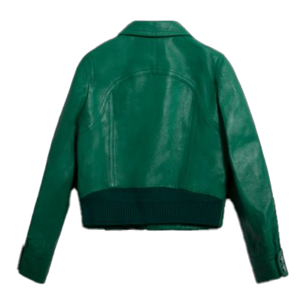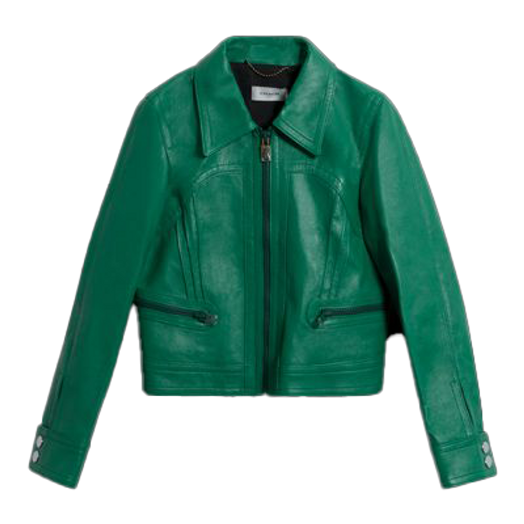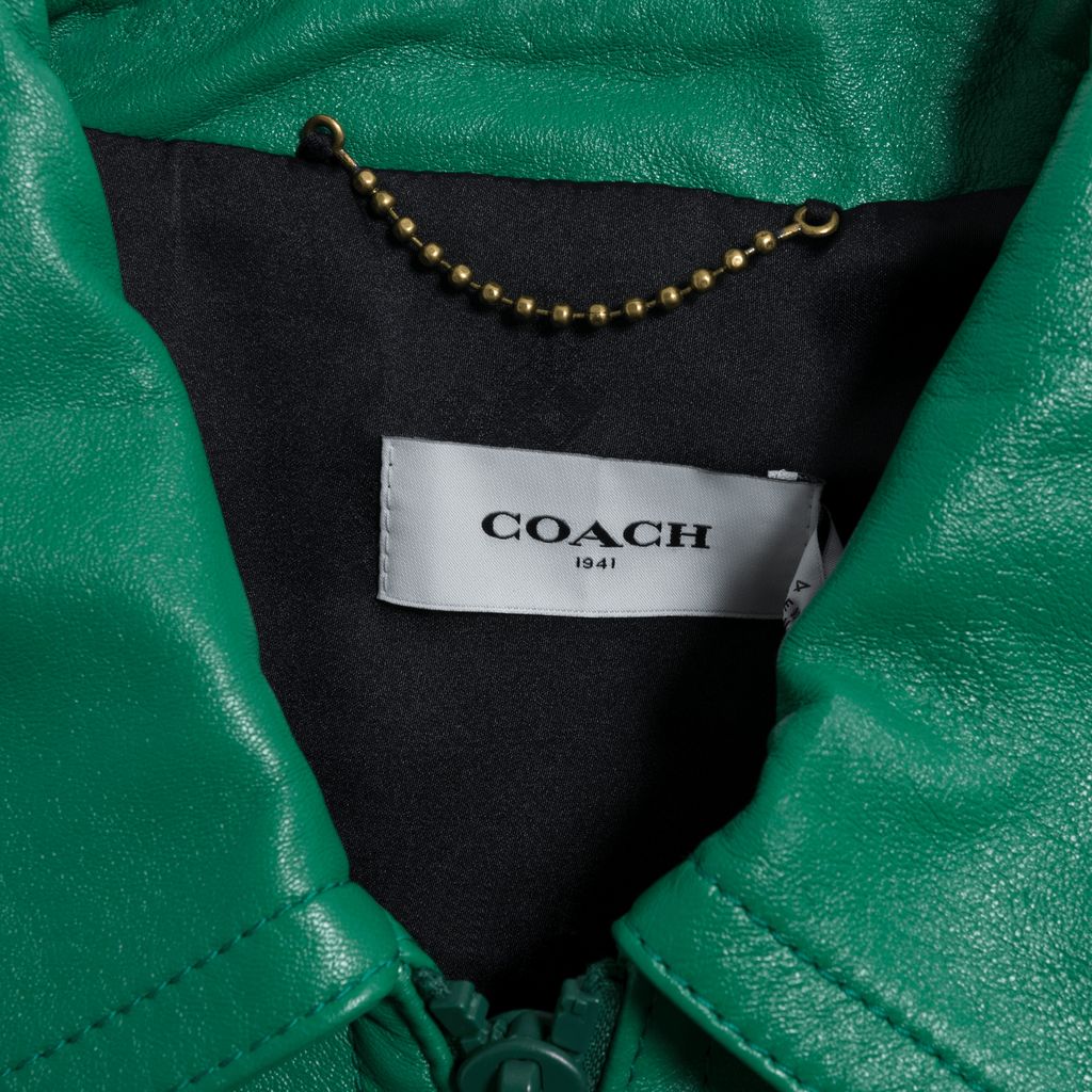 This leather jacket from Coach is crafted from soft Nappa leather and features a slightly-cropped blouson fit. Finished with decorative topstitching, zip pockets and classic Horse and Carriage zipper pull. Brand new with tags.