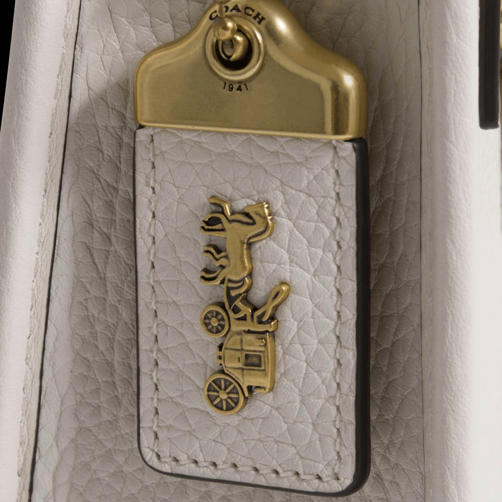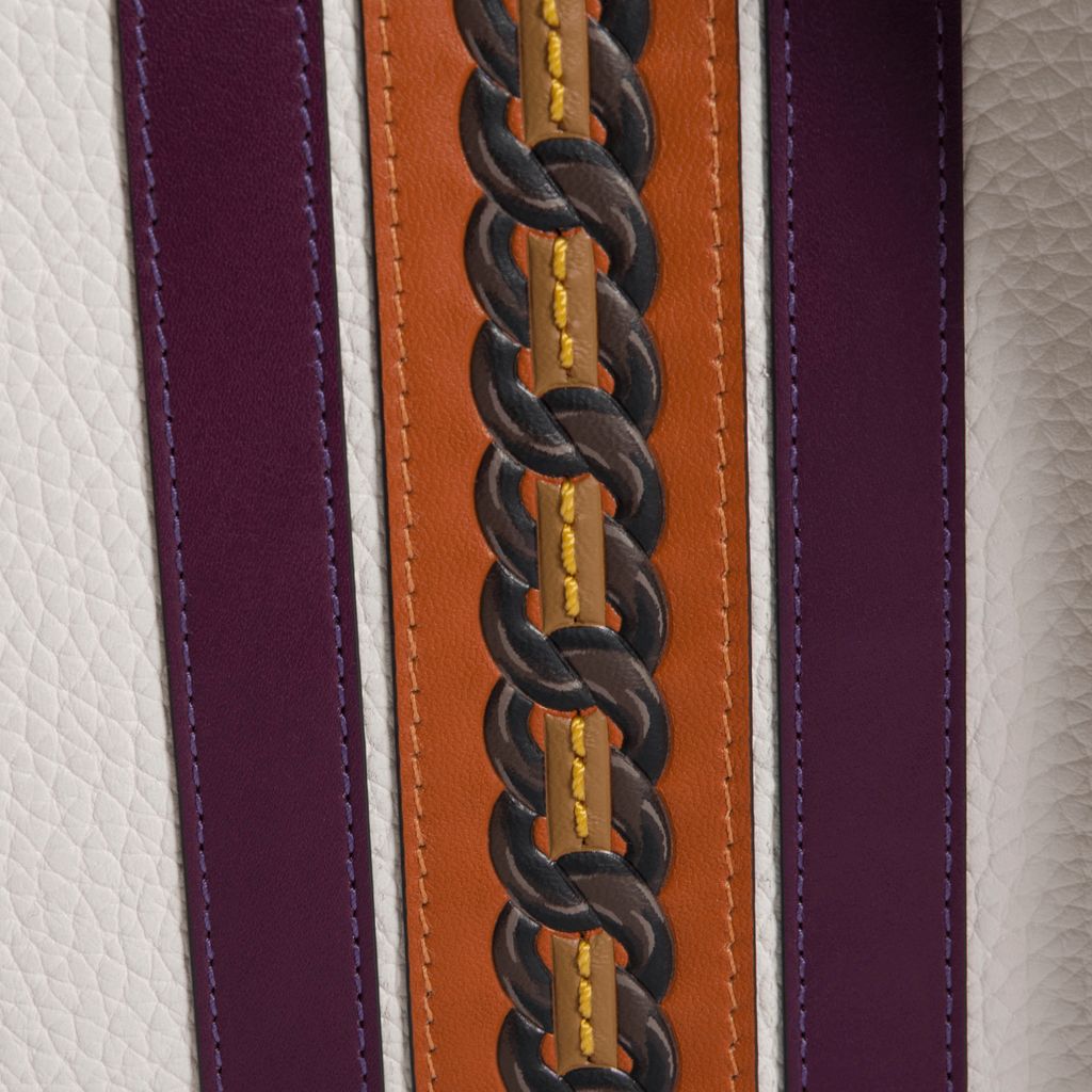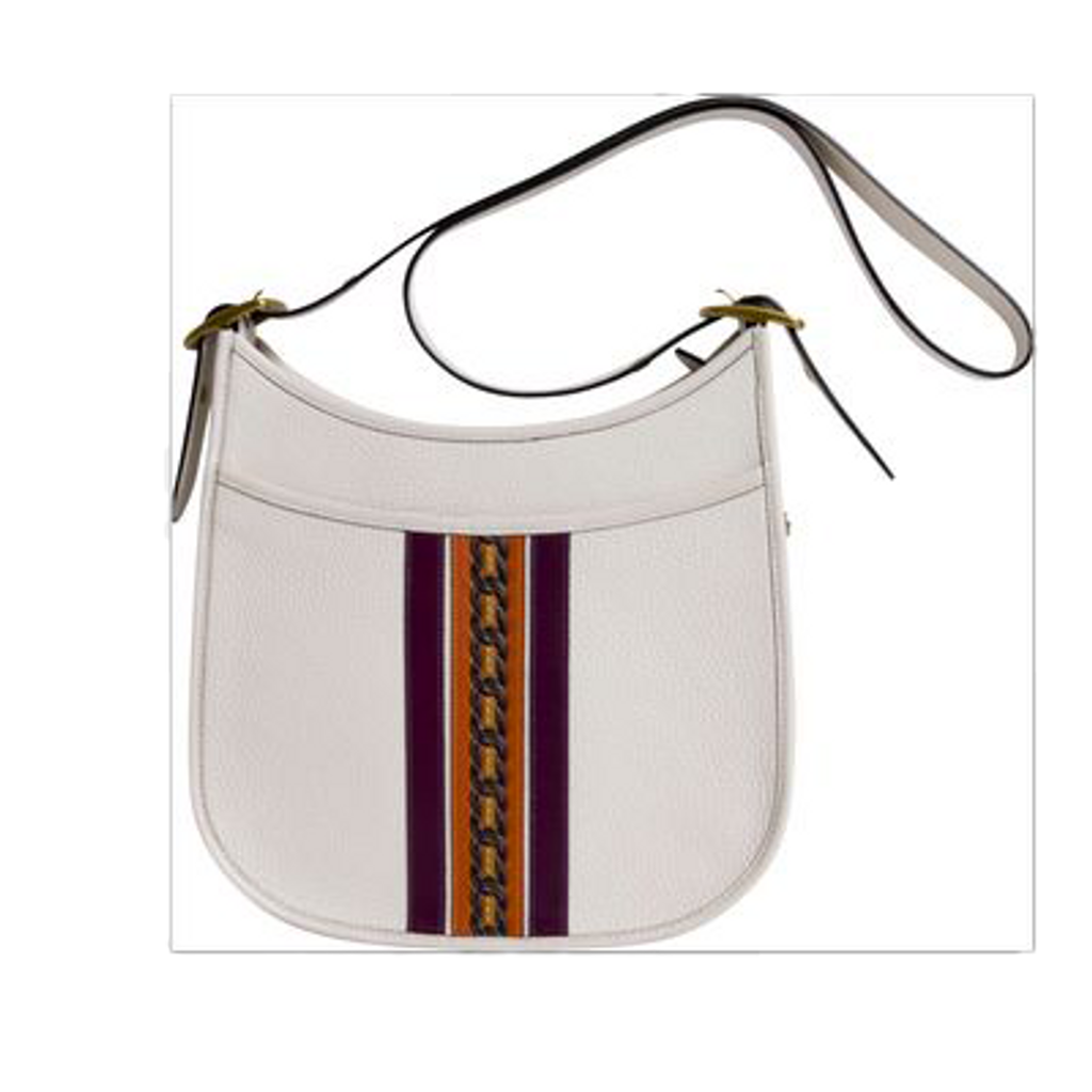 This natural pebble leather crossbody bag from Coach features a streamlined design and has two exterior pockets and spacious interior with more than enough room for your day to day essentials. Finished with a sporty varsity stripe detailed with the Coach curb chain motif and adjustable strap for shoulder or crossbody wear. In excellent condition.