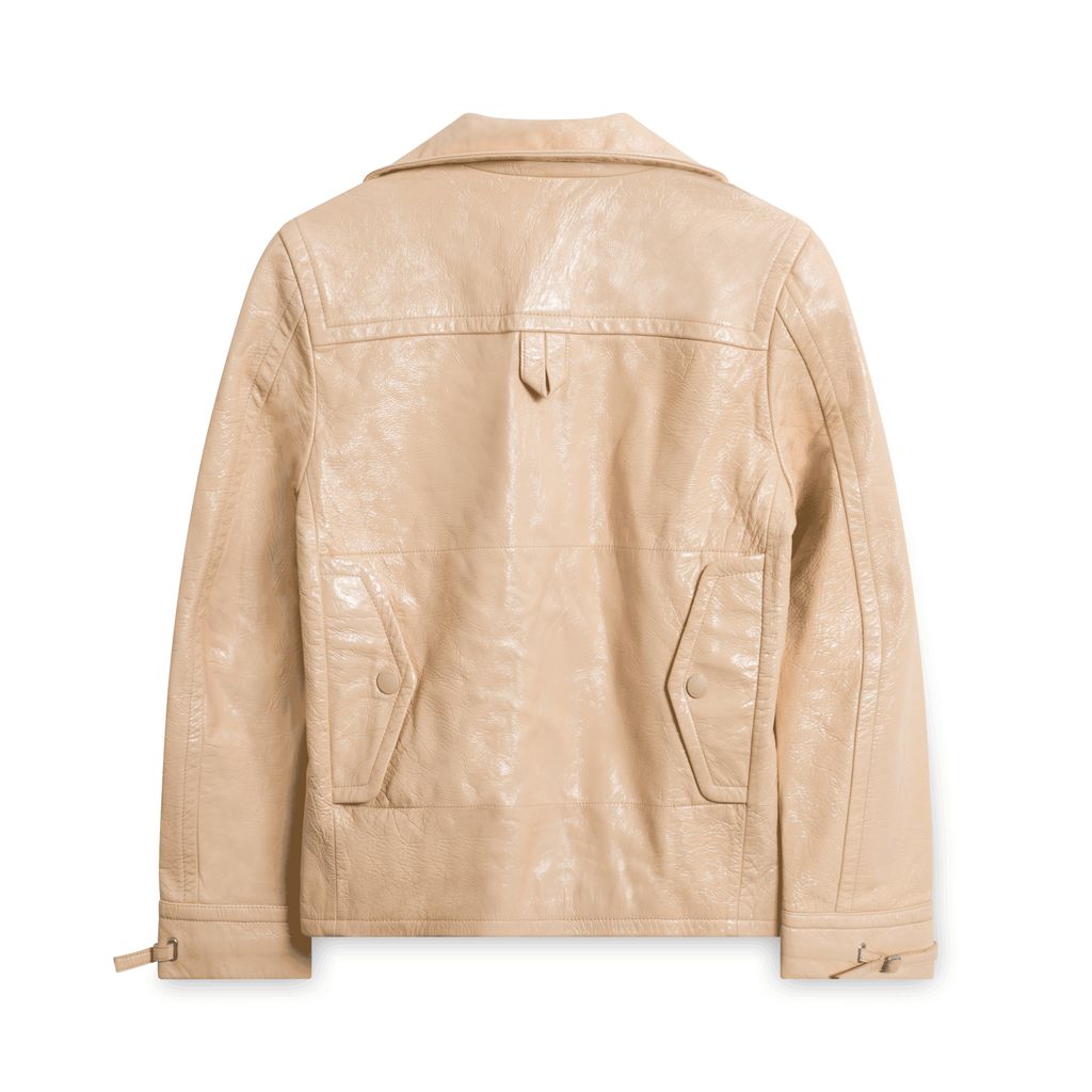 Coach Patent Leather Fireman Jacket in Sand features one chest pocket, dual waist pockets, button enclosures, and metal clasp at the chest. Backside features dual functional clasped pockets.