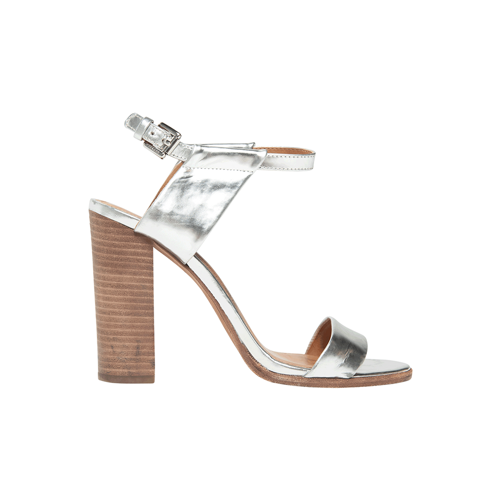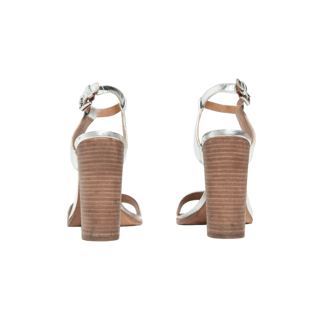 Coach Silver Block Heels features ankle strap, wooden block heel, and single toe strap.