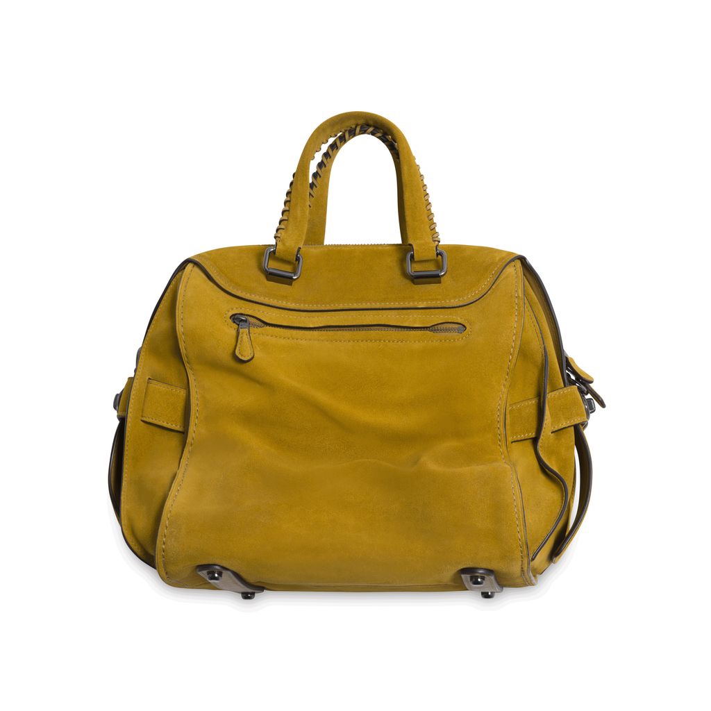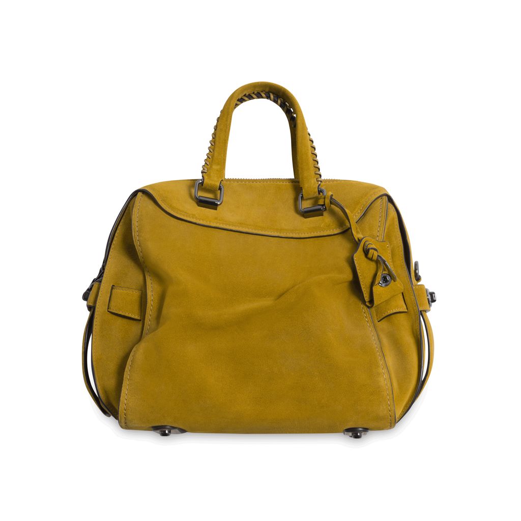 Tan duffle bag made with genuine glove-tanned suede. Embellished with silver hardware, this bag features a large adjustable inner pocket, two inner small side pockets, and exterior back pocket, genuine coach tags, and a removable shoulder strap.