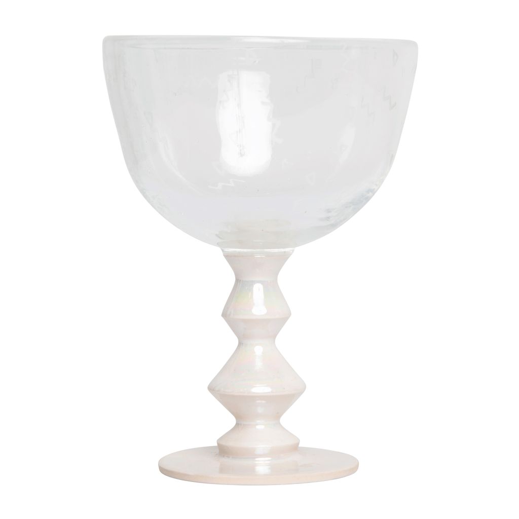Cocktail Glass 003 is a collaboration piece with Rebacca Price. Upper is hand blown glass with etched designs, lower is hand thrown stem finished with mother of pearl luster. hand wash.