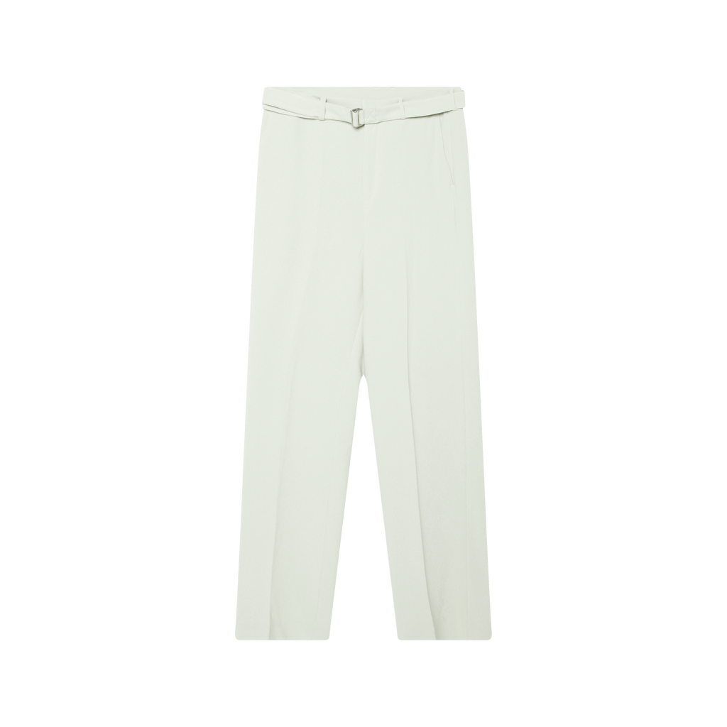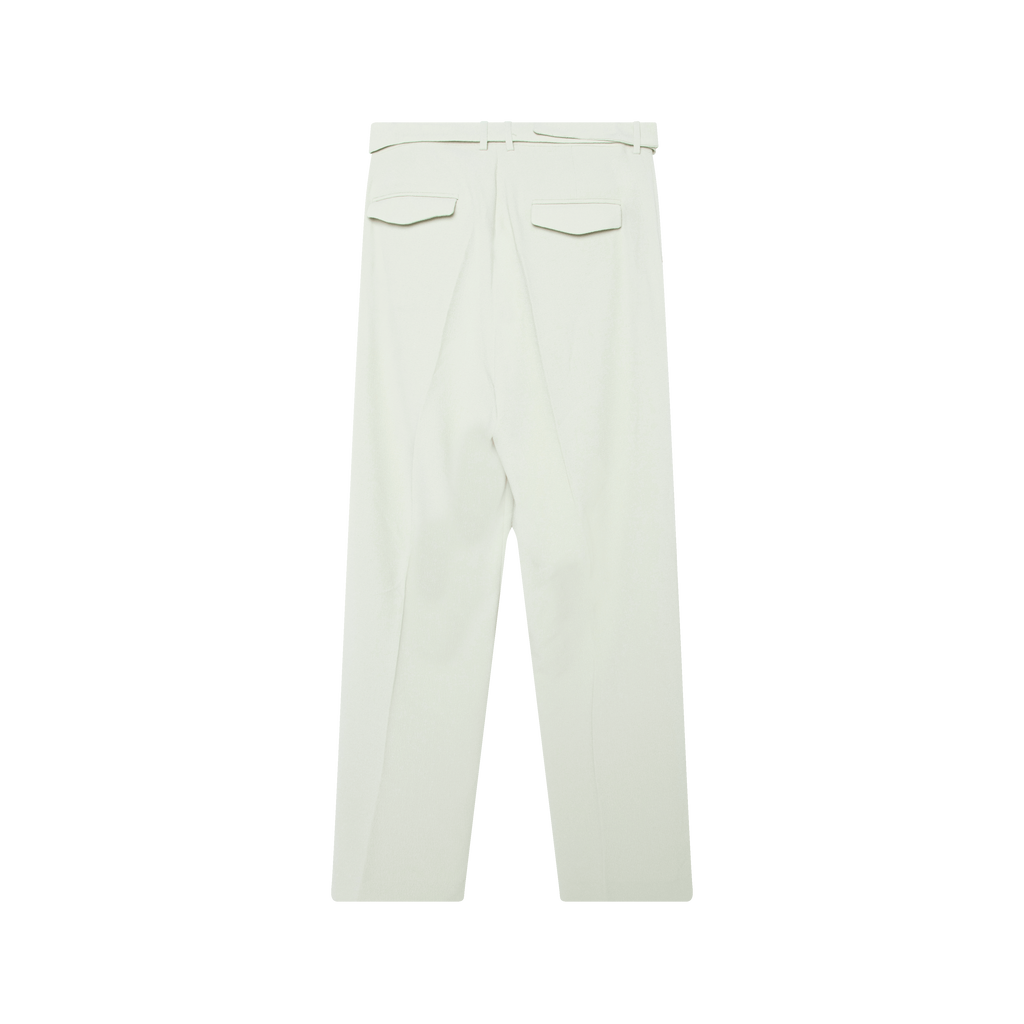 Cold Laundry Green Belted Trousers features removable belt with silver hardware, front zip and hook and eye closure, welted back pockets, and single pleat down front.