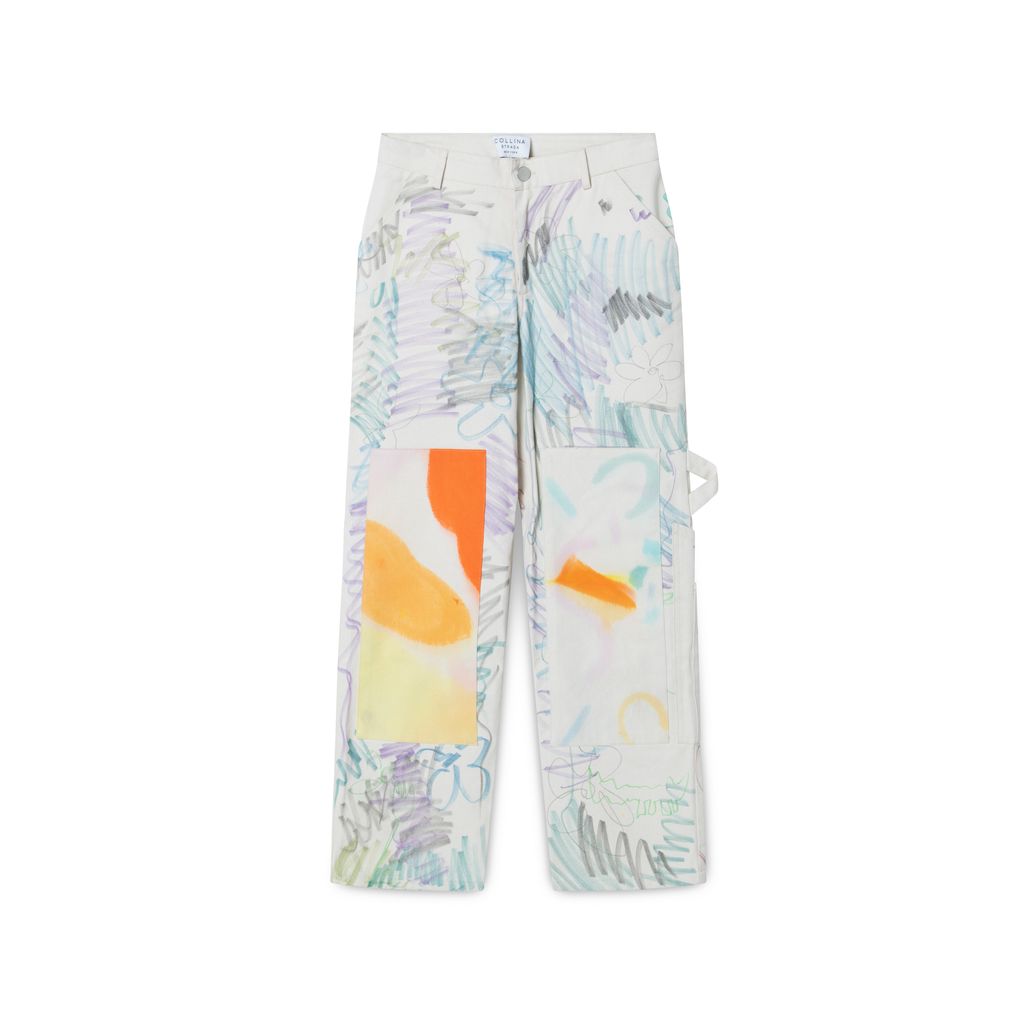 Workwear pant with contrasting knee patches, side pockets, and hammer loop. Mid-rise.