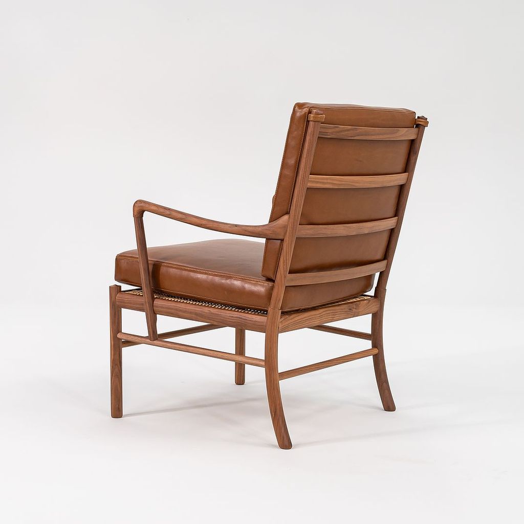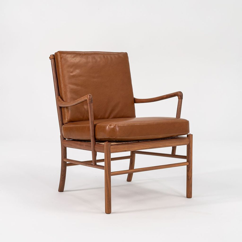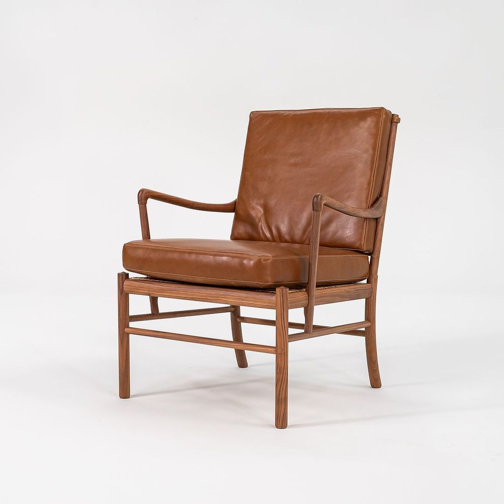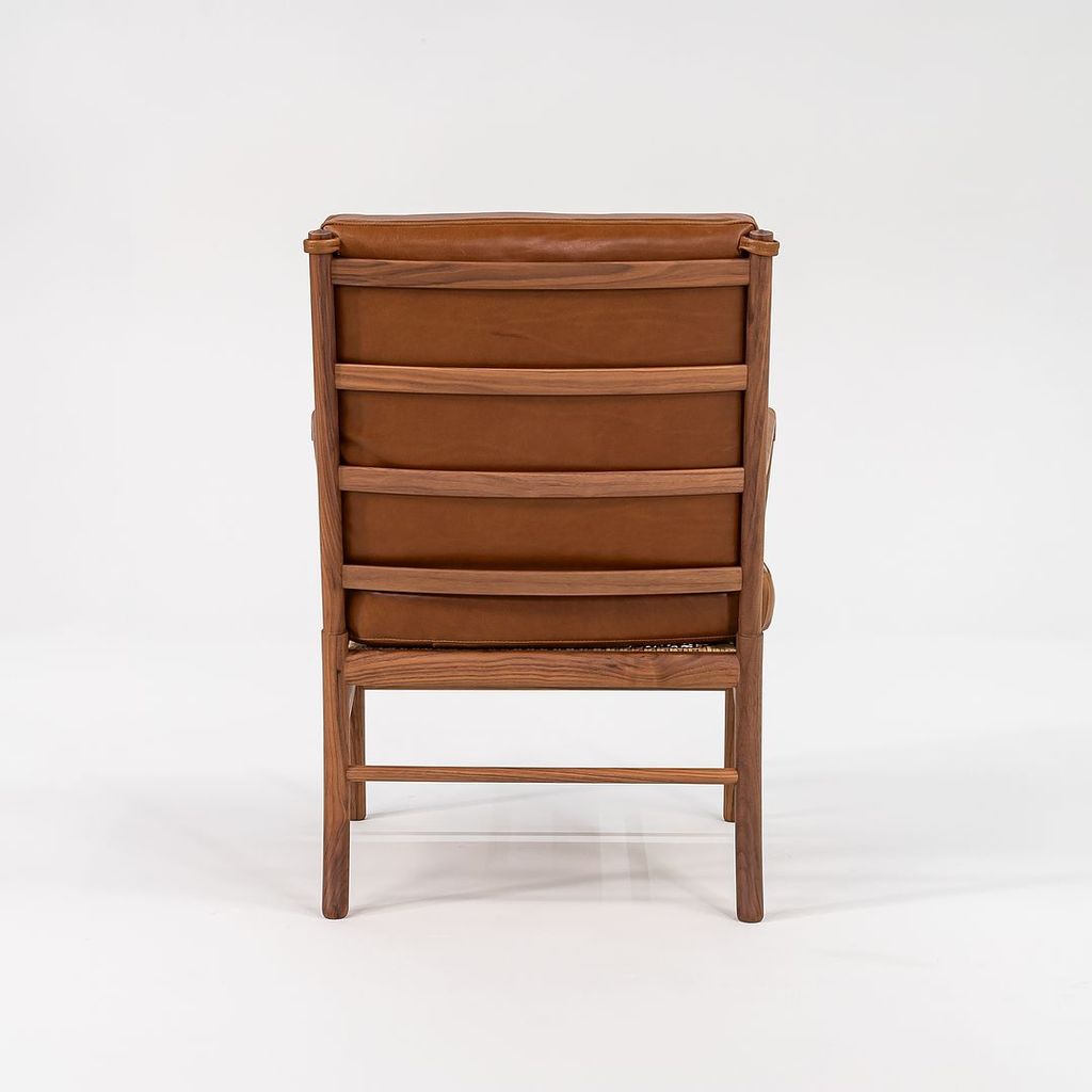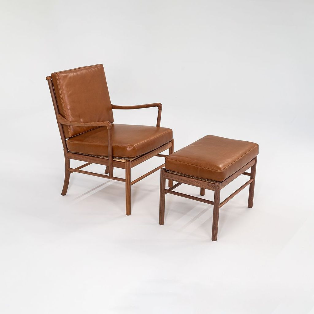 This is a Colonial Chair, model OW149, and coordinating Colonial Footstool model OW149F, designed by Ole Wanscher and produced by Carl Hansen & Son in Denmark. The design features a solid walnut frame and has been freshly upholstered in thick saddle brown Italian leather. The set dates to circa 2022 and is guaranteed as authentic.