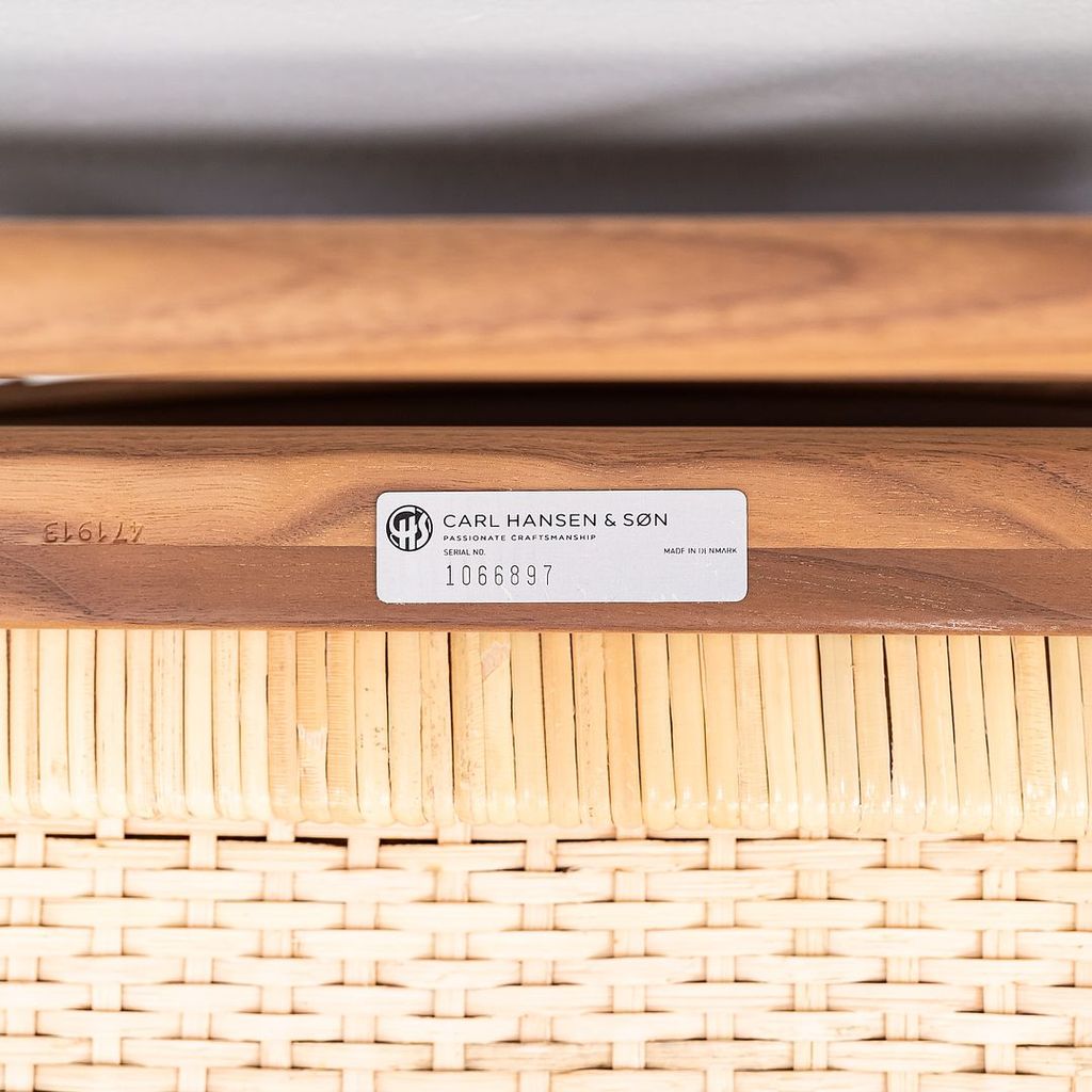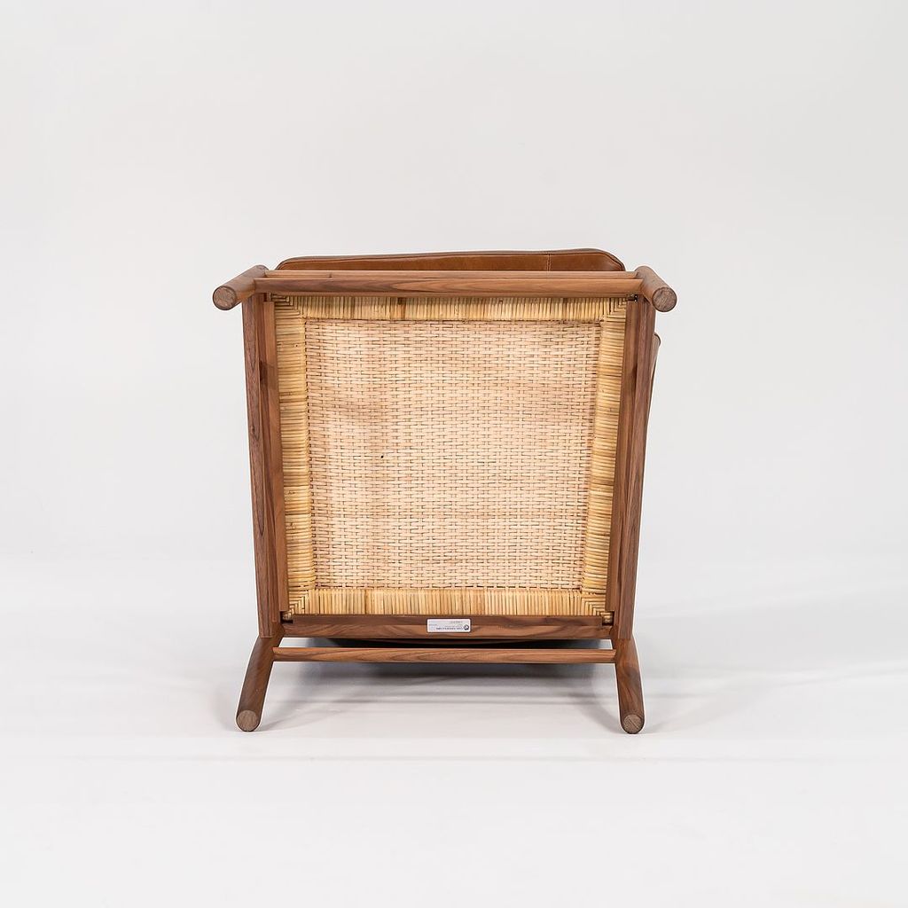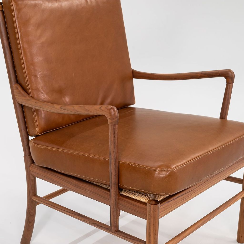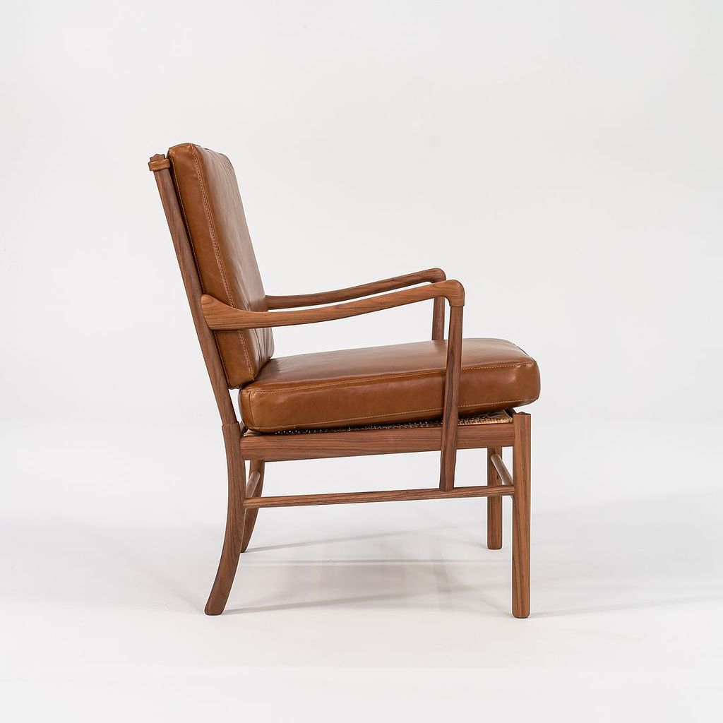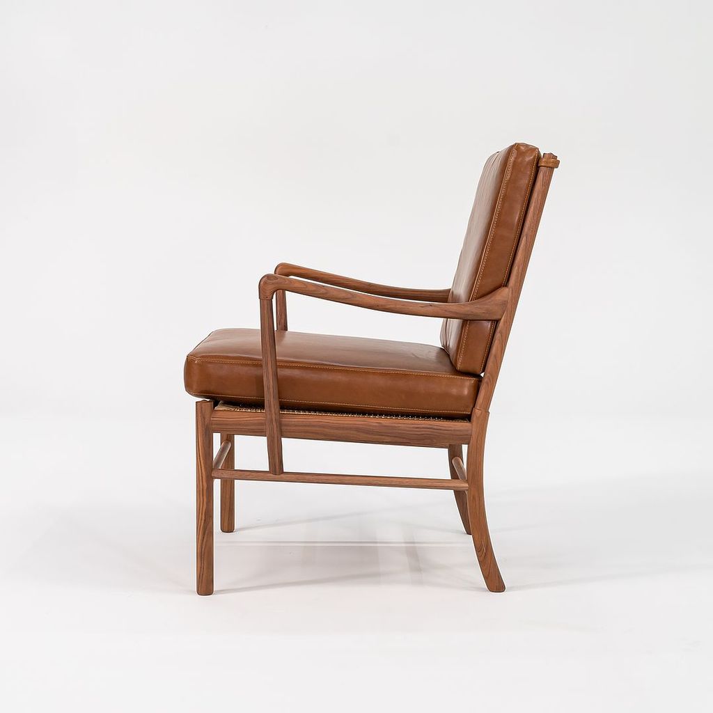 This is a Colonial Chair, model OW149, and coordinating Colonial Footstool model OW149F, designed by Ole Wanscher and produced by Carl Hansen & Son in Denmark. The design features a solid walnut frame and has been freshly upholstered in thick saddle brown Italian leather. The set dates to circa 2022 and is guaranteed as authentic.